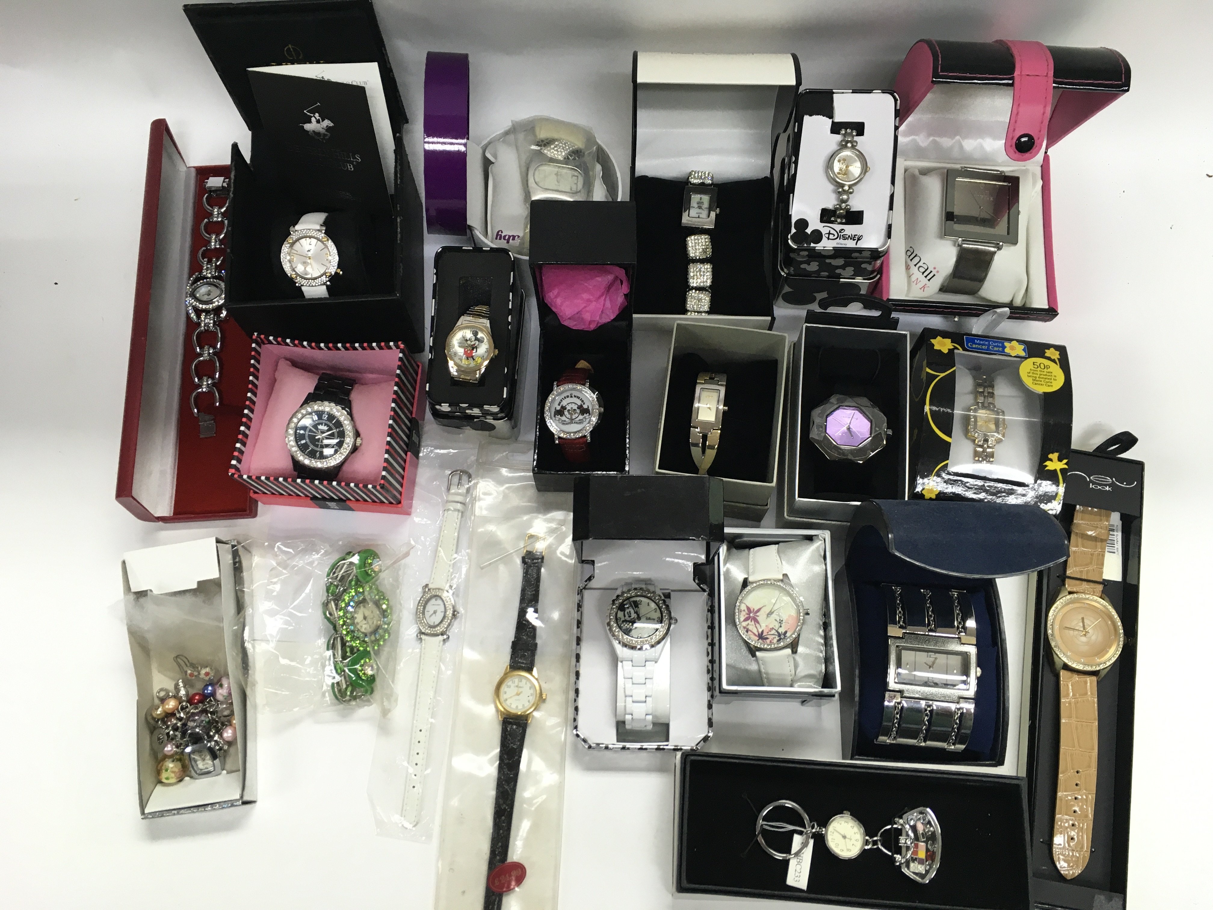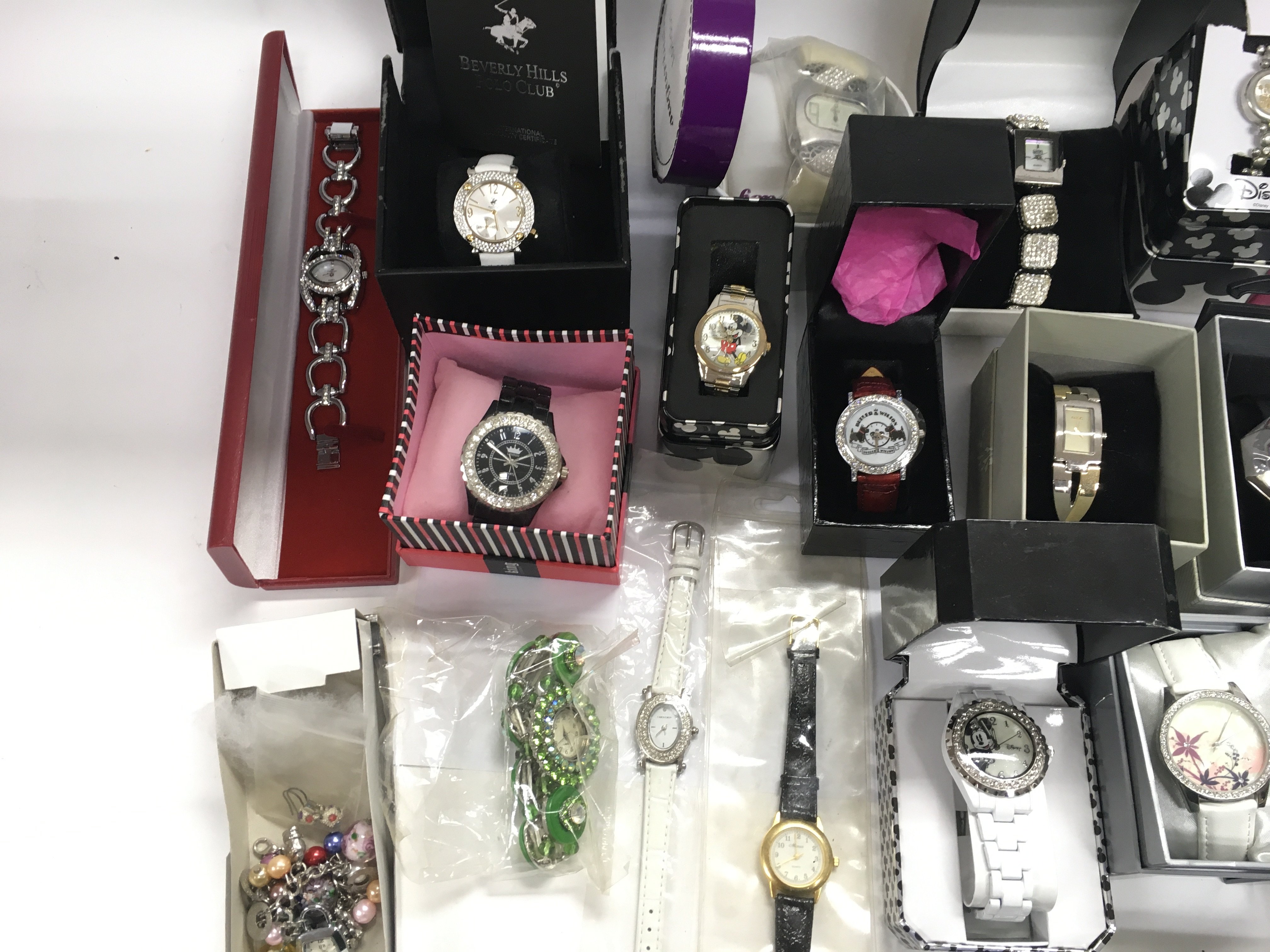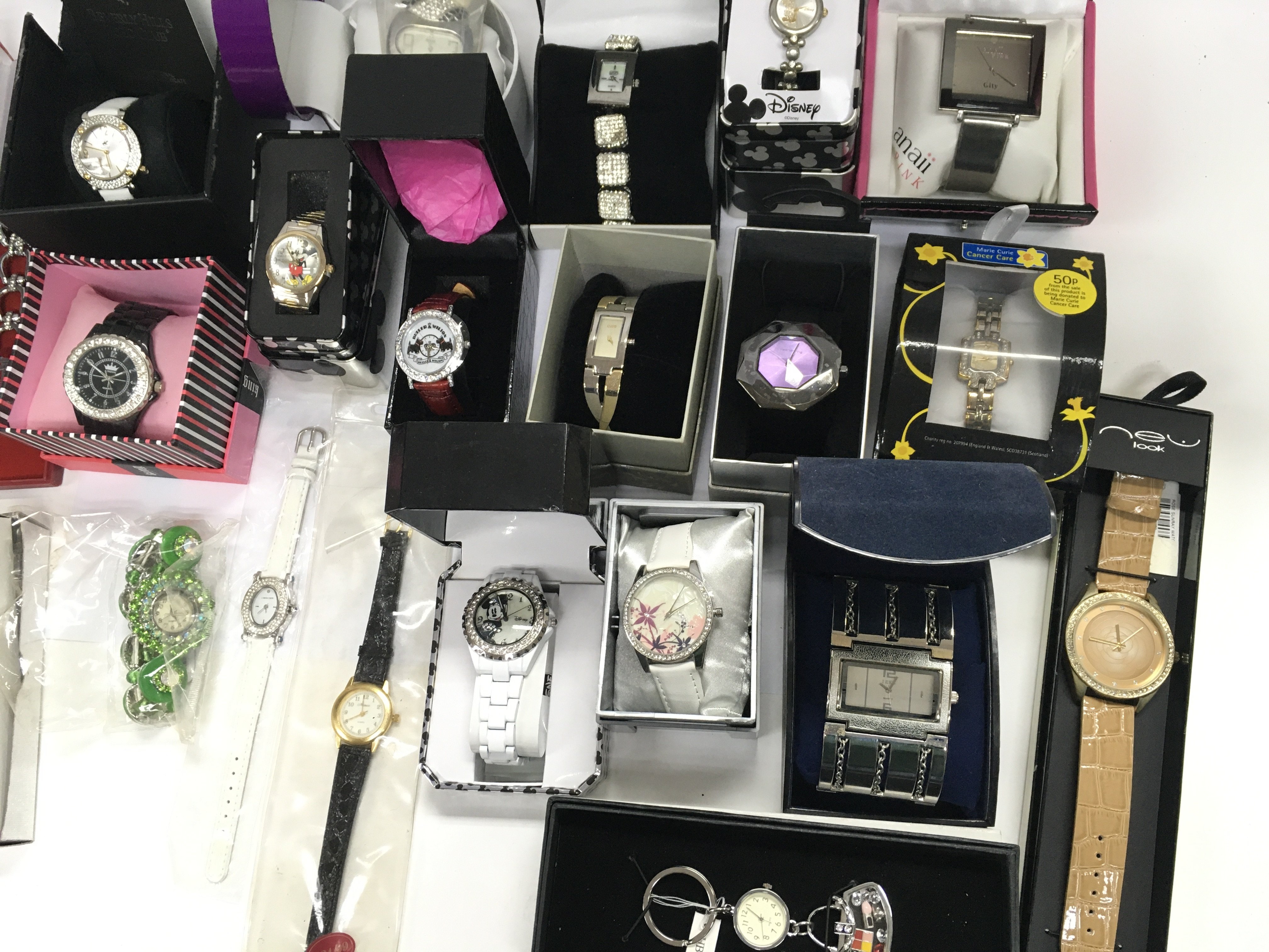 A large collection of assorted fashion watches many boxed including Disney. Postage B