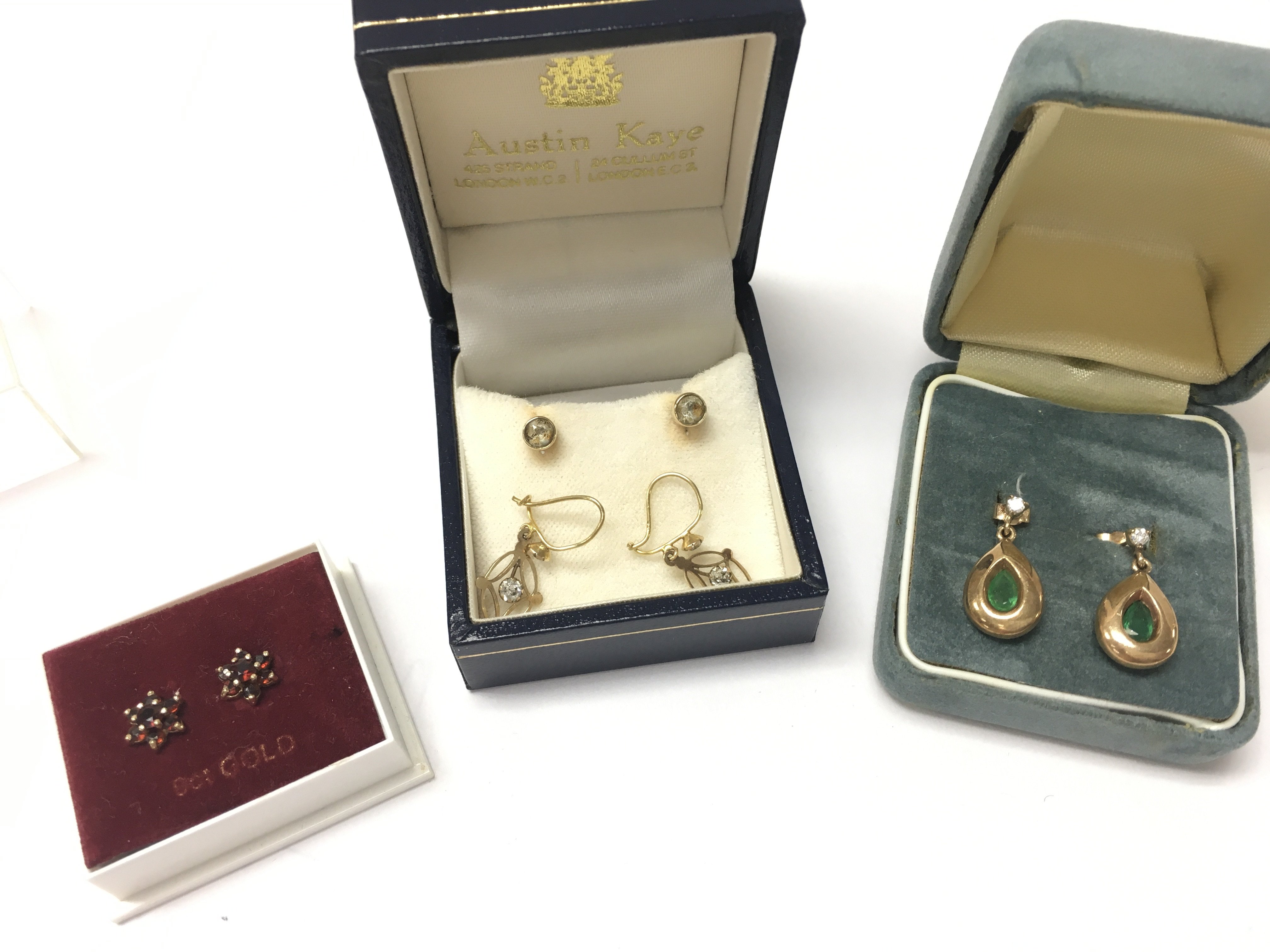 A Collection of gold earrings including emerald and diamond, diamond studs etc. 5.9g total weight. Postage category A