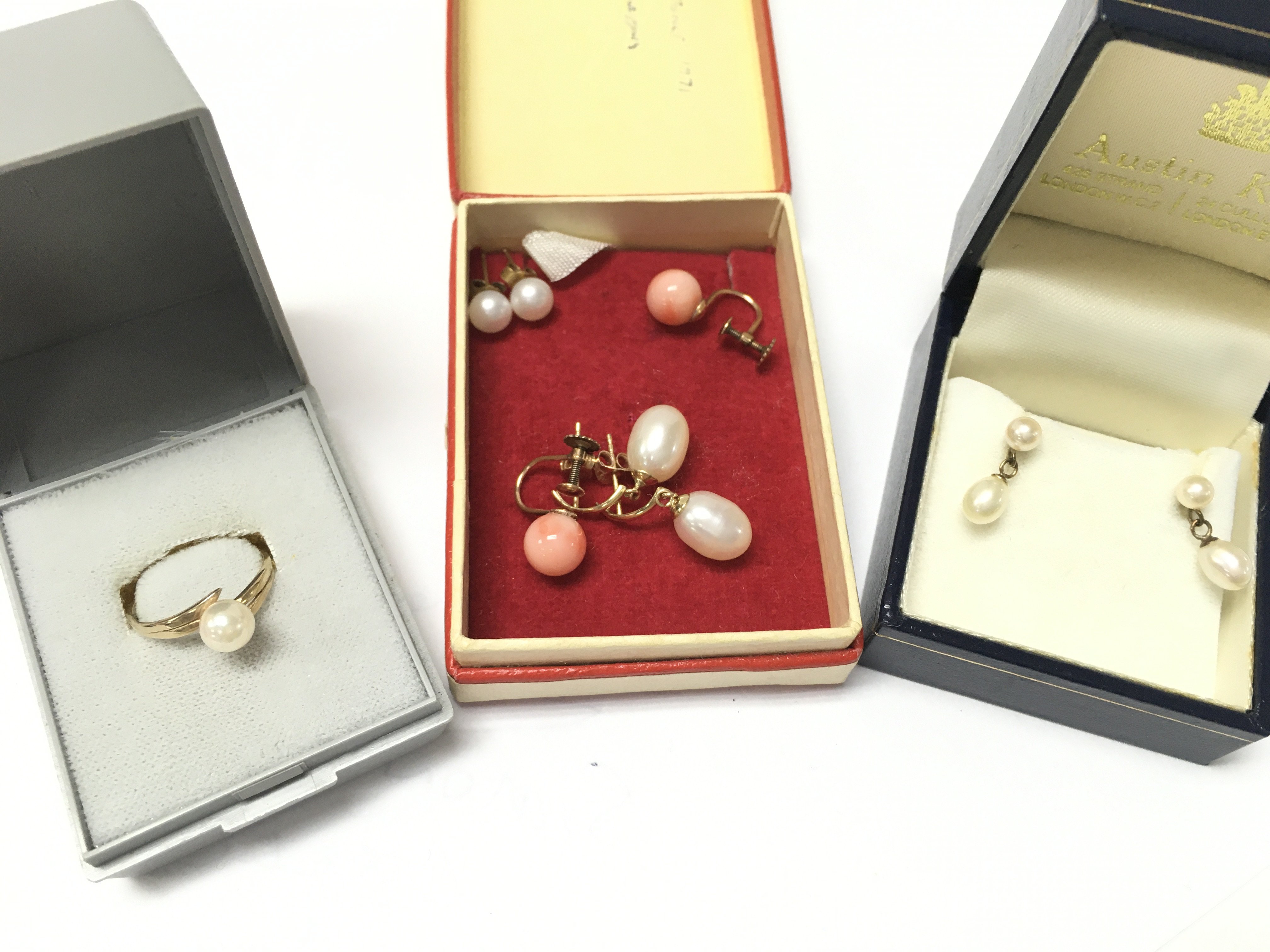 9ct gold and pearl earrings, coral screw earrings and a 9ct pearl ring. total weight 7.9g. Postage category A