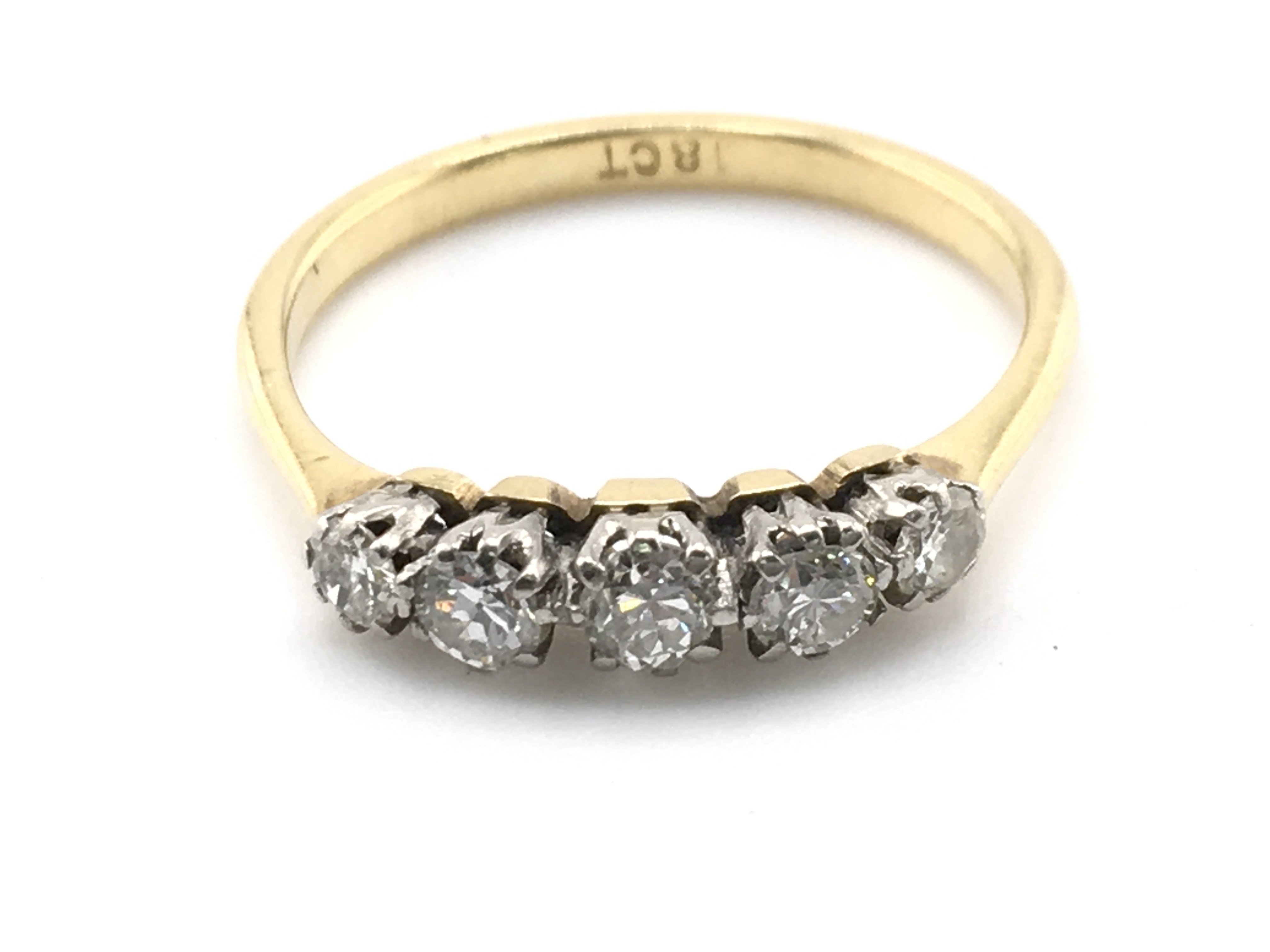 A 5 stone graduated 18ct gold ring. Size R and 2.68gPostage A