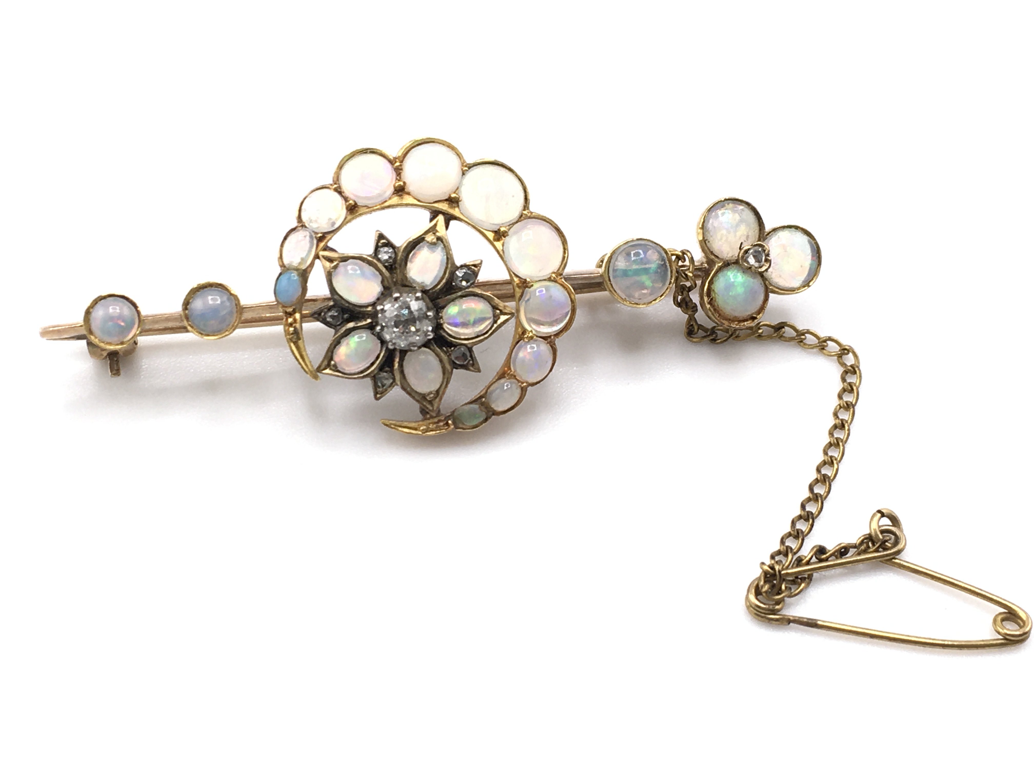 An Edwardian opal and diamond crescent moon and flower brooch. High carat gold.Postage A