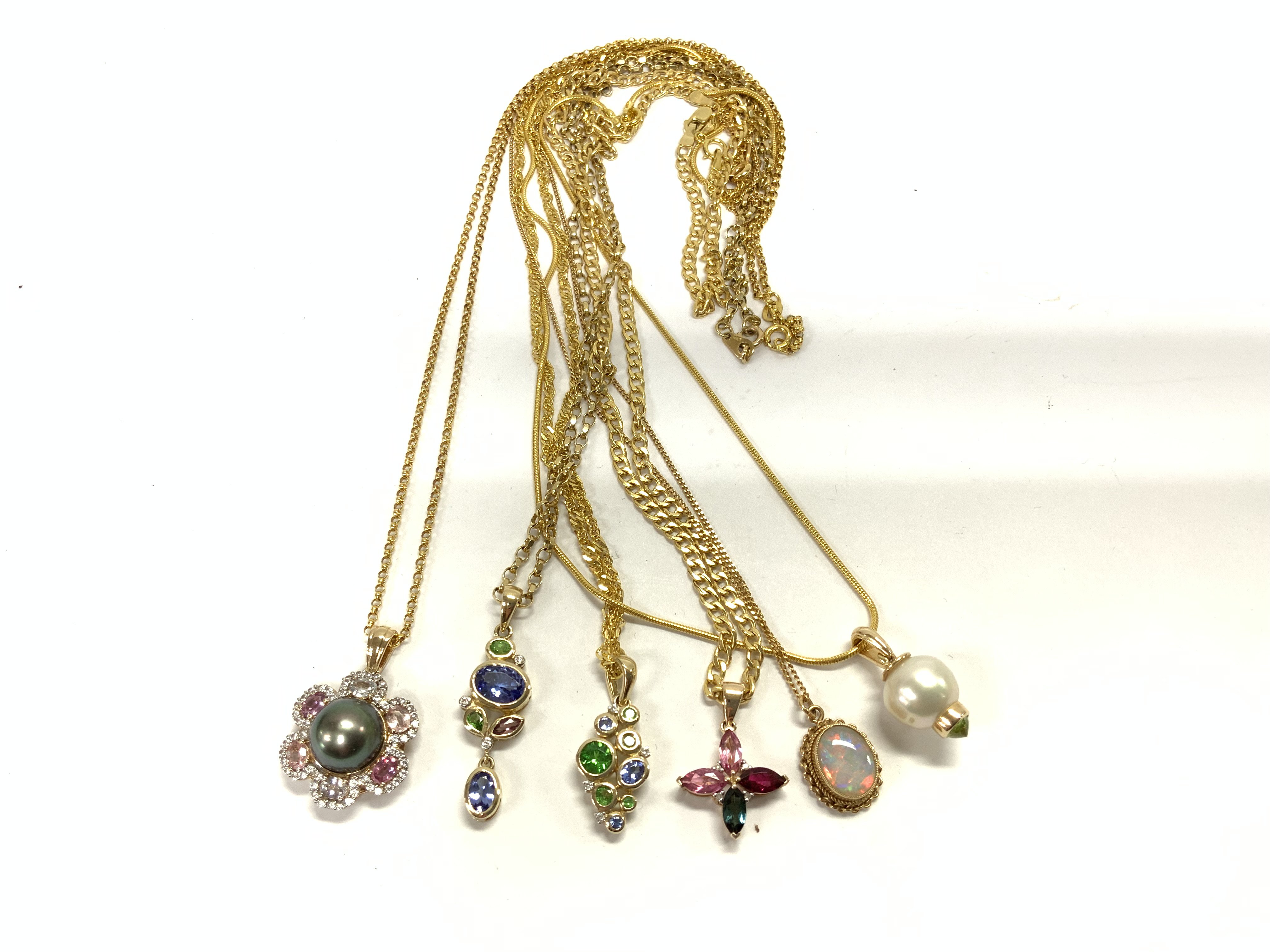 5 9ct gold and stone set pendants and chains. Total weight. 37.4g (A)