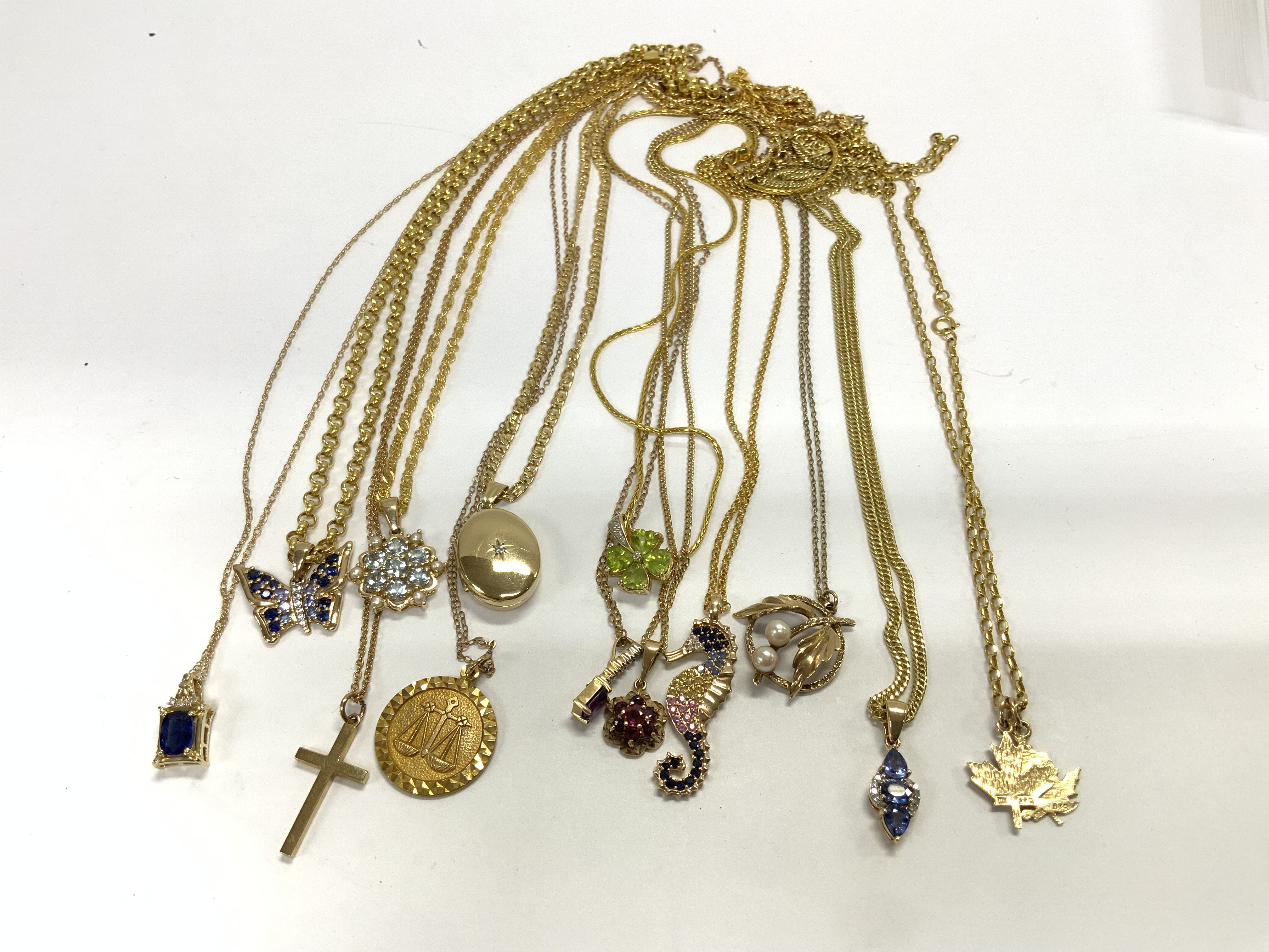 13 9ct gold and stone set pendants and chains. Total weight. 60g (A)