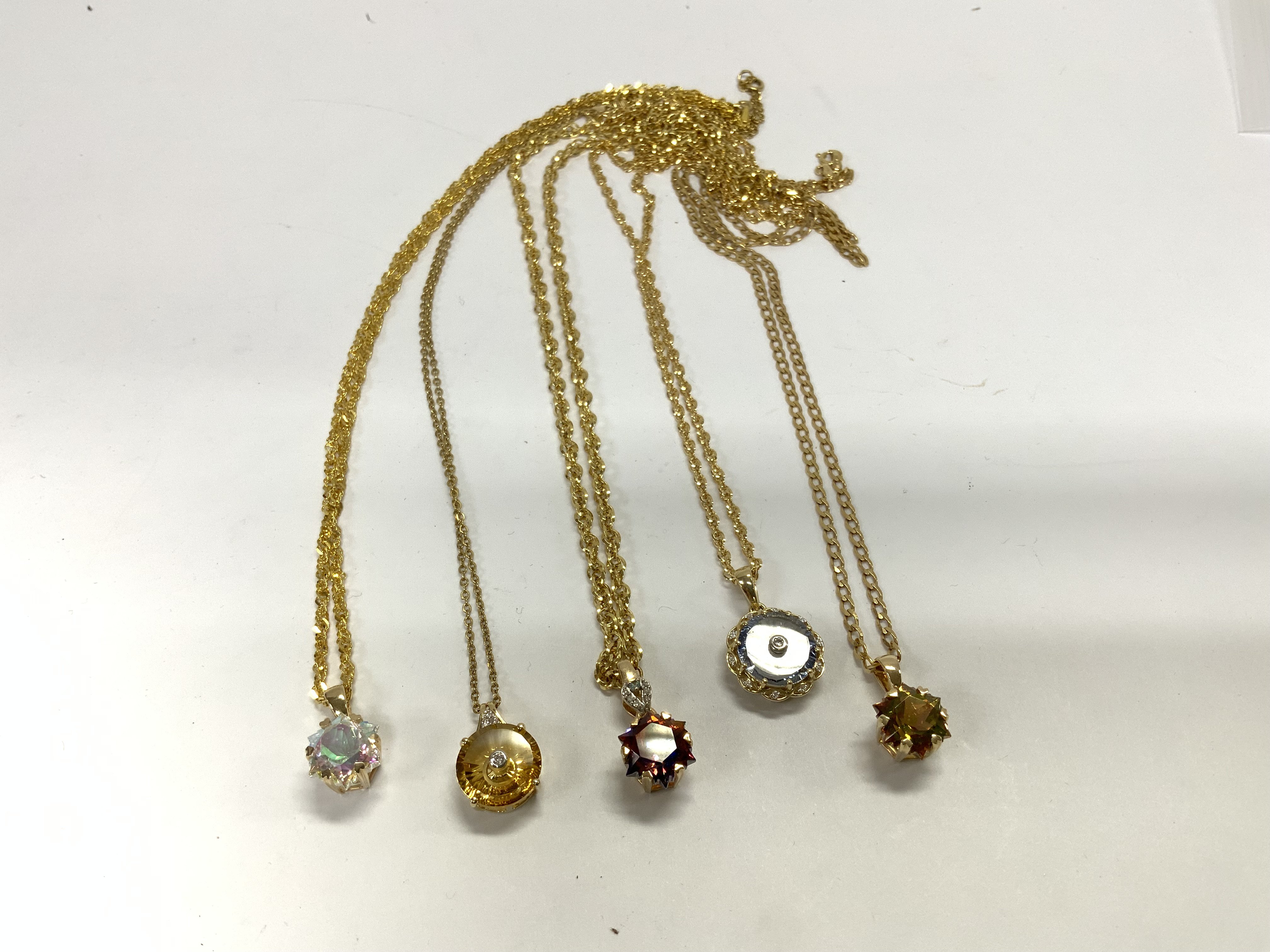 5 9ct gold and stone set pendants and chains. Total weight. 27.7g (A)