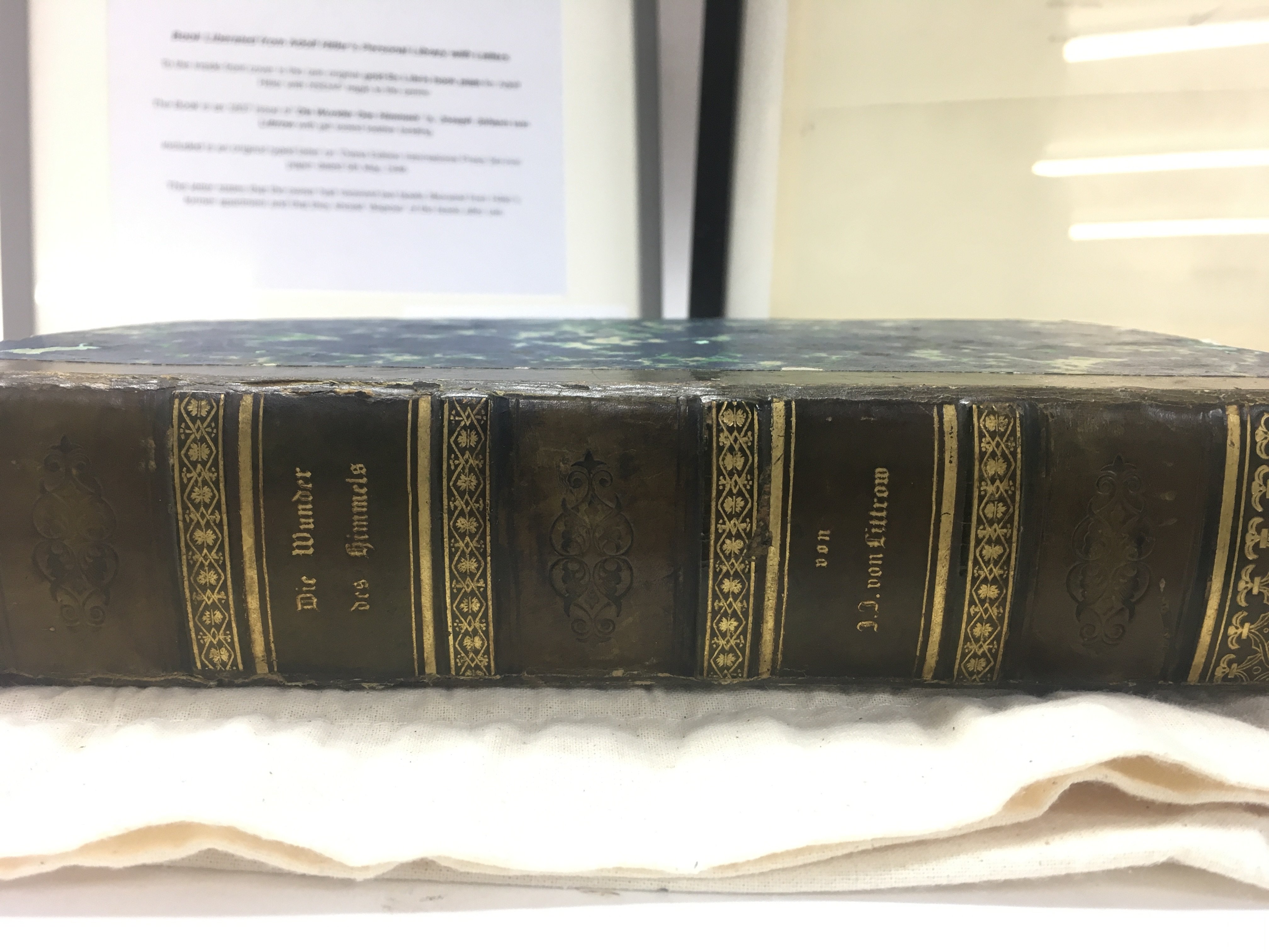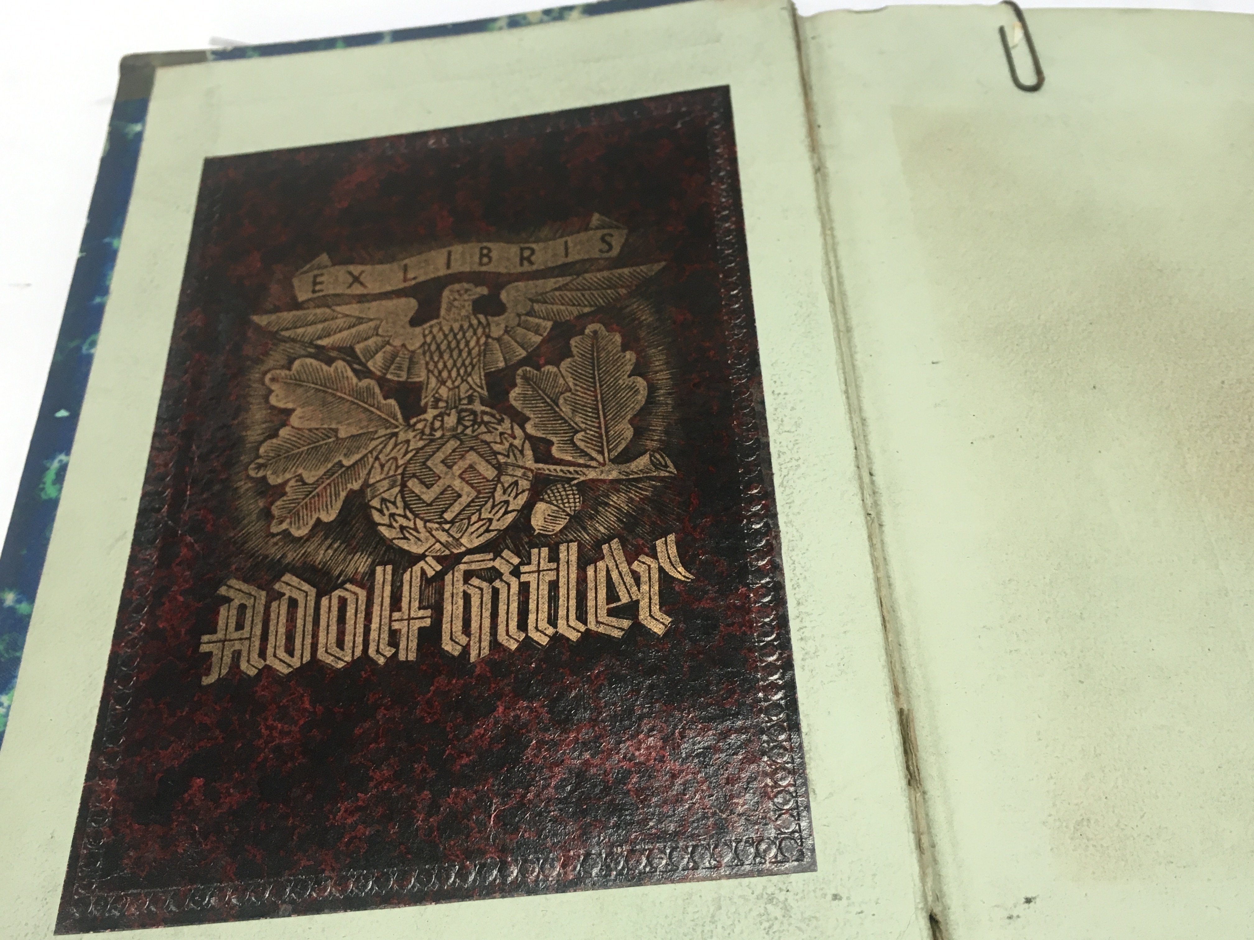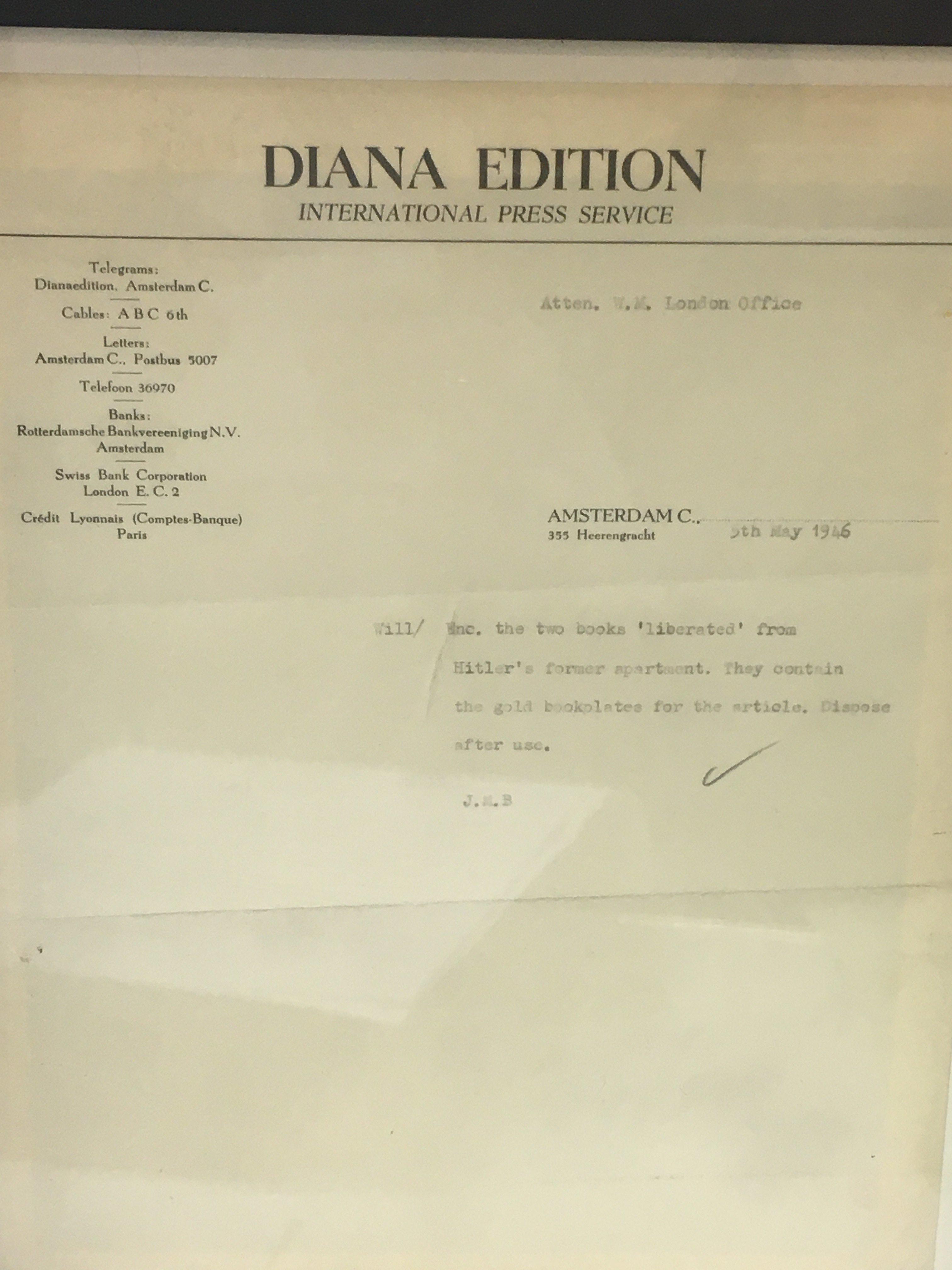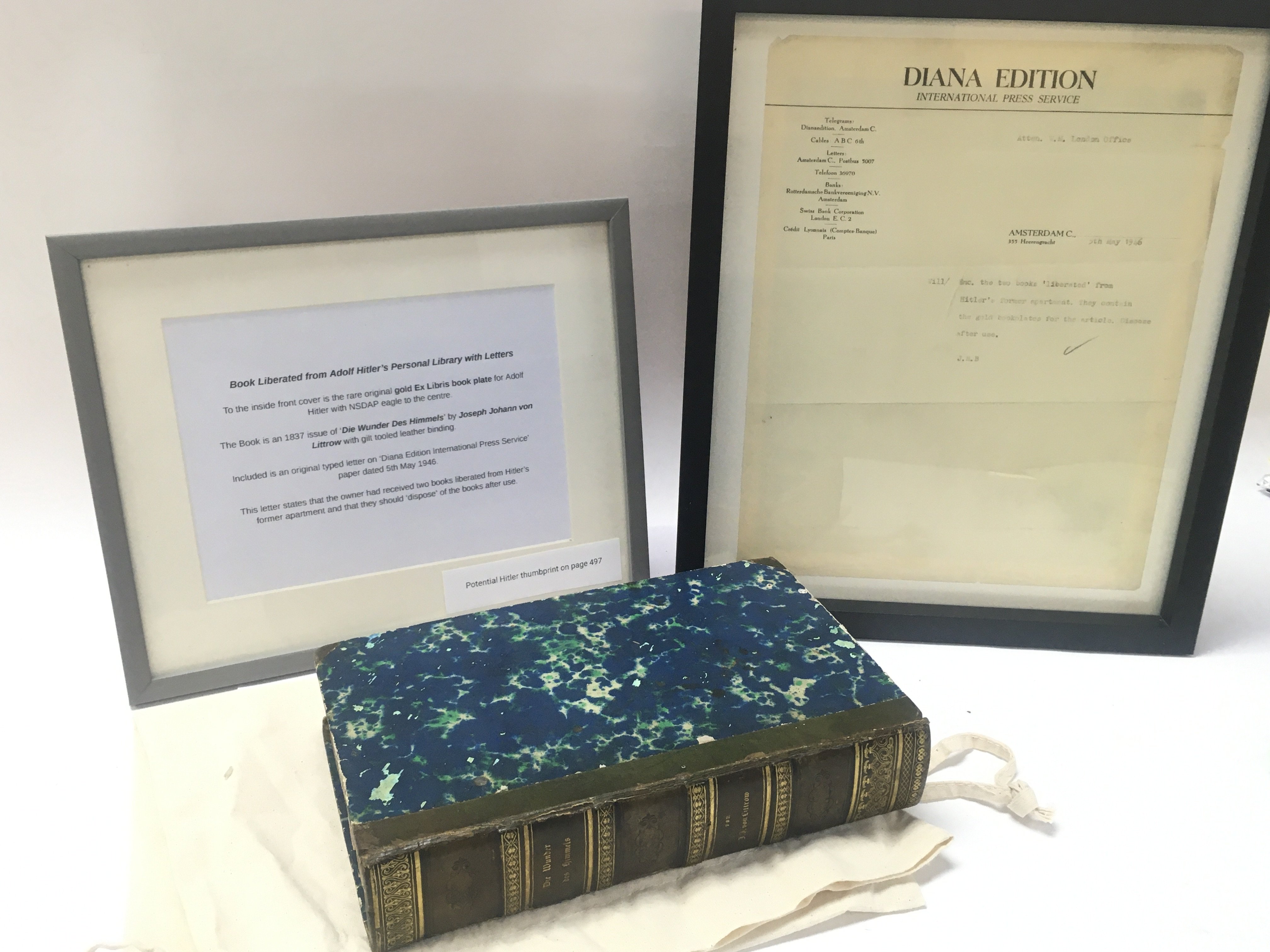 WW2 German Military Interest: A Leather Bound Book Liberated from Adolf Hitler's Personal Library. This 1837 copy of 'Die Wunder Des Himmels' by Joseph Johann Von Littrow has a rare gold coloured Ex Libris book plate for Adolf Hitler with NSDAP eagle to the centre. Included is an original typed letter on 'Diana Edition International Press Service' paper dated 5th May 1946 stating that the owner has received two books liberated from Hitler's former apartment and that they should dispose of the books after use. This lot is presented in a custom wooden case.