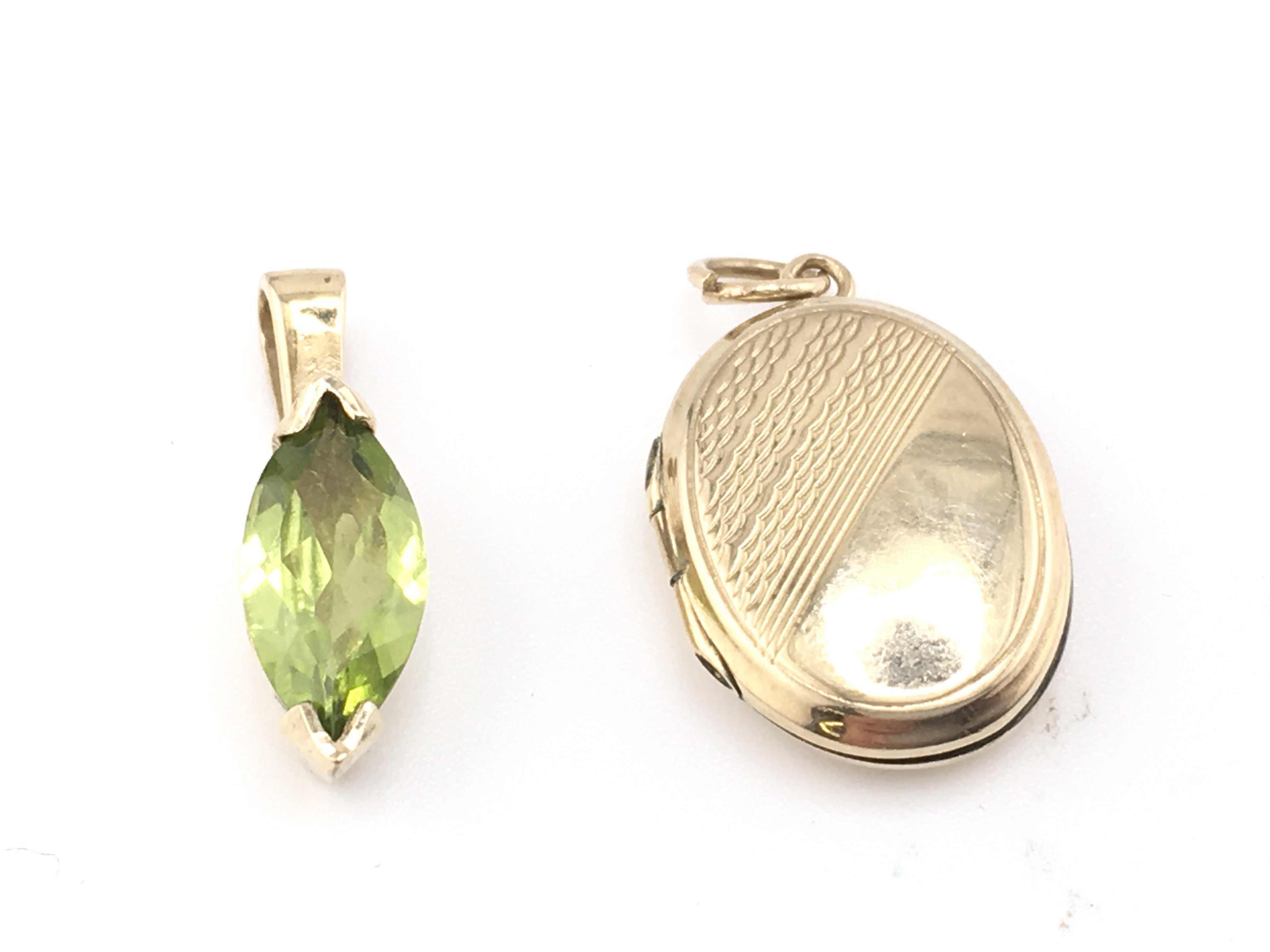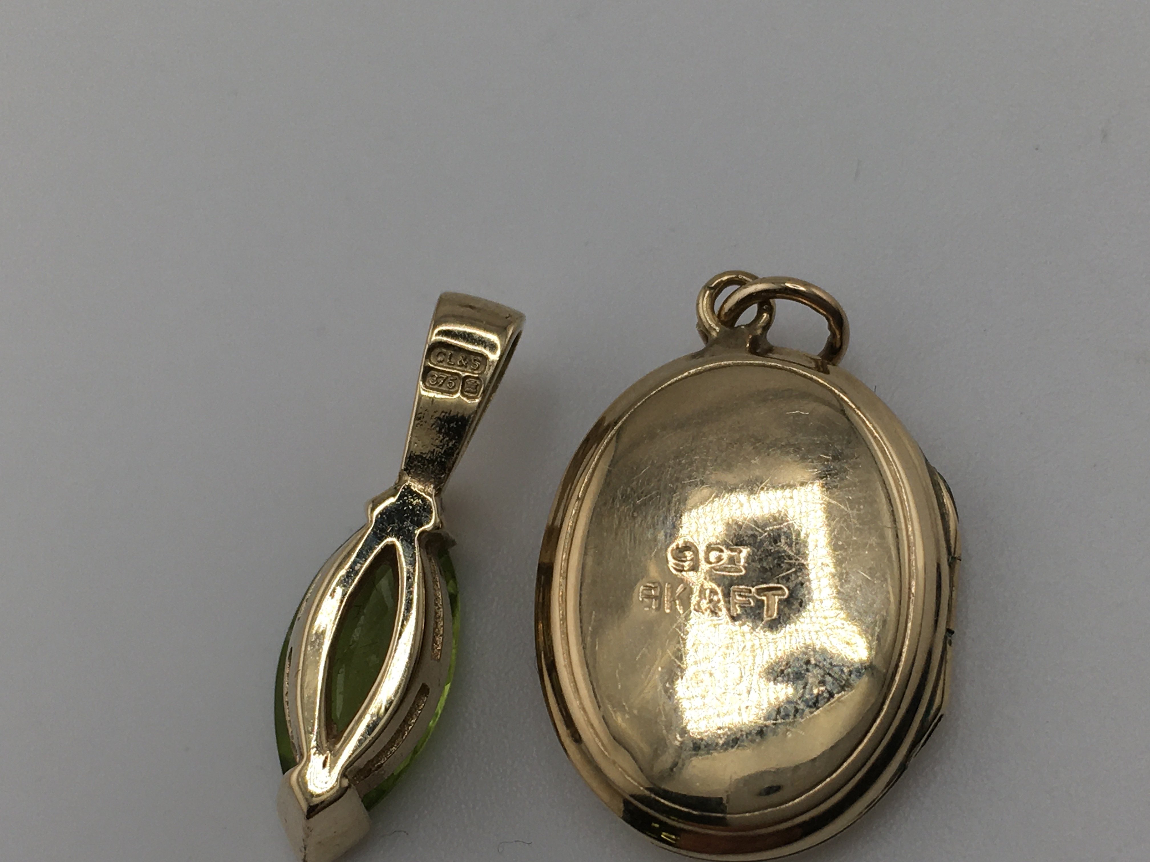 A 9ct gold pendant set with green stone and a 9ct back and front locket. Postage A NO RESERVE