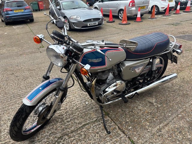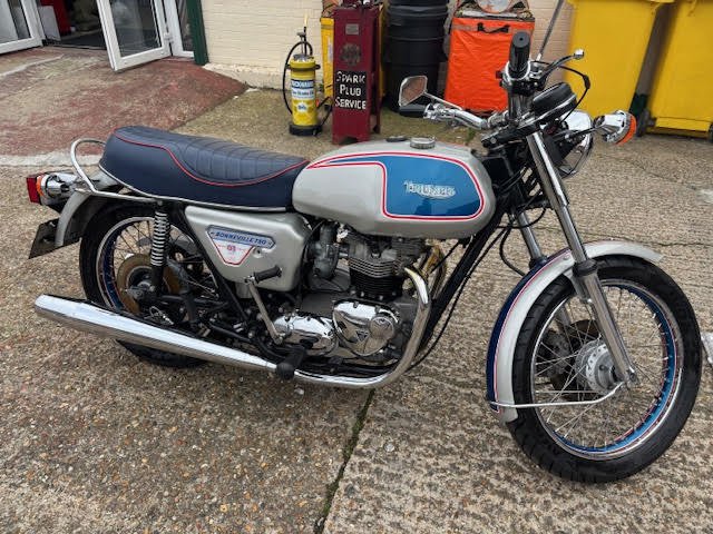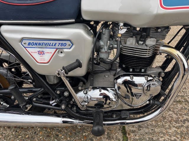 1977 Triumph T140v Bonneville Queens Silver Jubilee Limited Edition - The final phase of the Triumph twin's development began in 1972 with the first appearance of the new 750cc version of the Bonneville. Other improvements included a new ten-stud cylinder head, triplex primary chain, stronger transmission, and a disc front brake. A five-speed gearbox was standard equipment on the 750. In 1977 Triumph introduced a special, limited edition Bonneville to celebrate HM Queen Elizabeth II's Silver Jubilee. This was basically the standard Bonnie enhanced by a red, white, and blue on silver finish, coachlined cycle parts, and a chromed timing cover and primary chain case. This example of one of the more collectible of later Bonnevilles, having recently benefitted from full restoration the bike is offered with V5, Keys and some historic paperwork