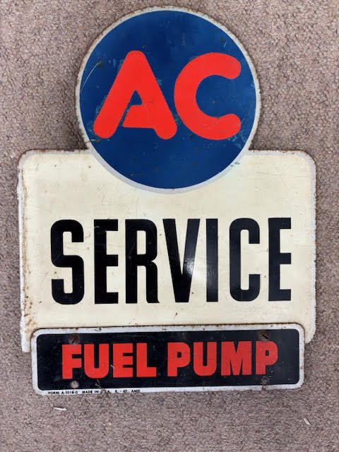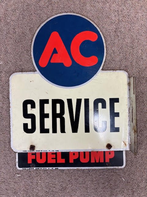 An AC Service double sided aluminium sign with hanging flange, with 'Fuel Pump' tag sign applied, made in USA, 10 3/4" x 13 1/2".