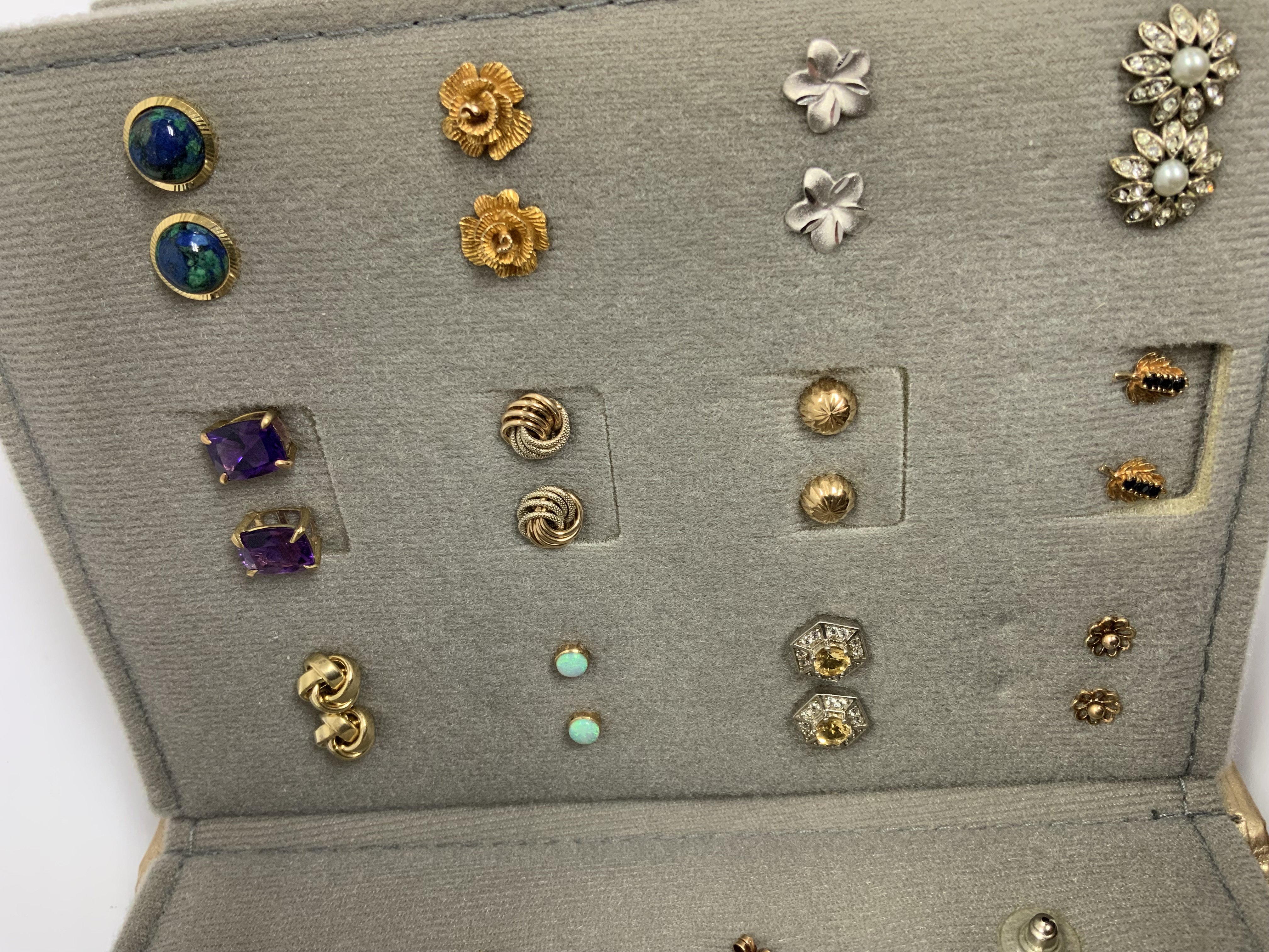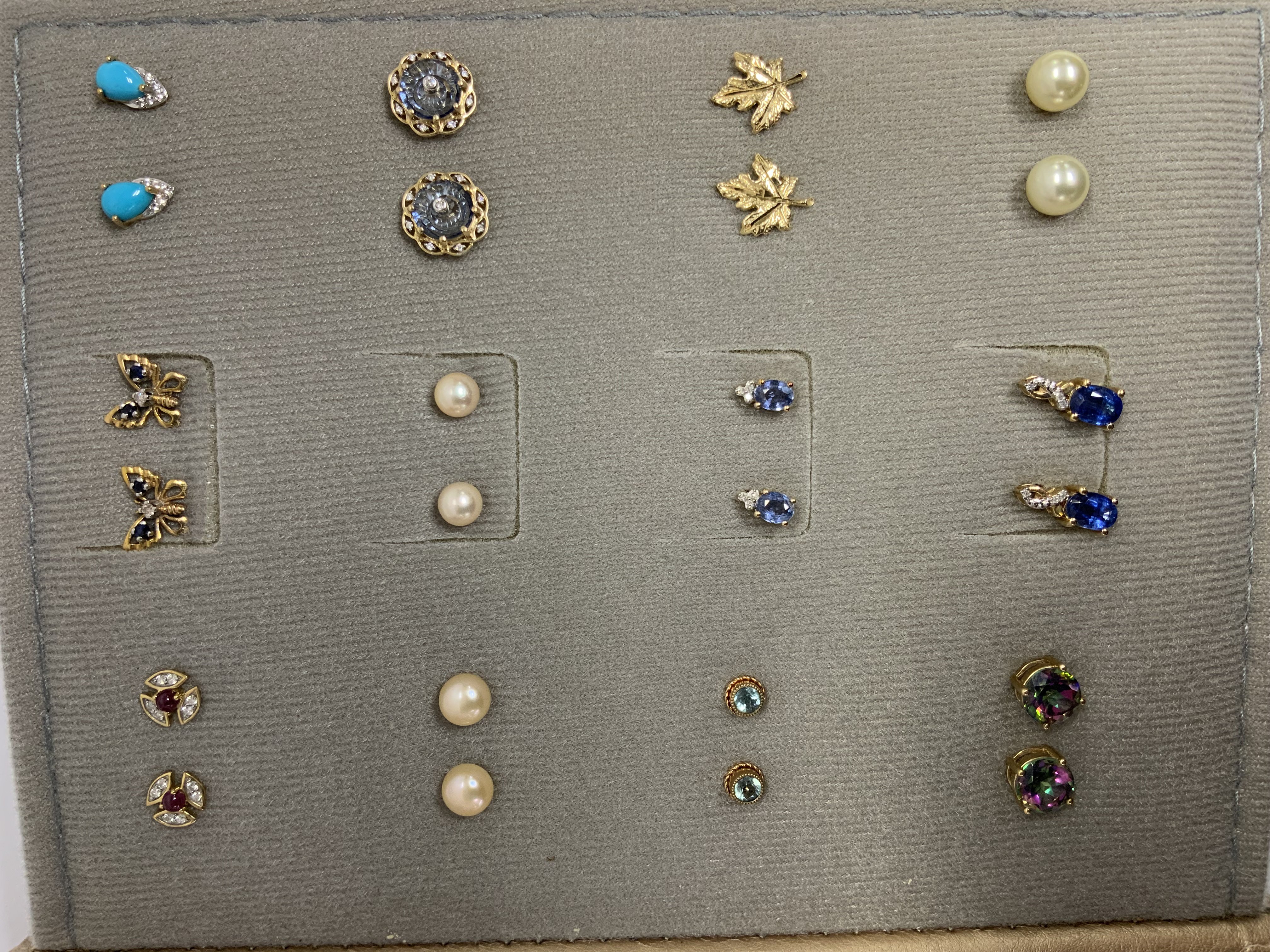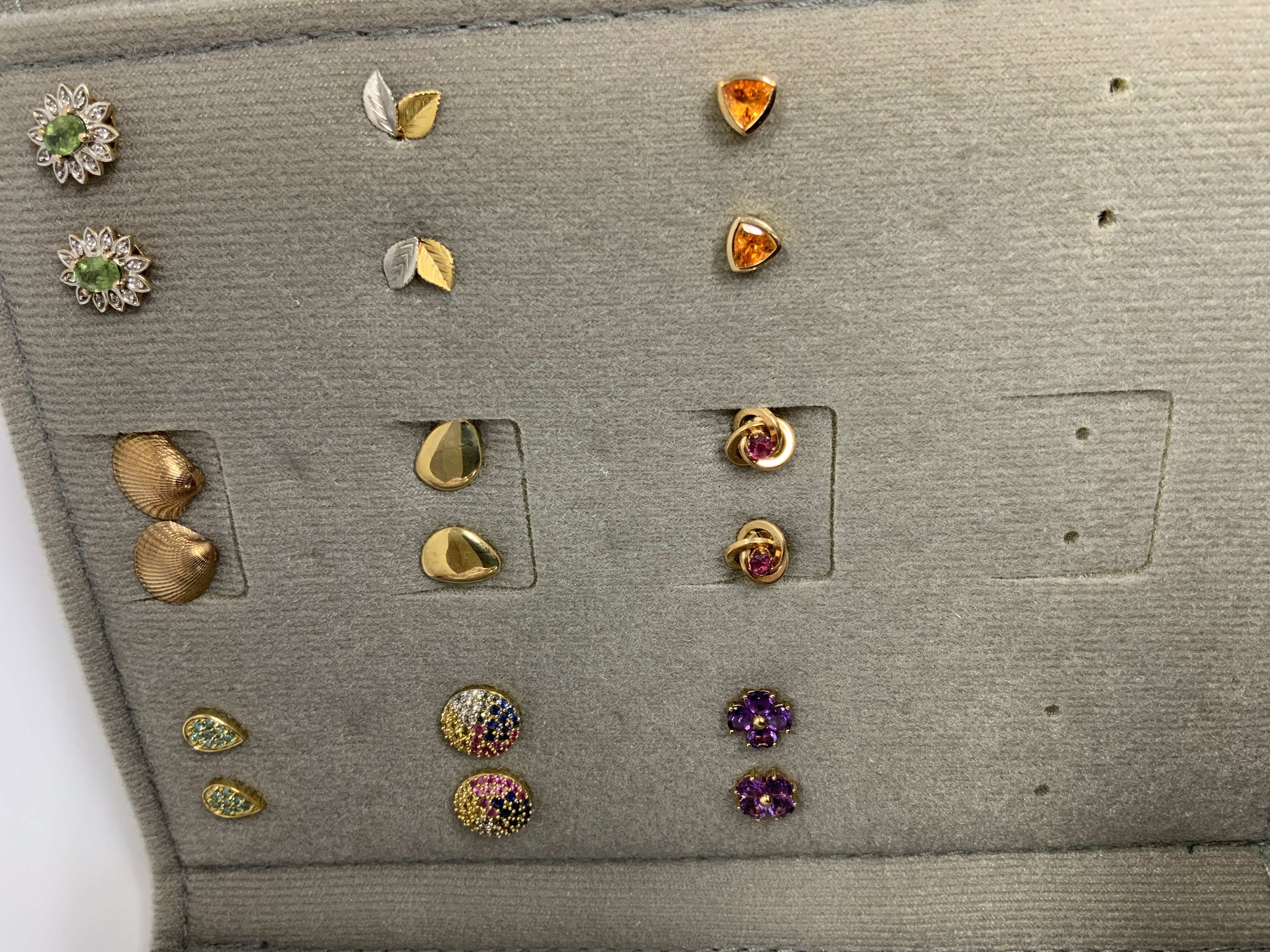 A small stud earring book, including a collection of silver and gold stud earrings.