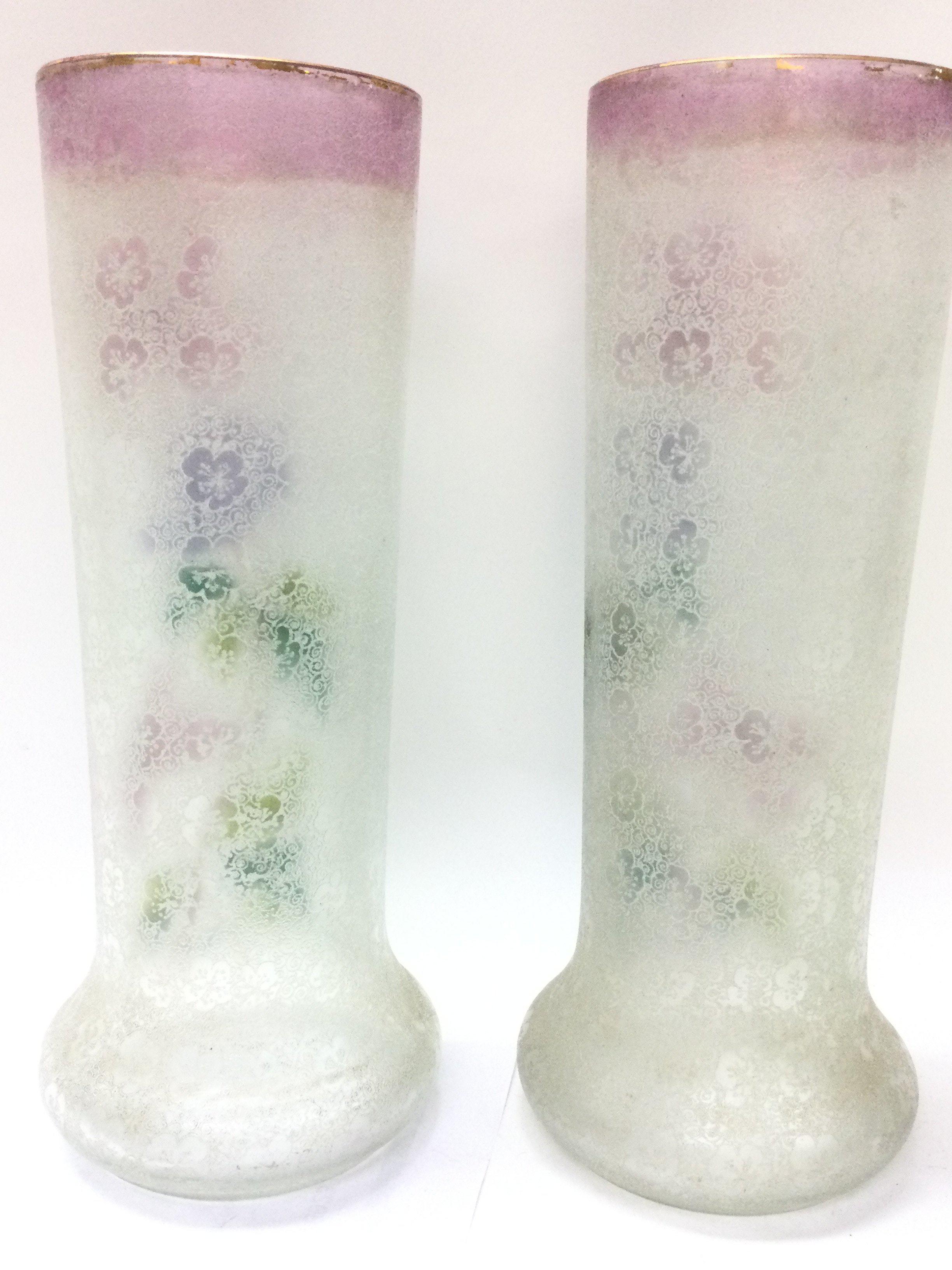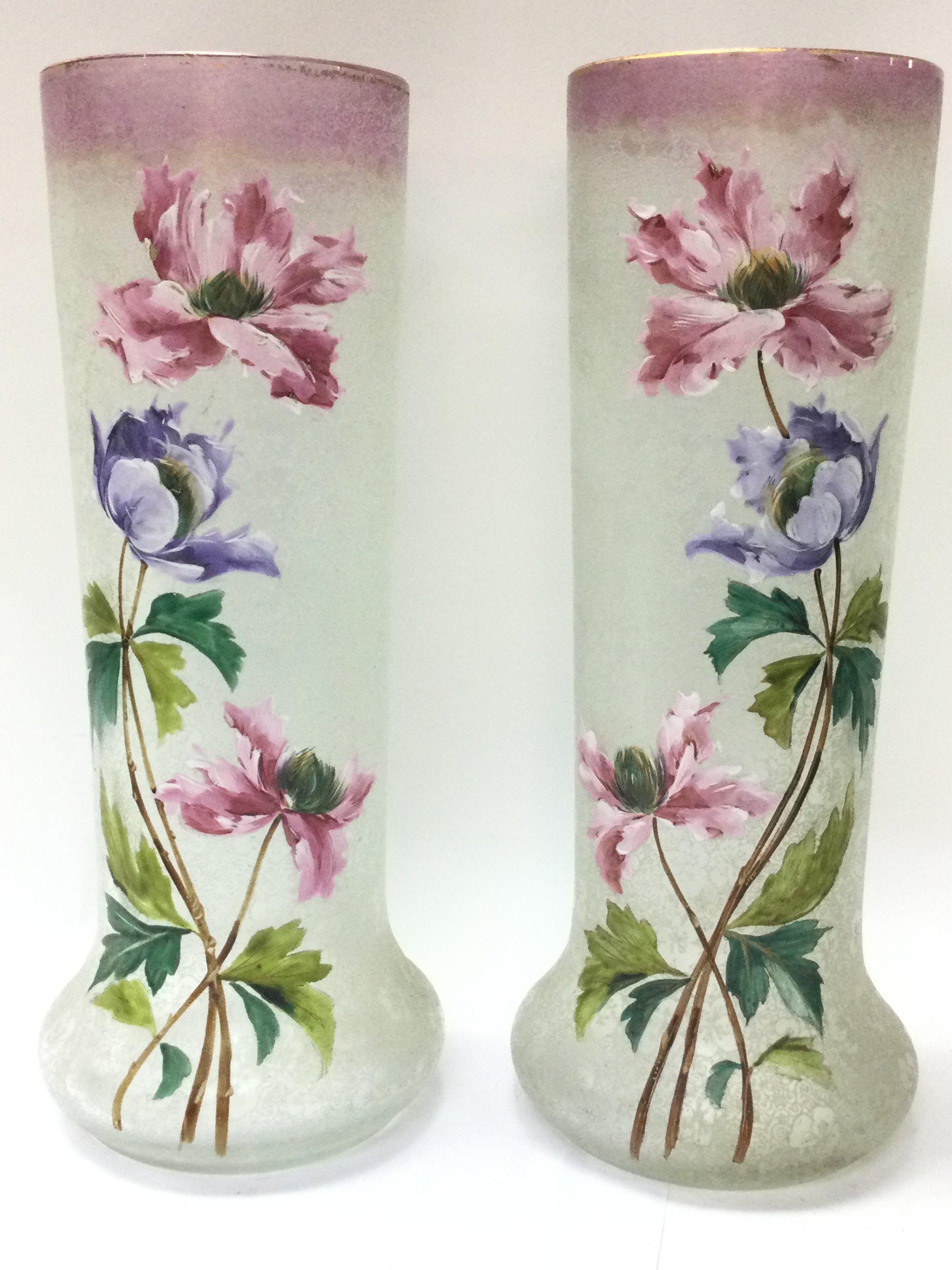 A pair of quality early 20th century acid etched and enamelled decorated glass floral vases approximately 33cm tall. This lot cannot be posted