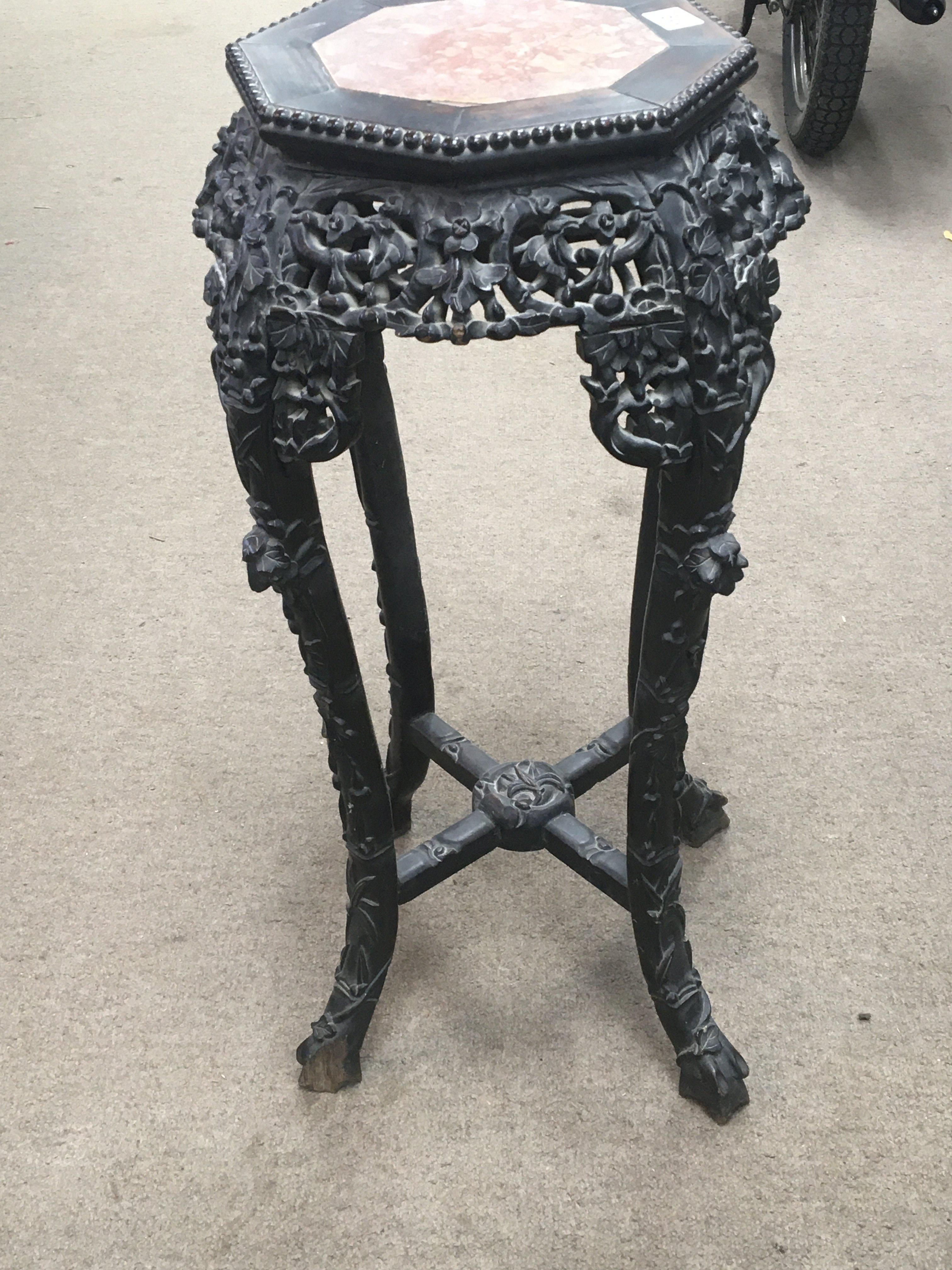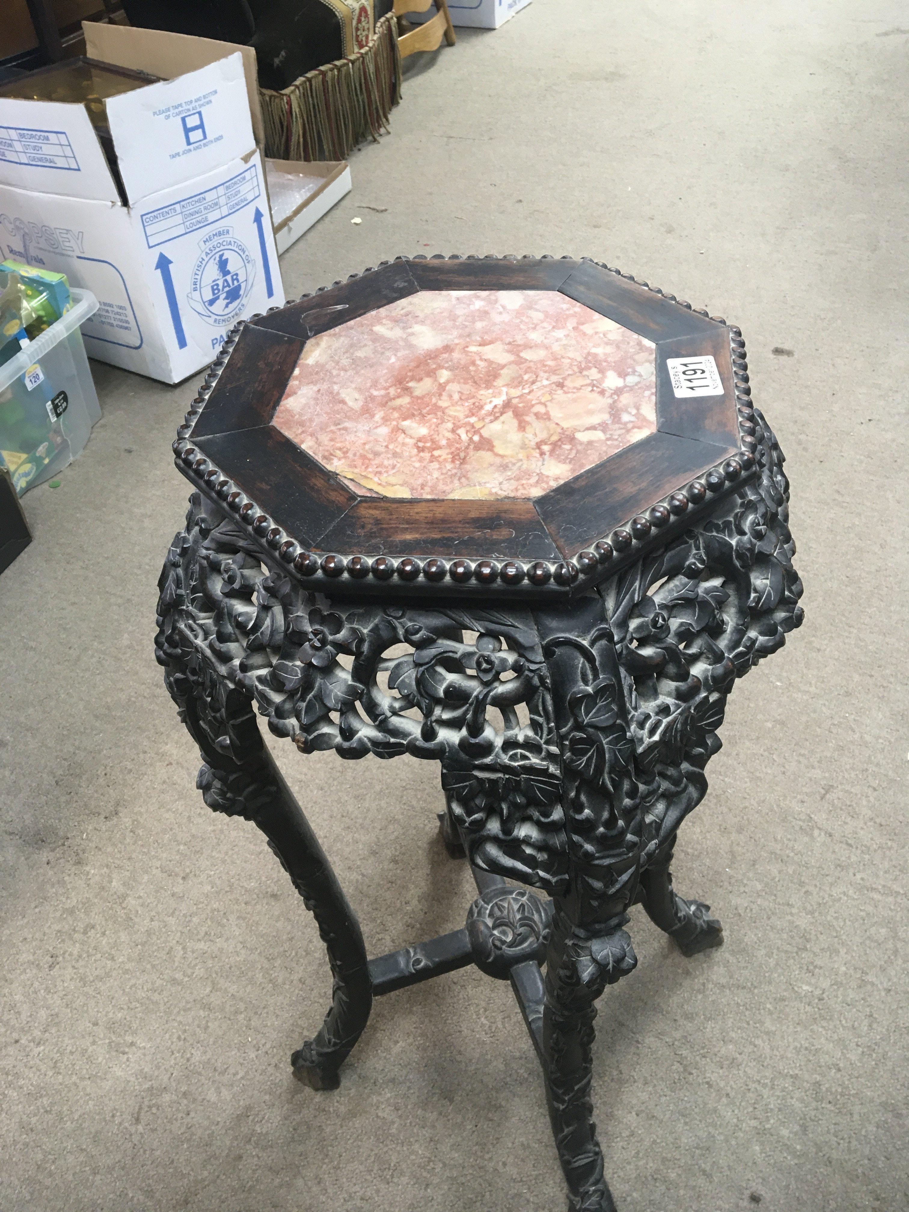 A late 19th century Chinese hardwood jardiniere stand with an inset marble top. Hight 77cm