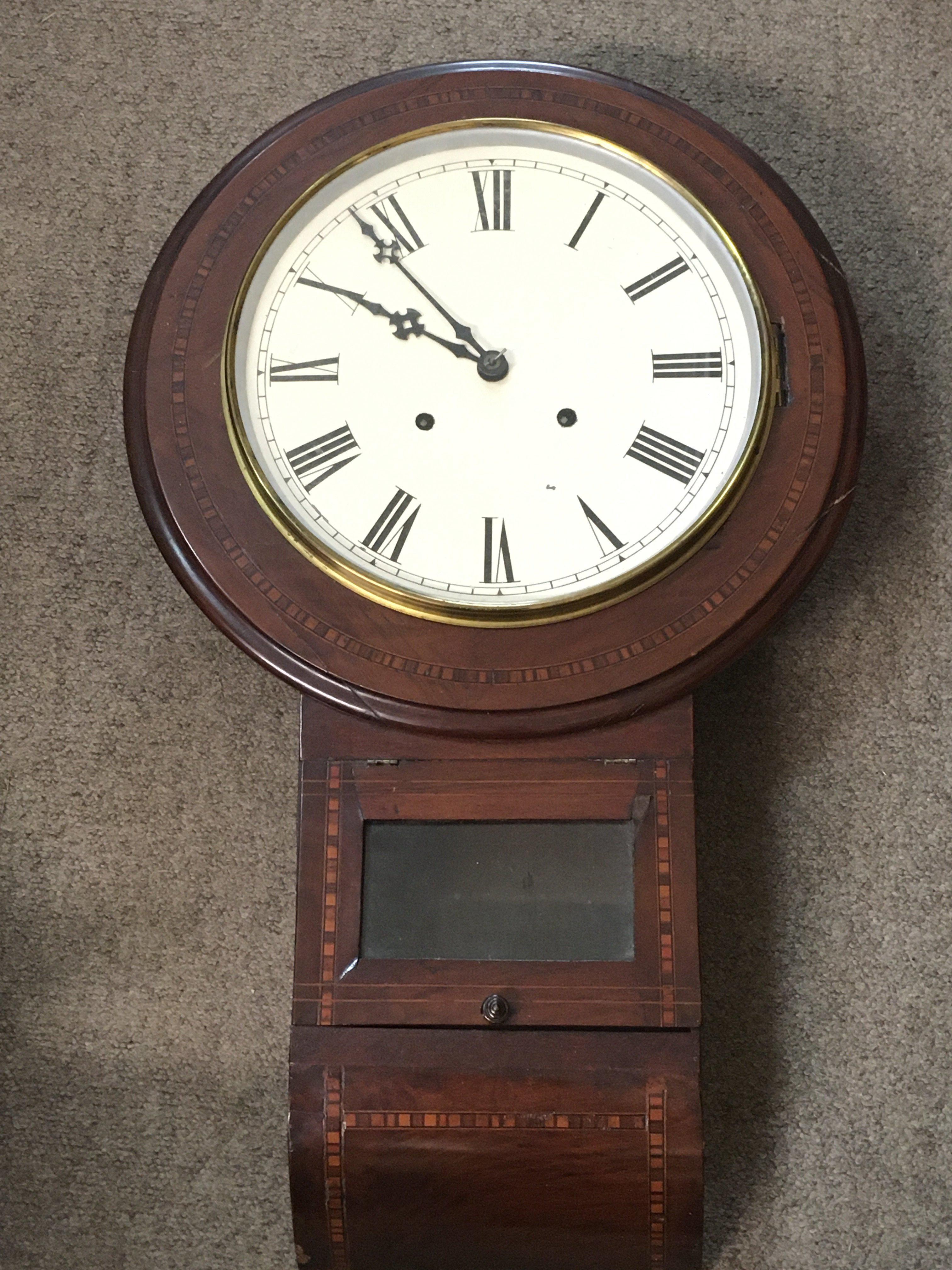 A mahogany drop dial wall clock , dimensions 10x44x60cm. This lot cannot be posted