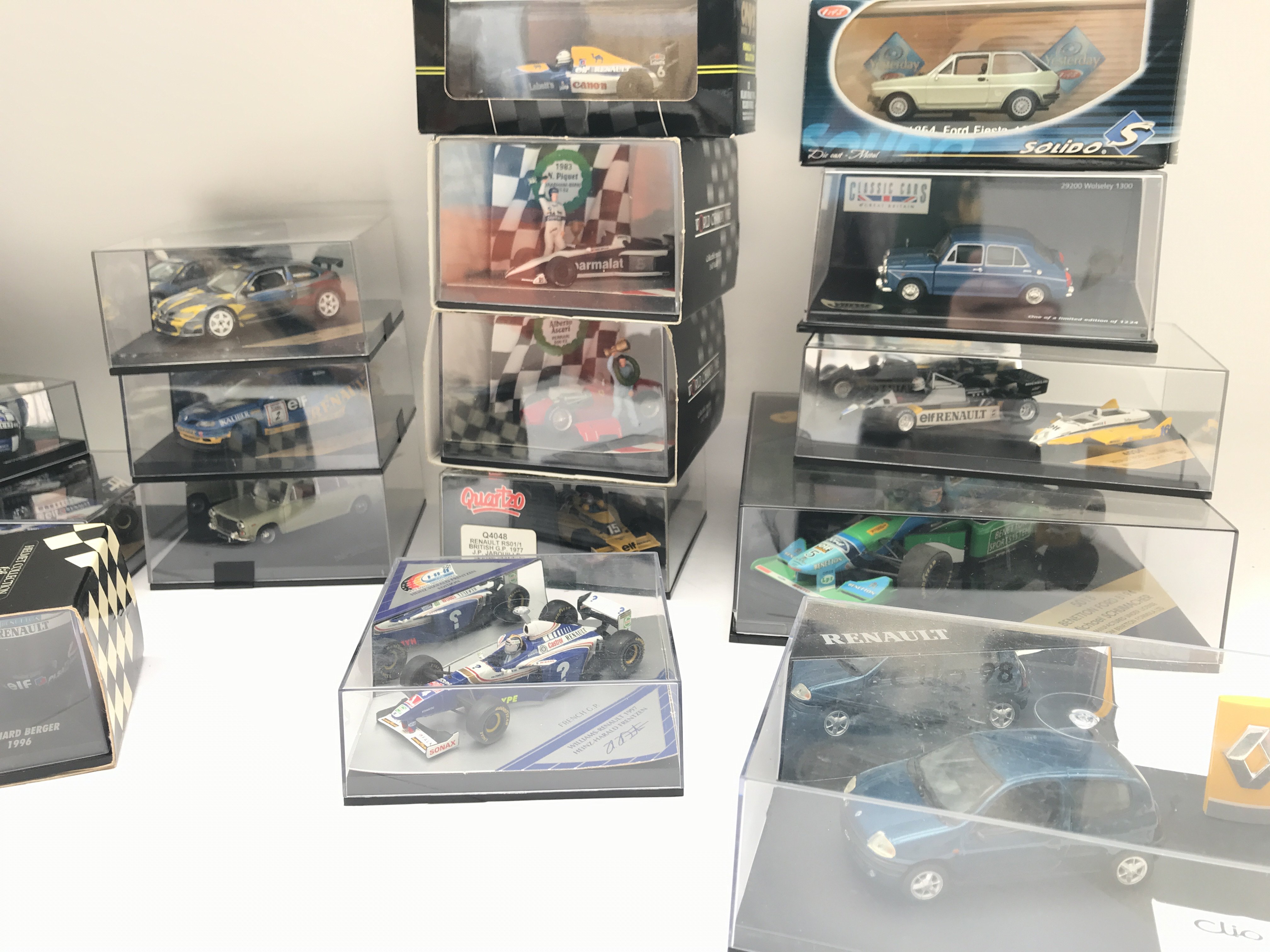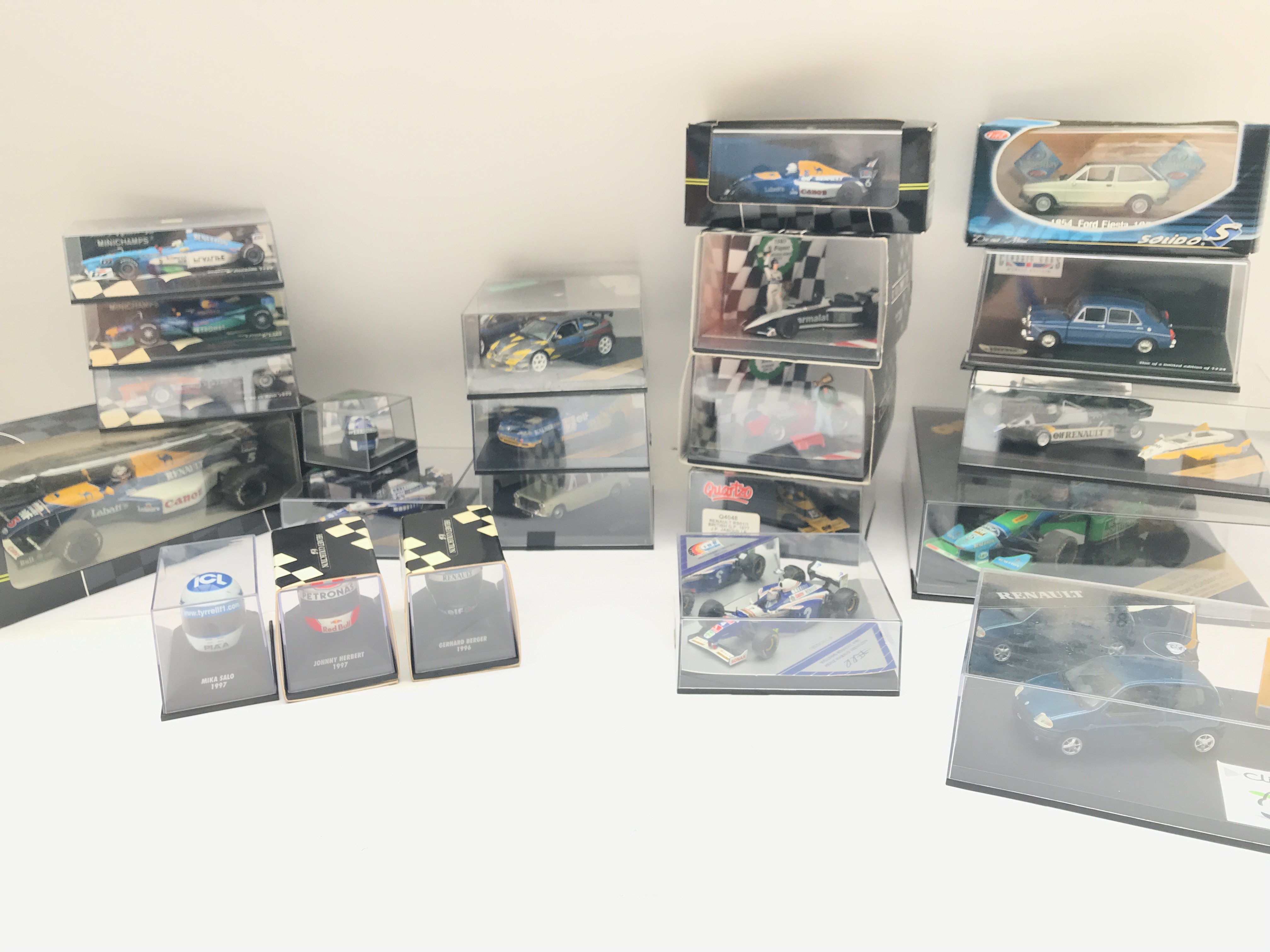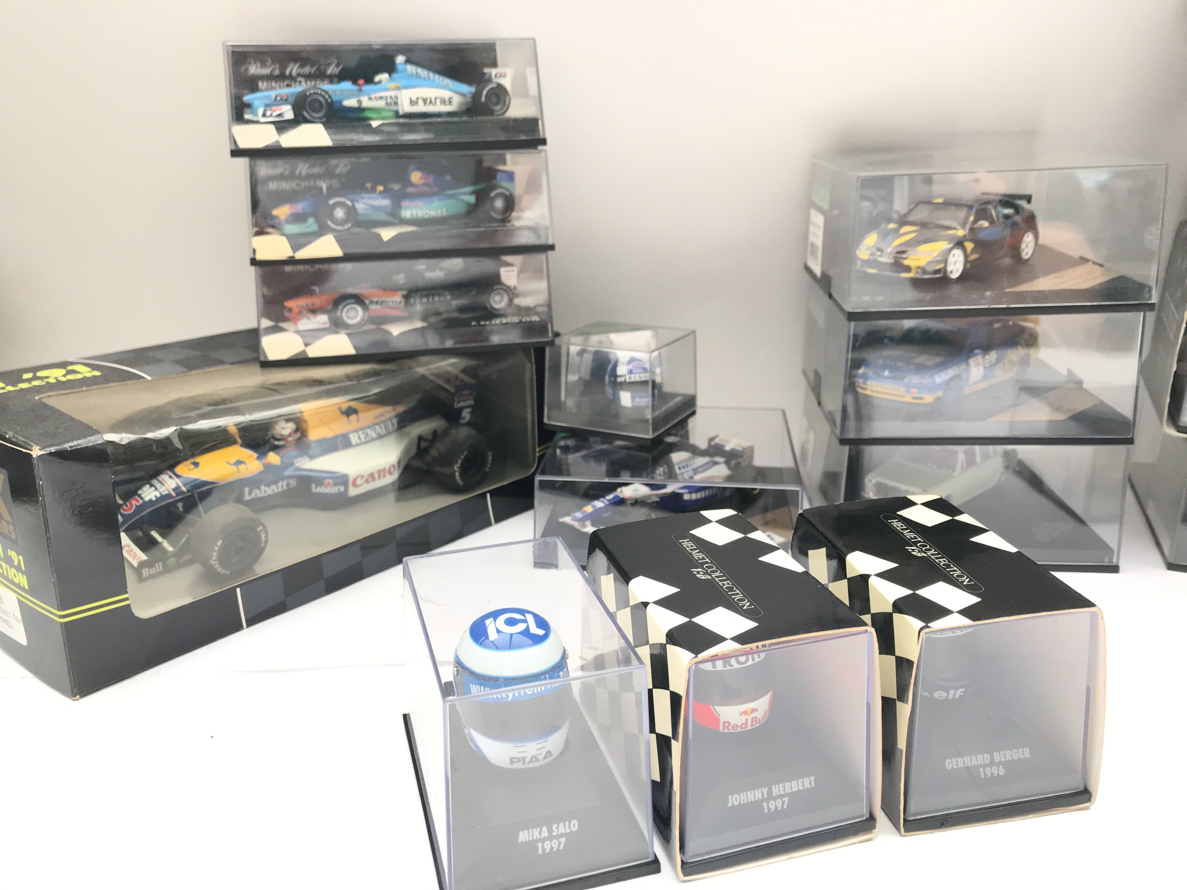 A Collection of Various Racing Car Models Including Minichamps Helmet Collection . All Renault.