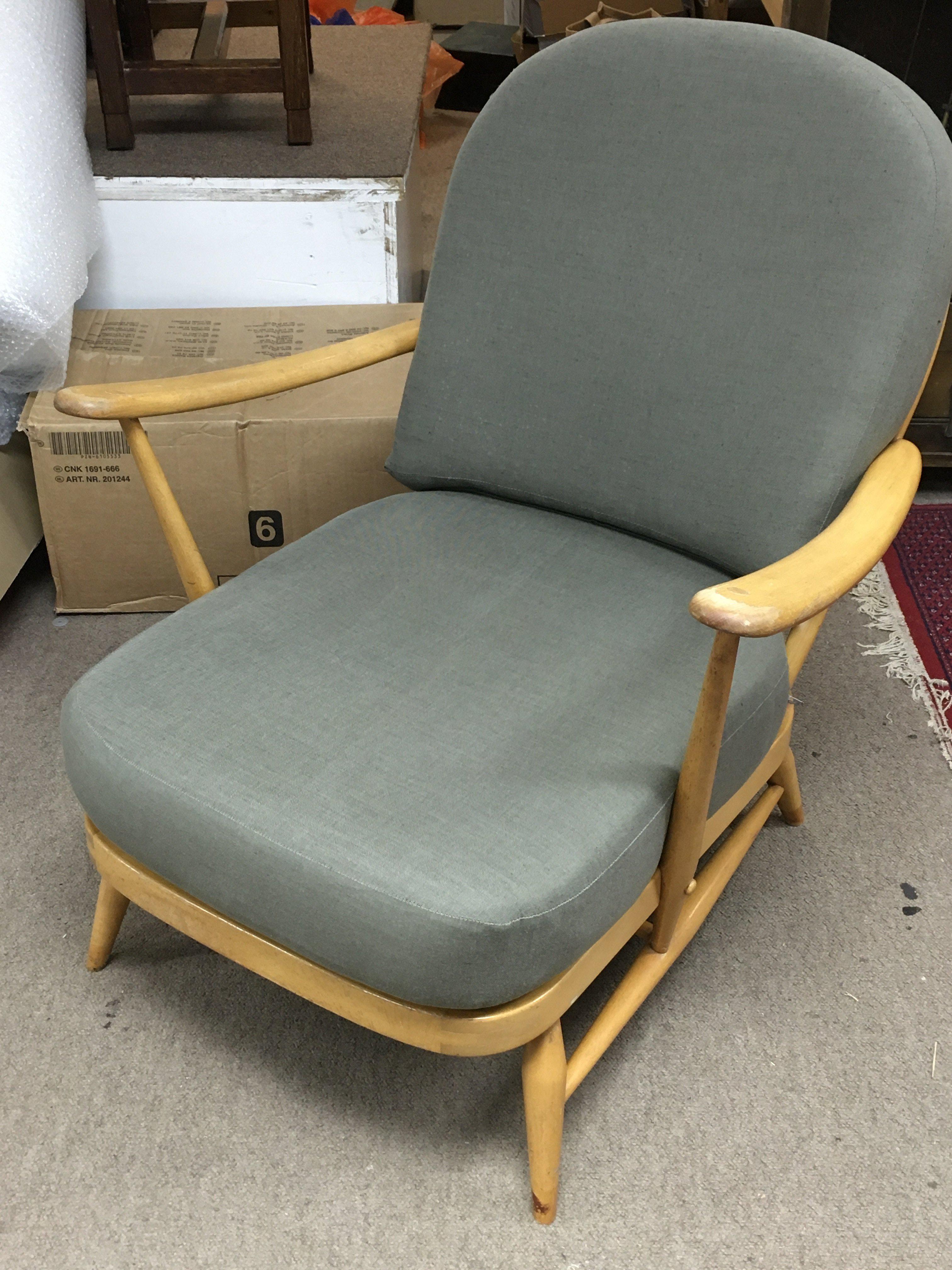 An Ercol Blonde wooden armchair, model 203. 84cm tall.