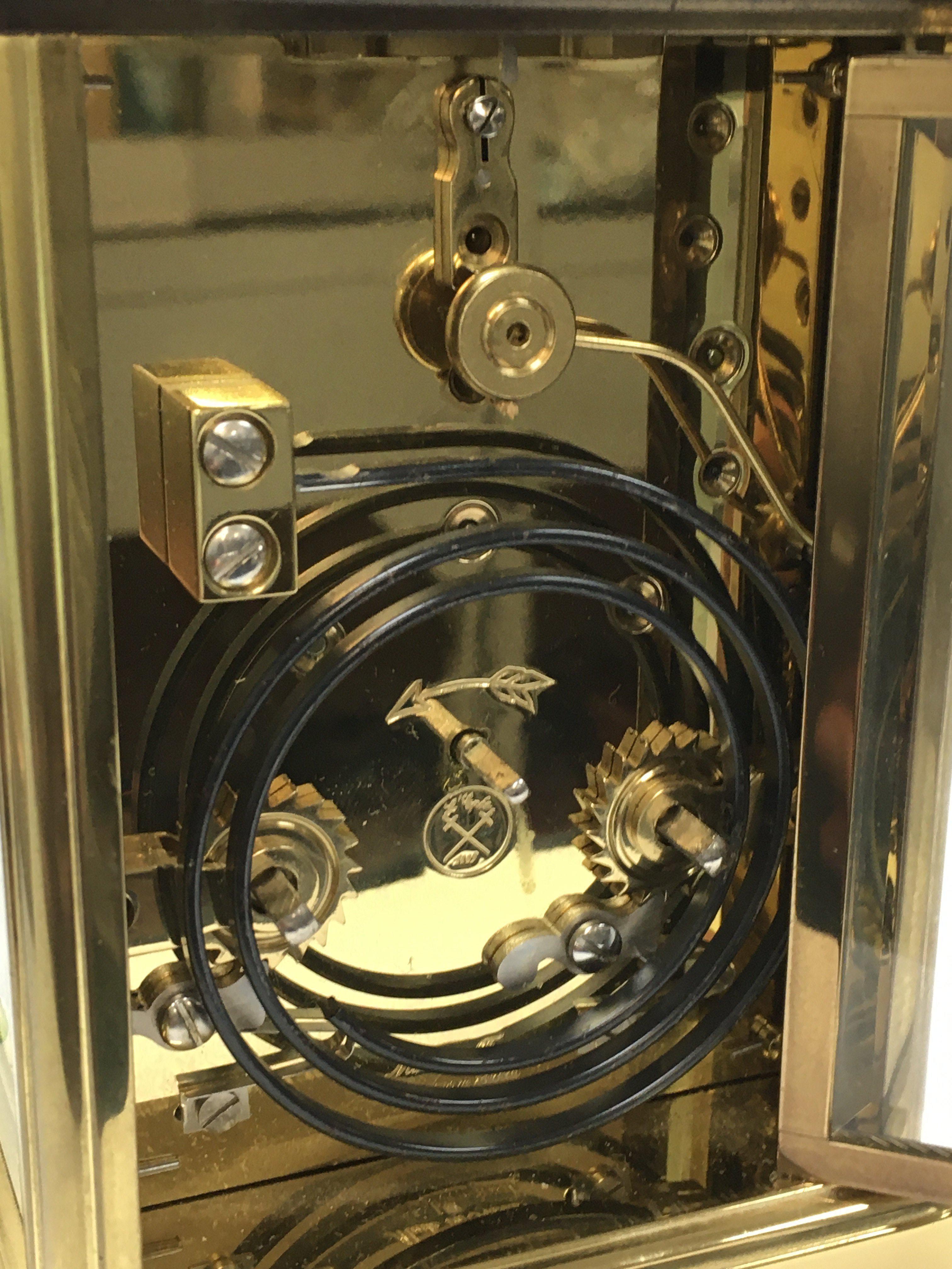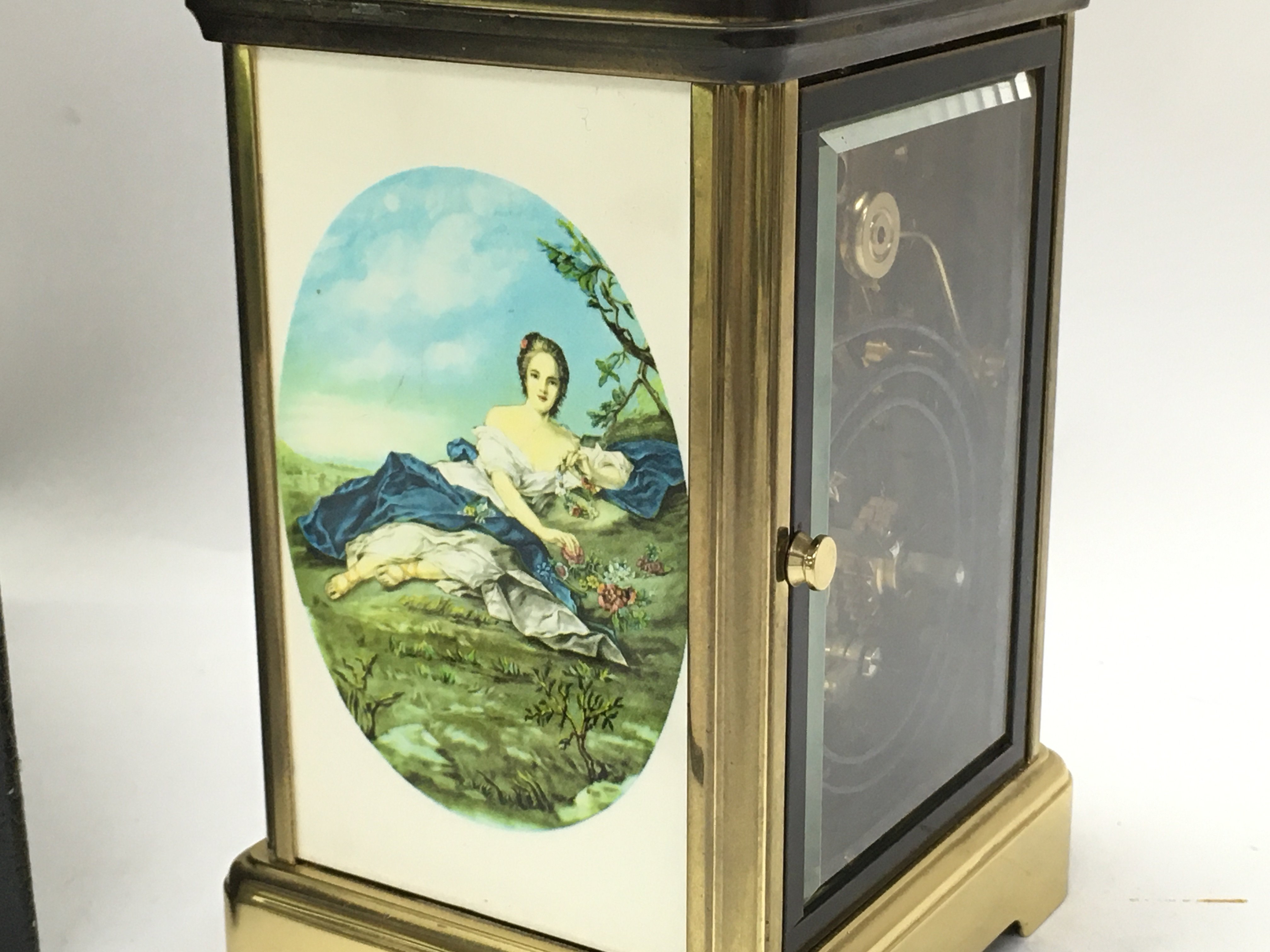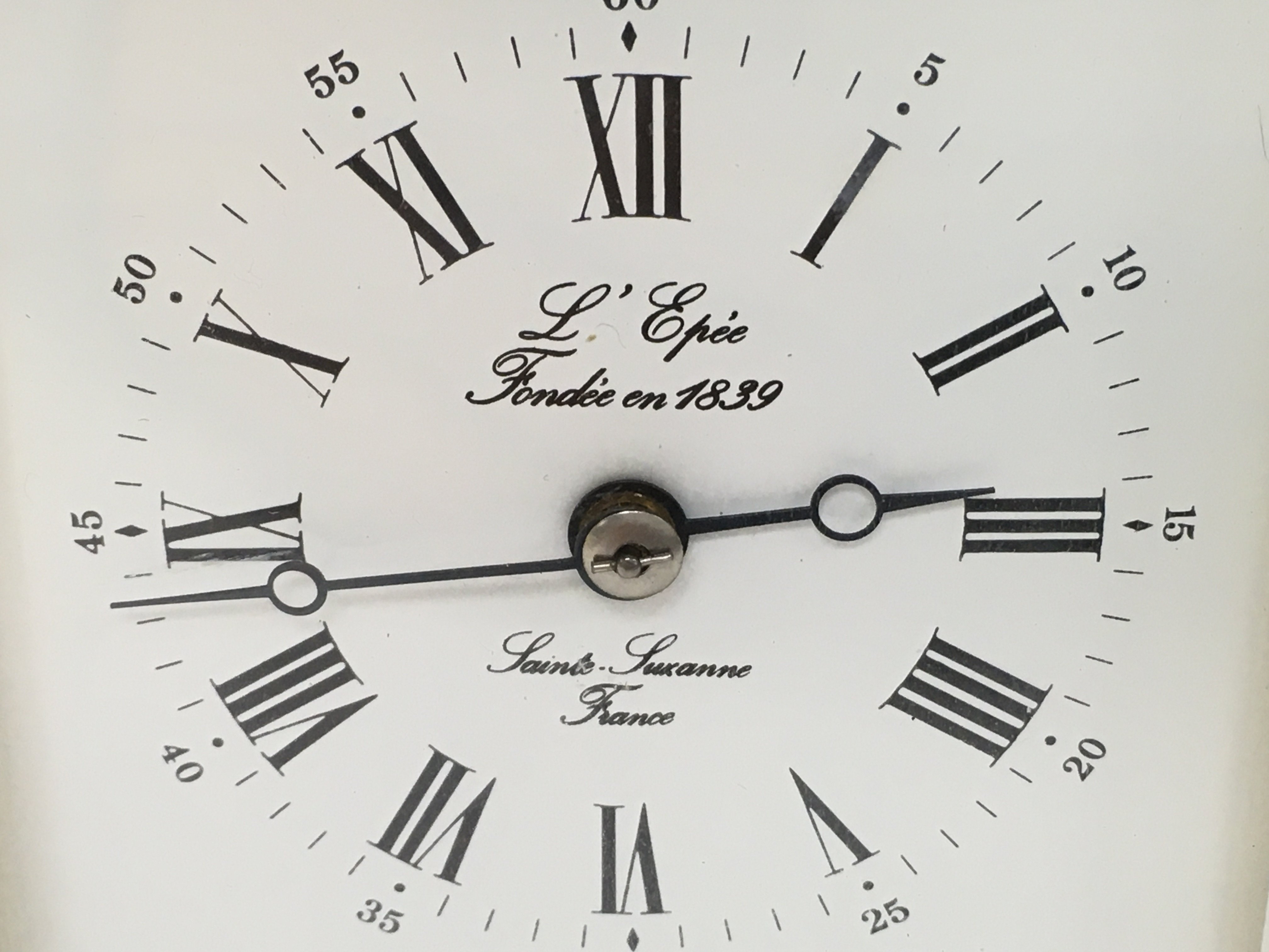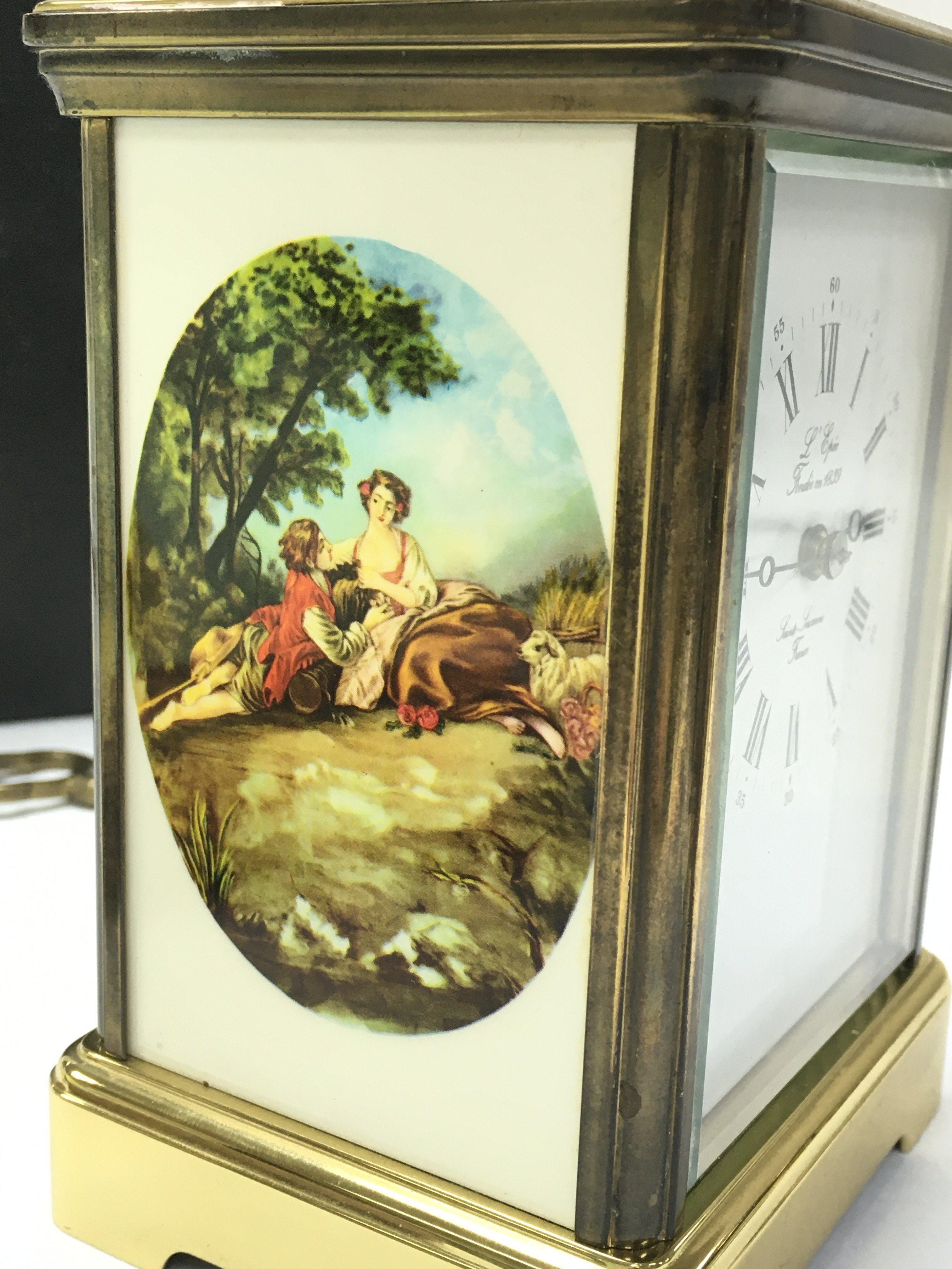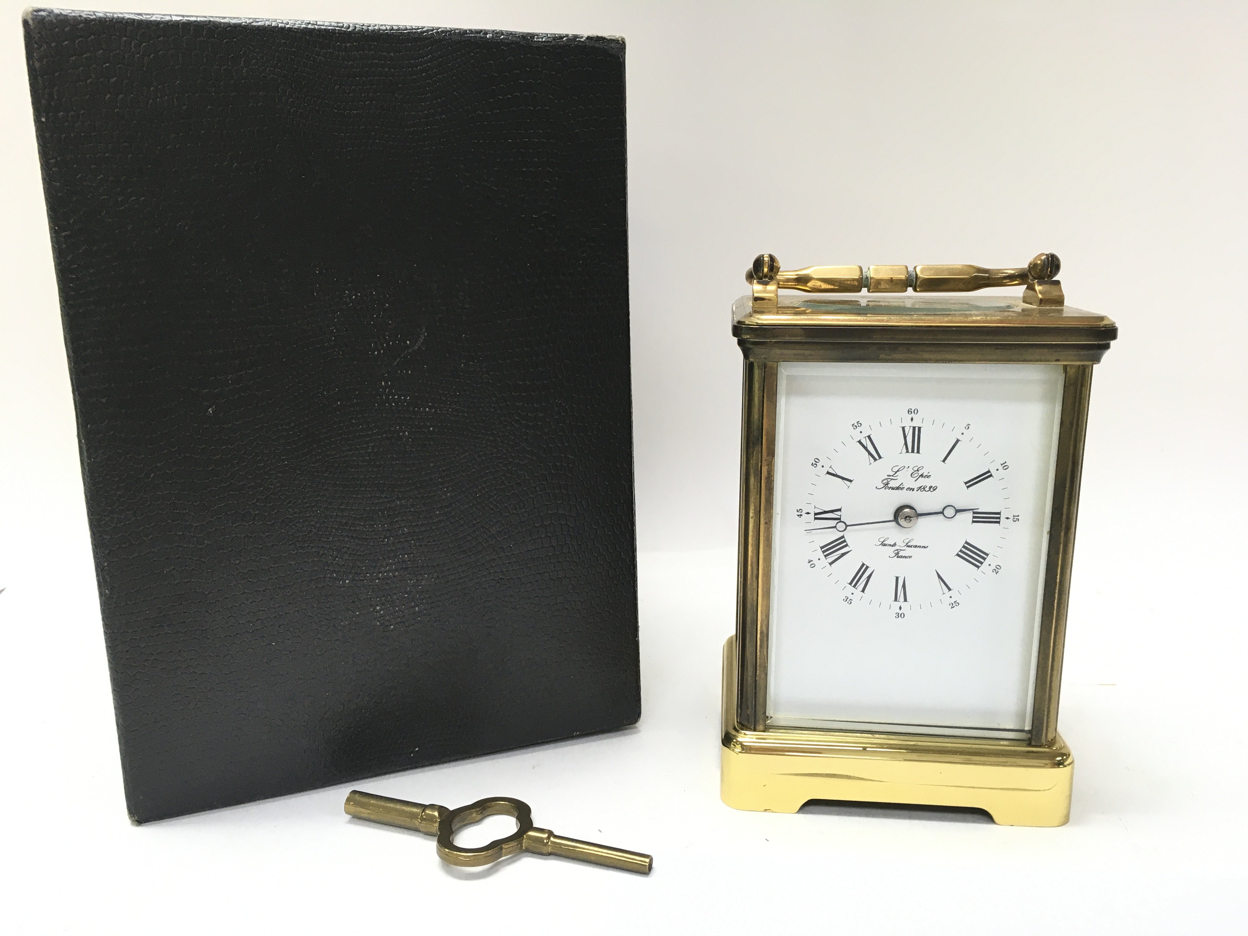A boxed L Epee French brass carriage clock with decorated with ceramic side panels. Including key, seen working. Postage category B