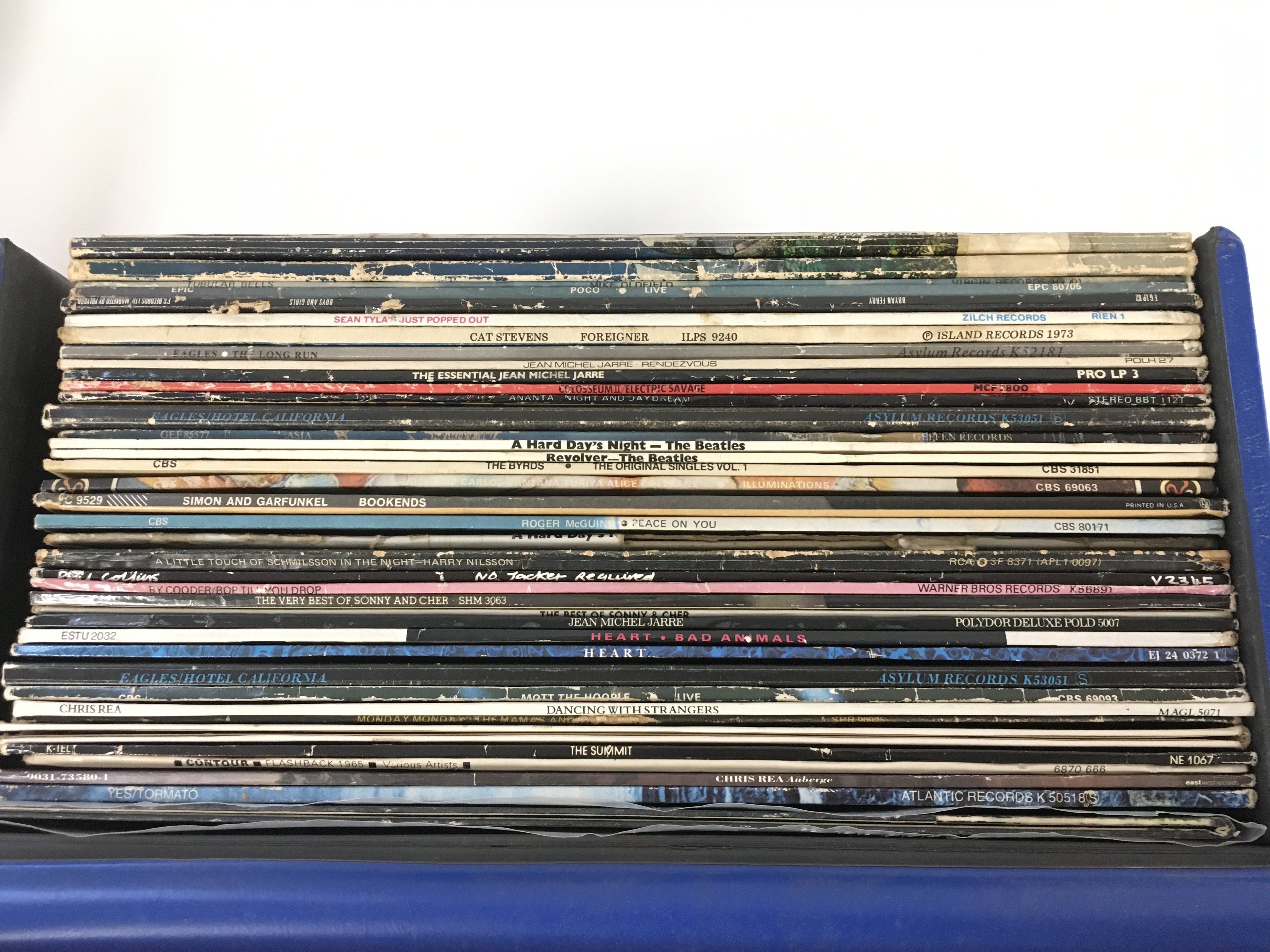 A record case of LPs by various artists including The Beatles, Eagles, Mott The Hoople and others.