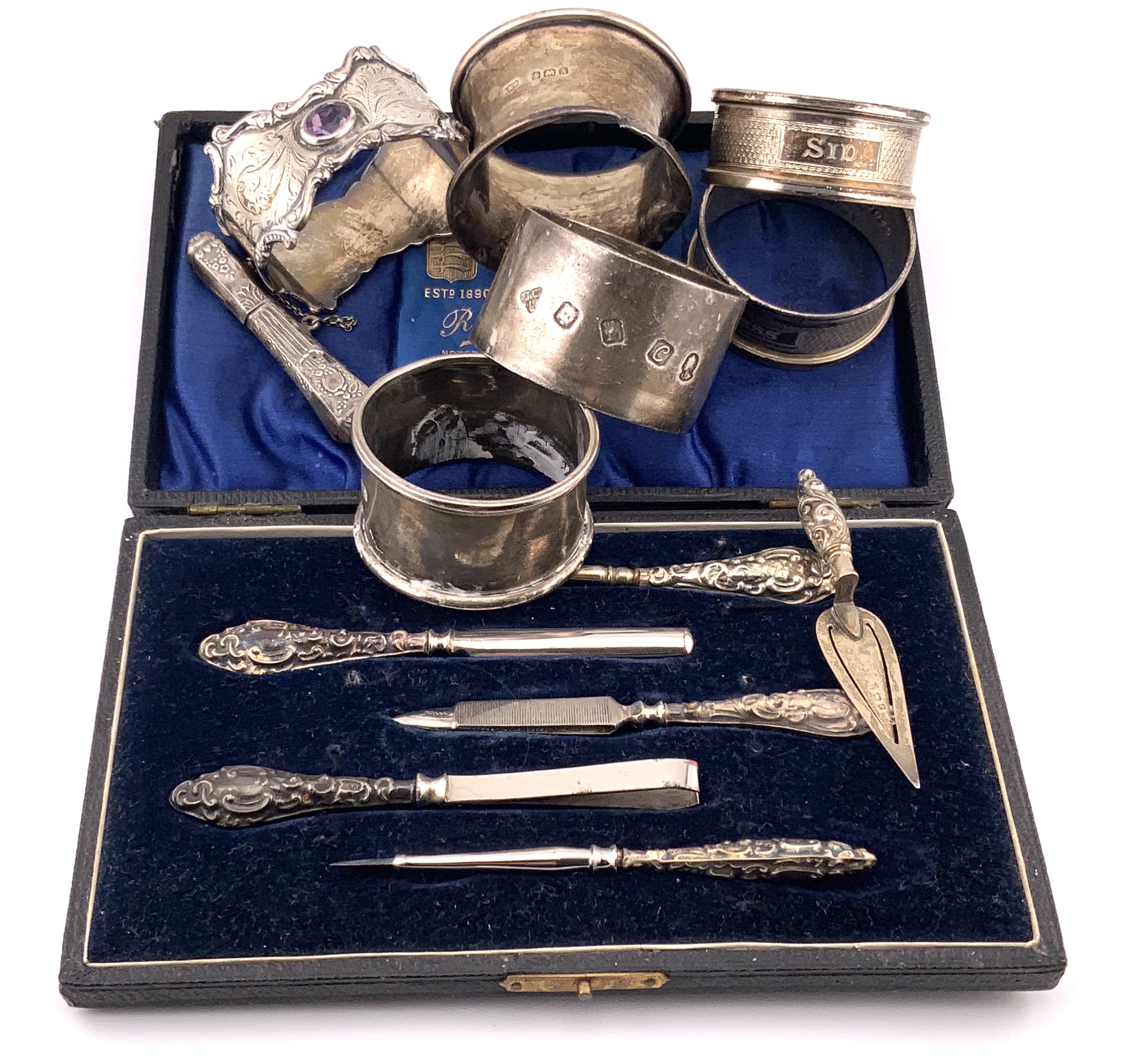 A small collection of hallmarked silver items. To include a manicure set, 6 Hallmarked napkin rings, Needle case, Bookmark. (B)