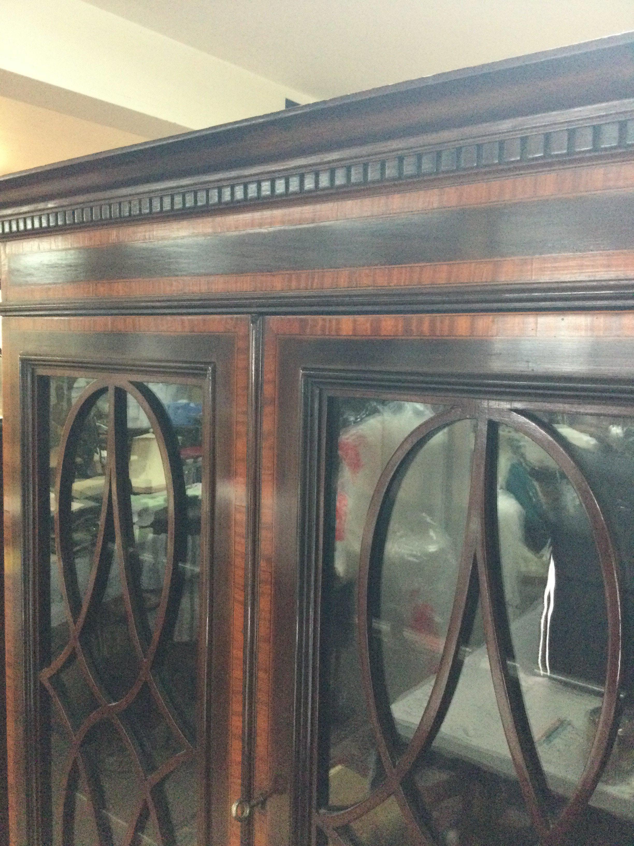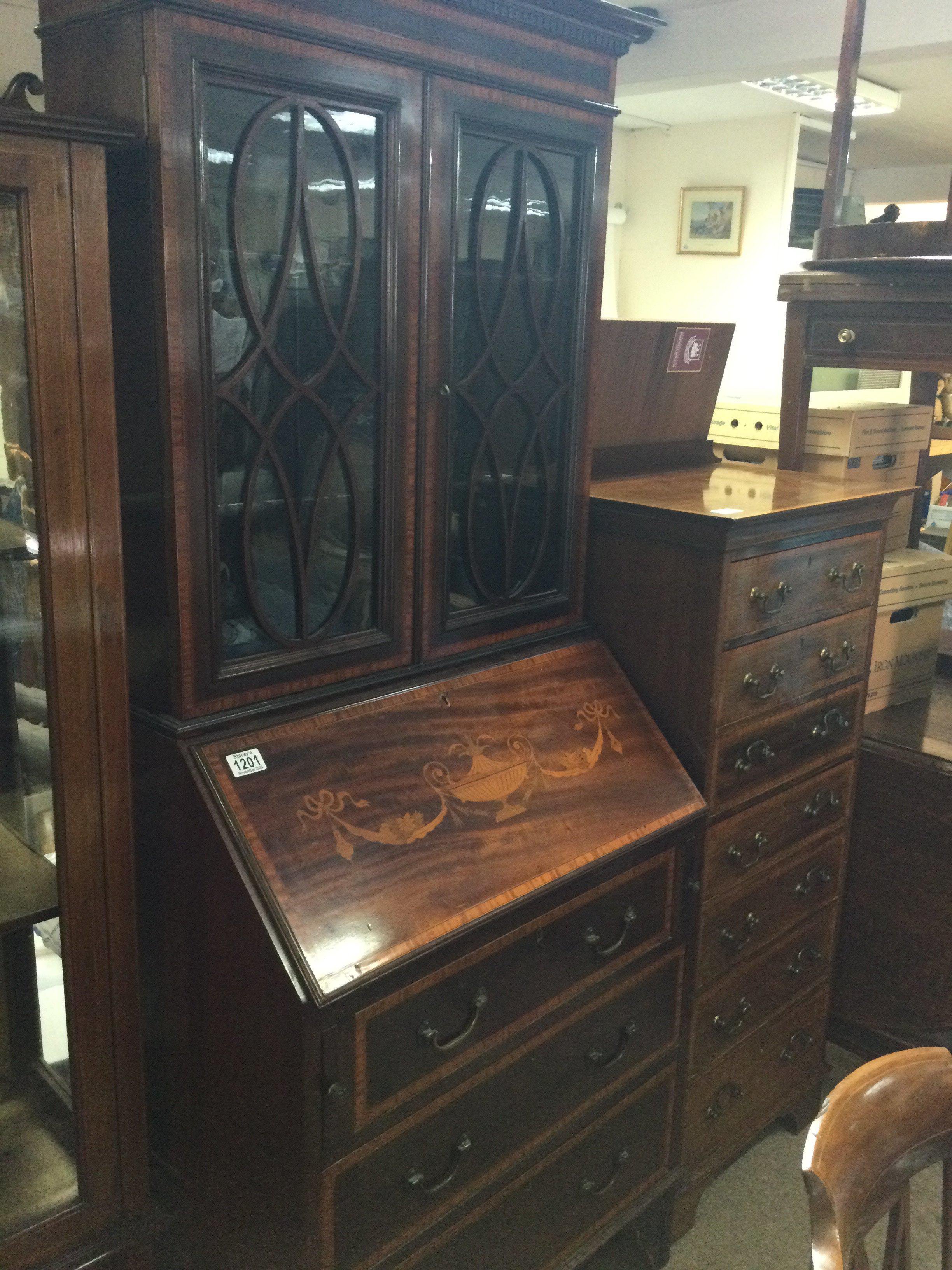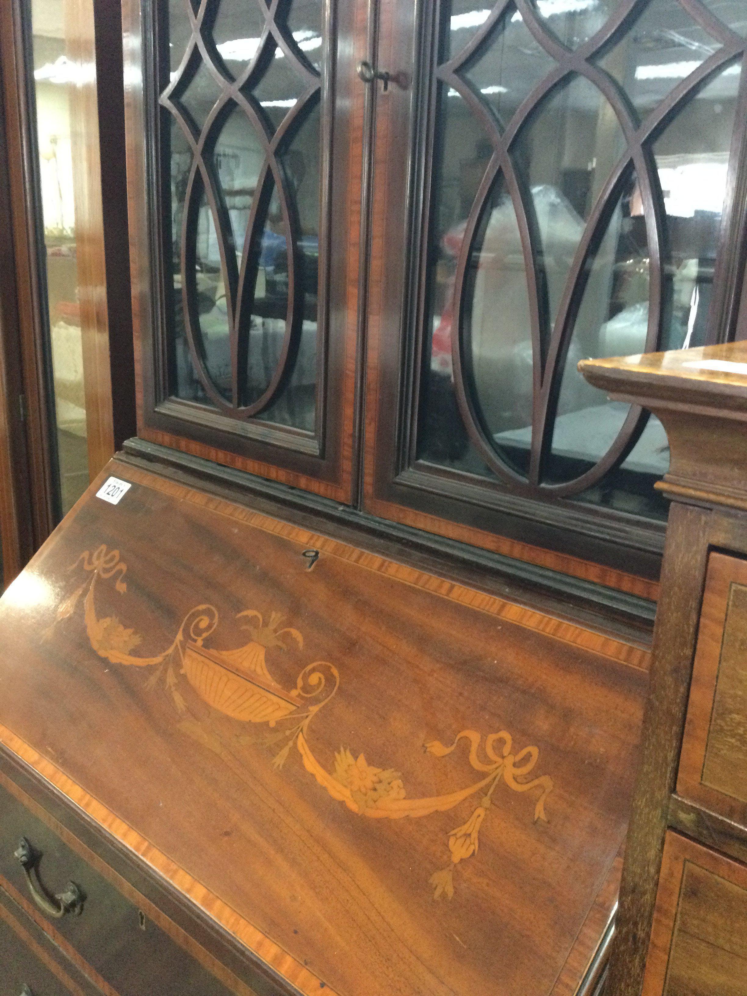 A small Edwardian inlaid mahogany bureau bookcase with a pair of glazed doors above a full front with three drawers under . 172 cm x 65 cm .
