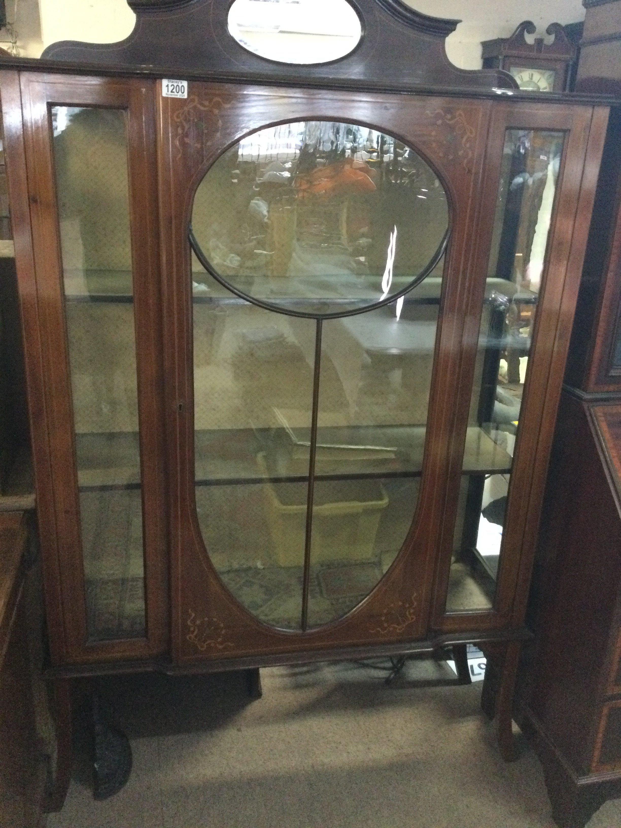A Edwardian mahogany display cabinet the glazed door enclosing fitted shelves on cabriole Legs .
