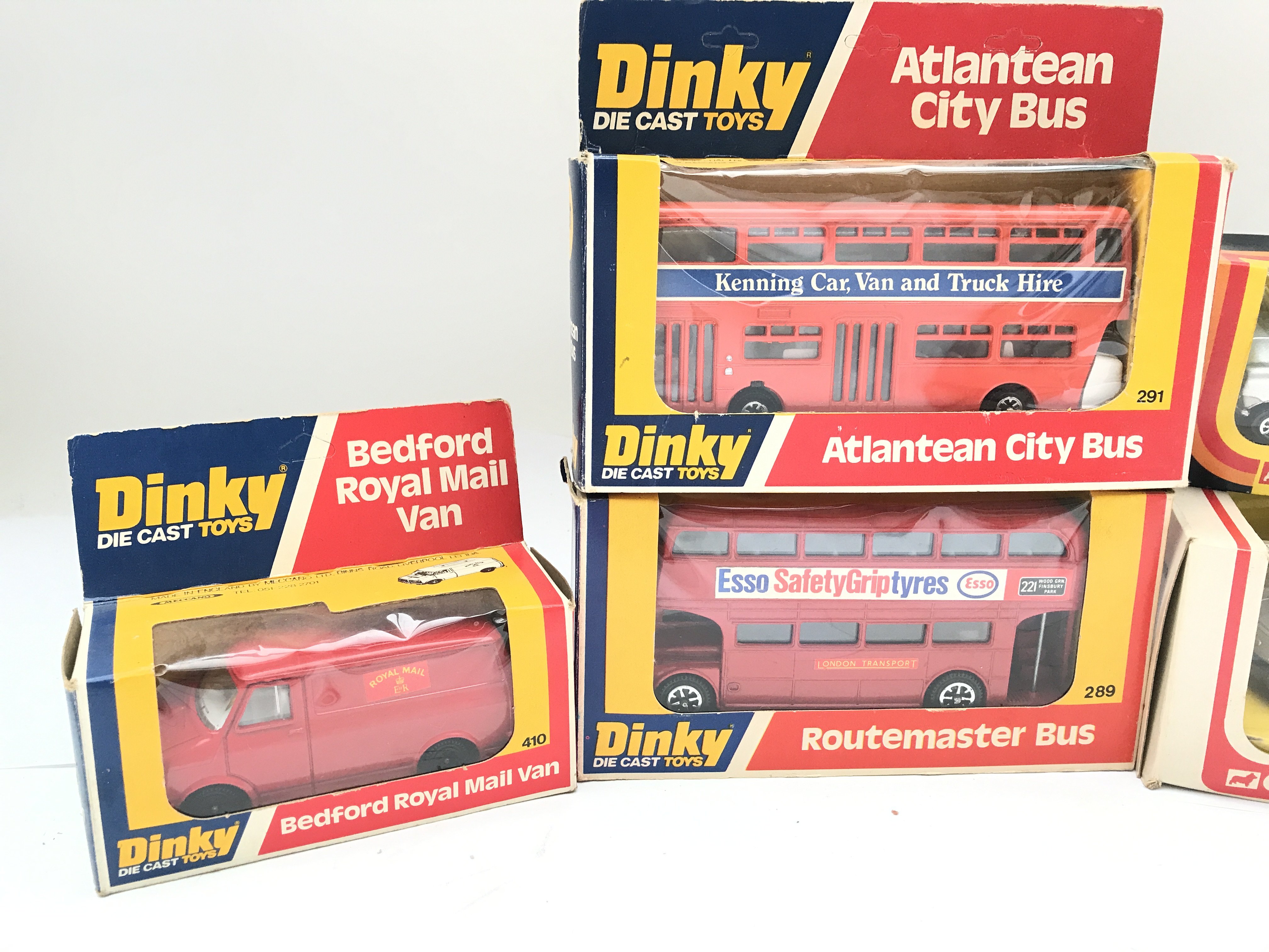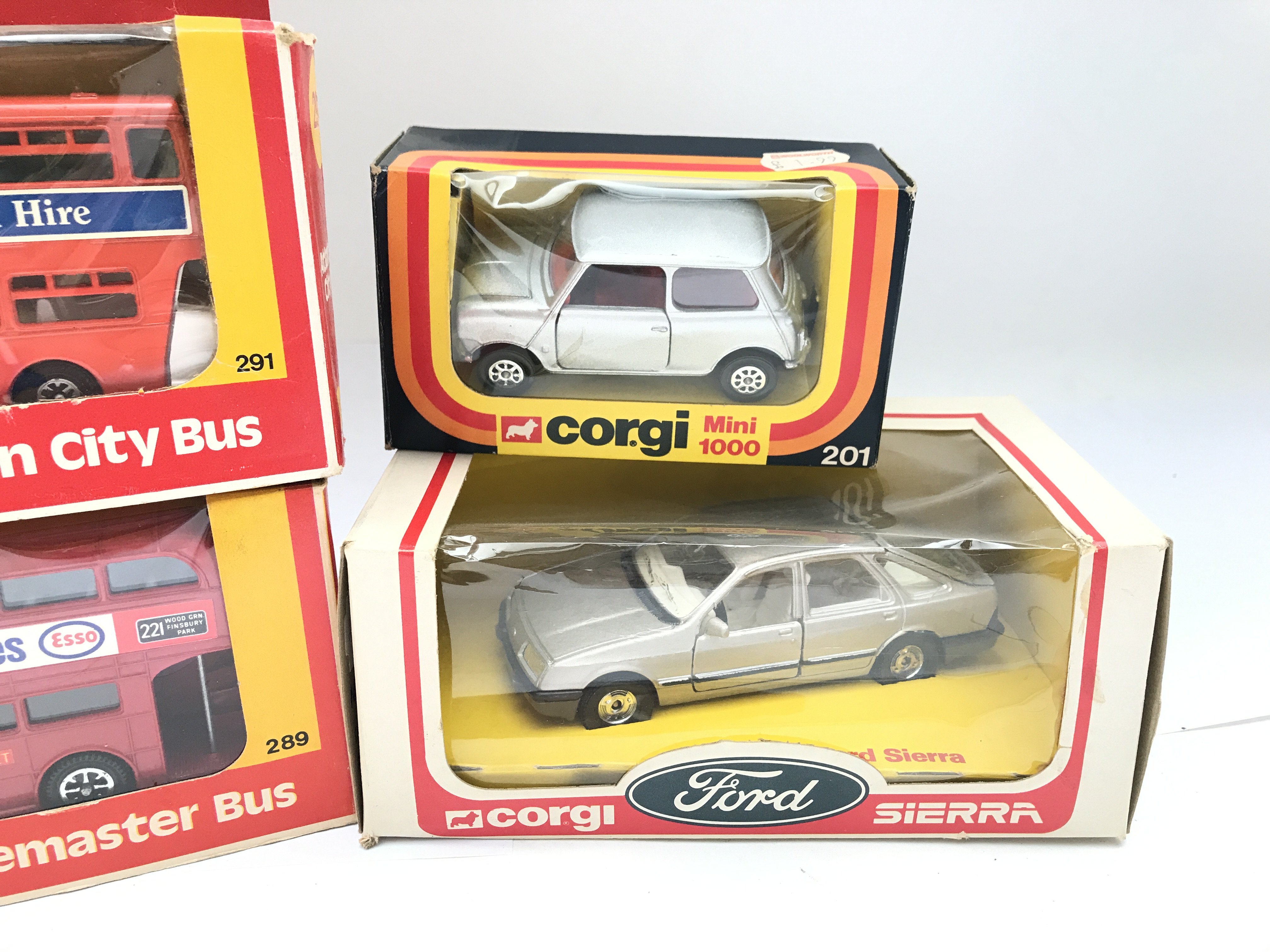 3 Boxed Dinky Toys a Bedford Royal Mail Van #410. A Atlantean City Bus #291. A Routemaster Bus #289. And 2 Corgi Toys a Ford Sierra #299 and a Mini 1000 #201.