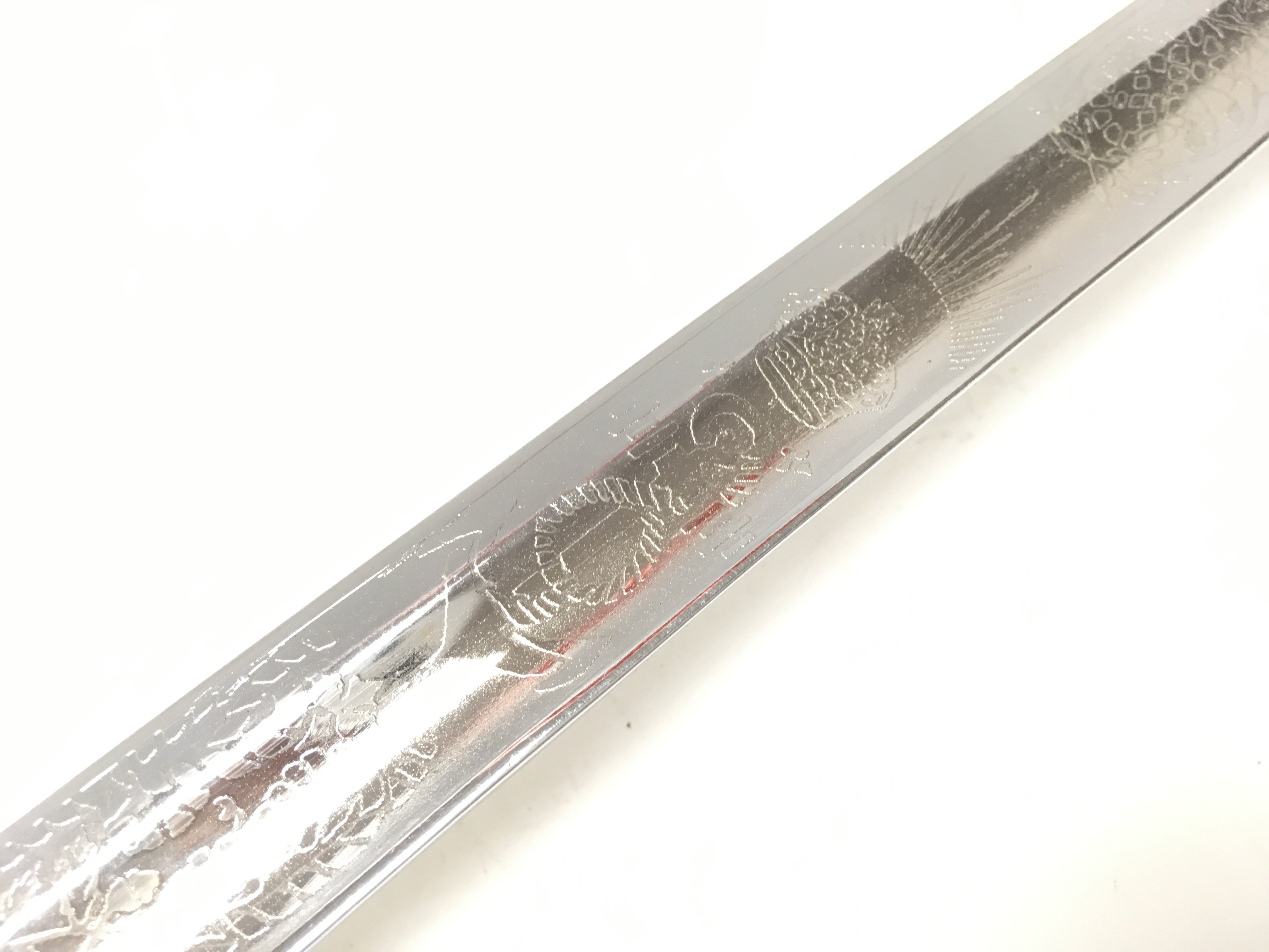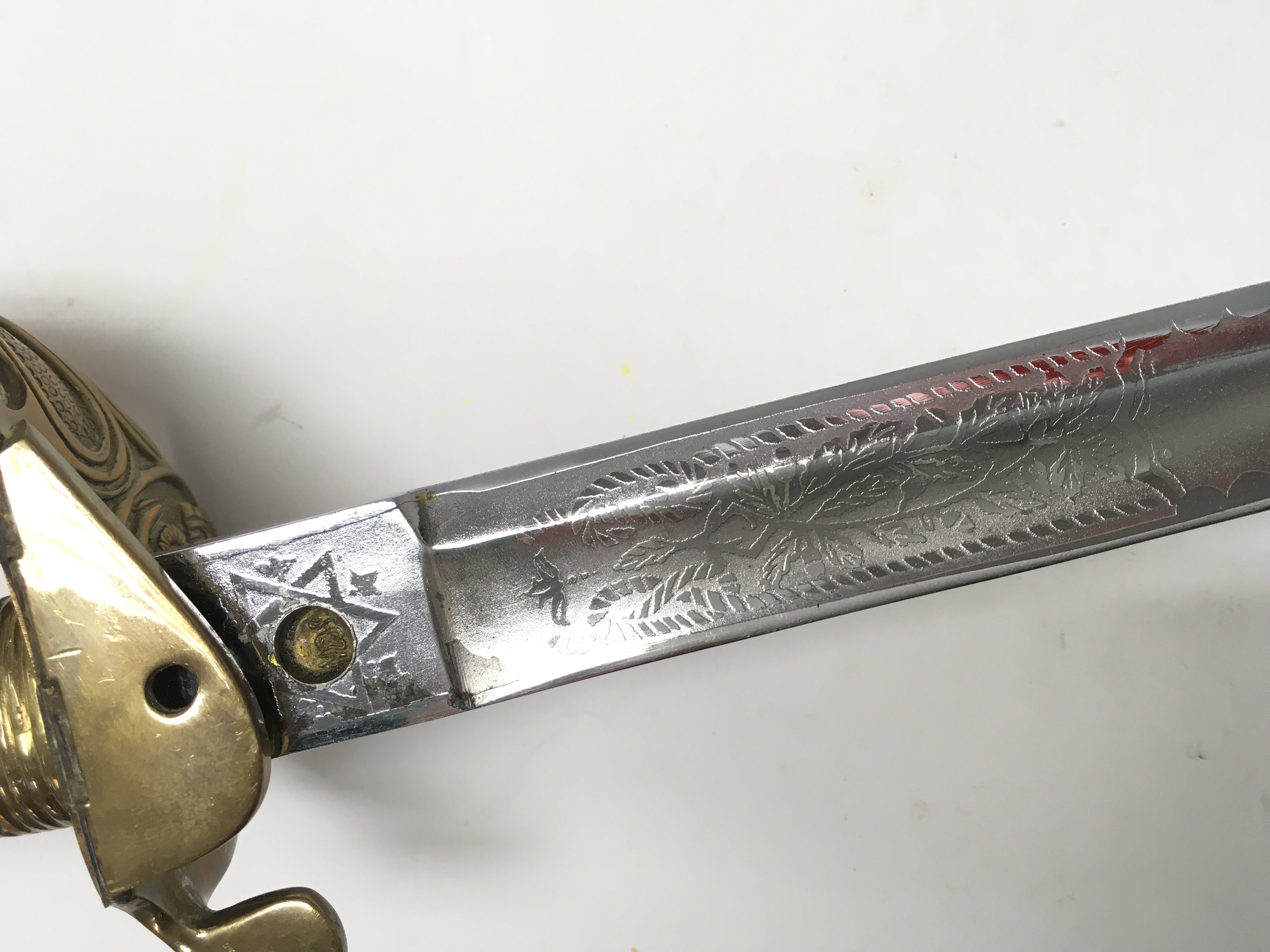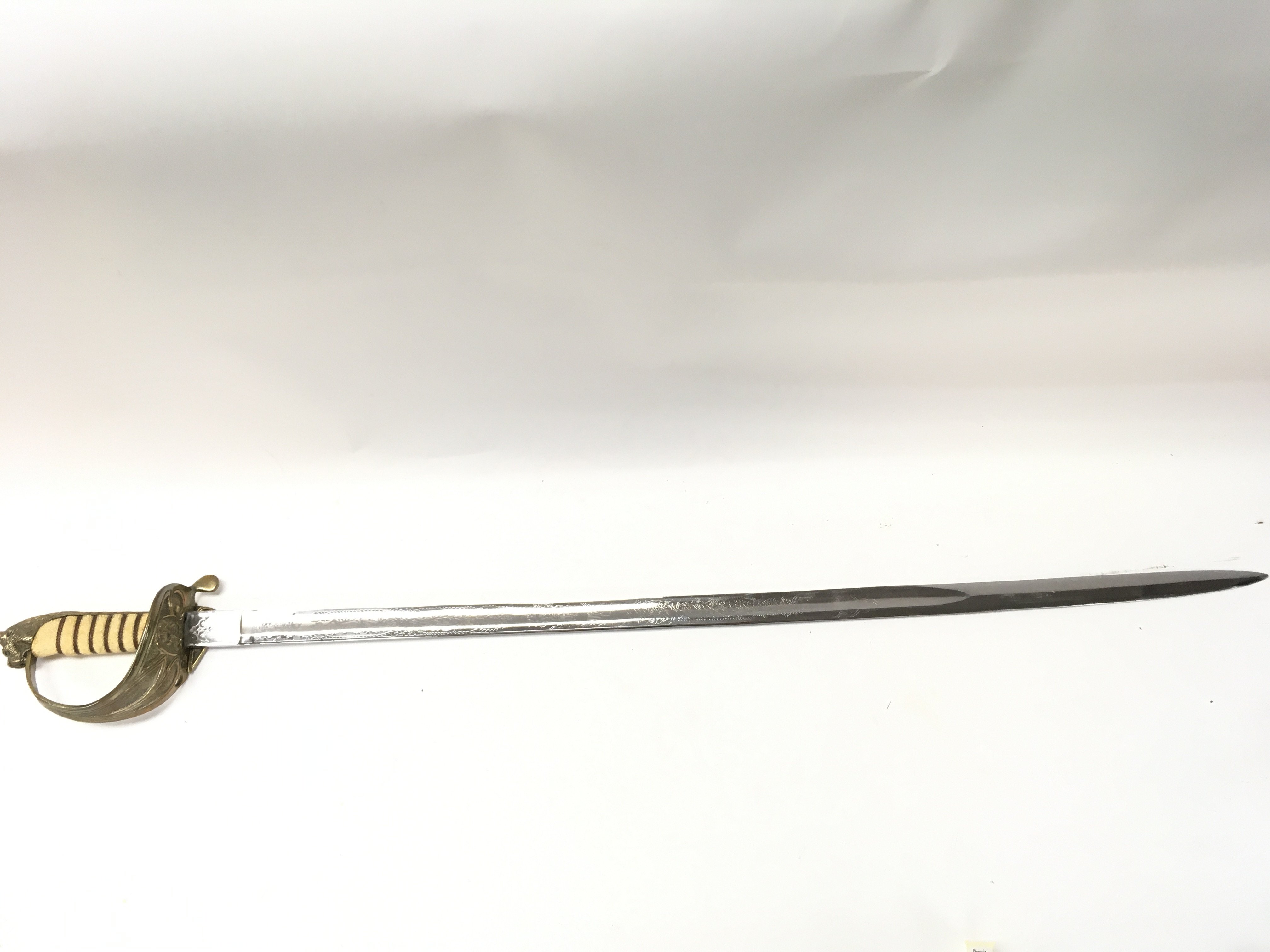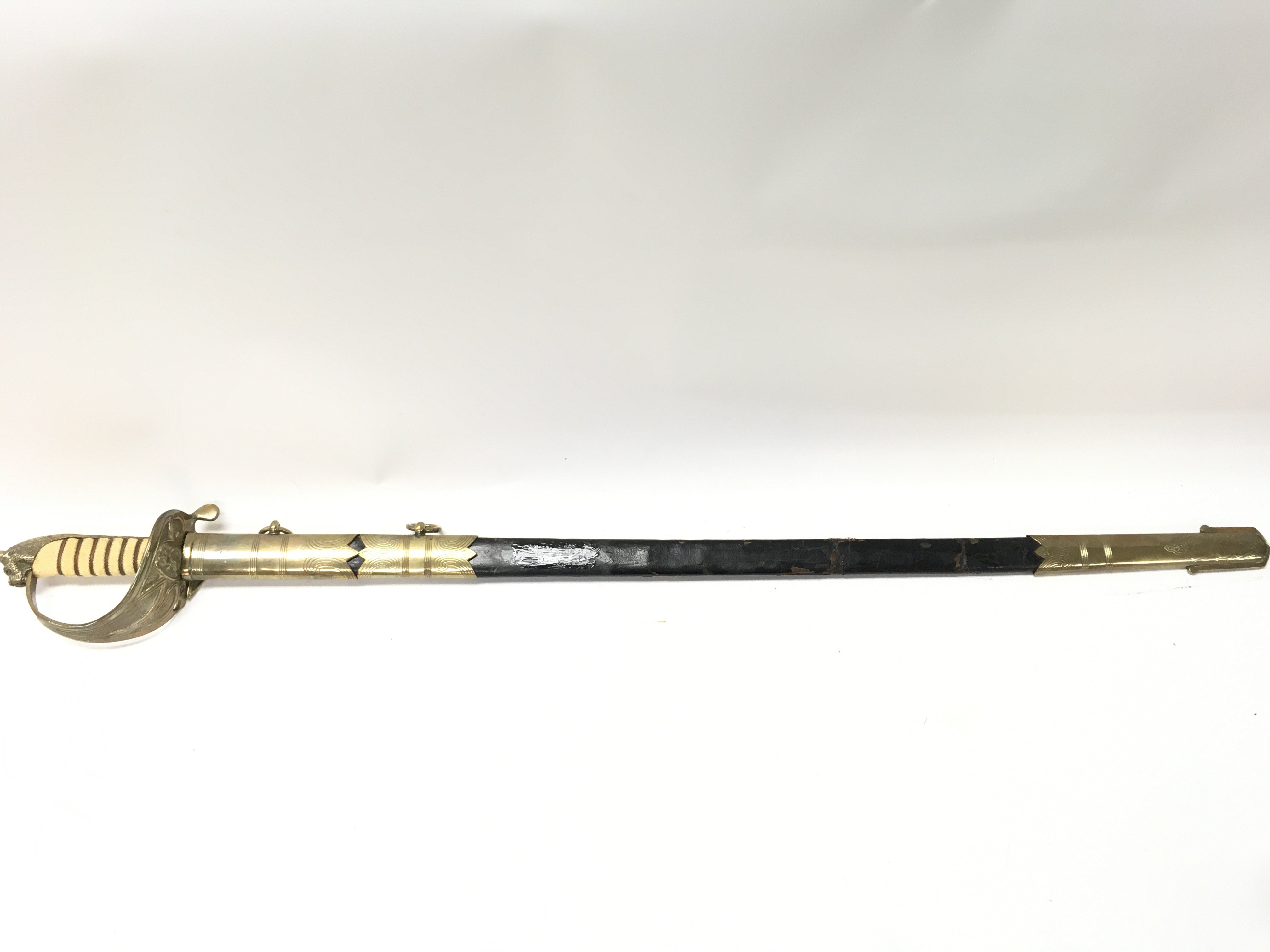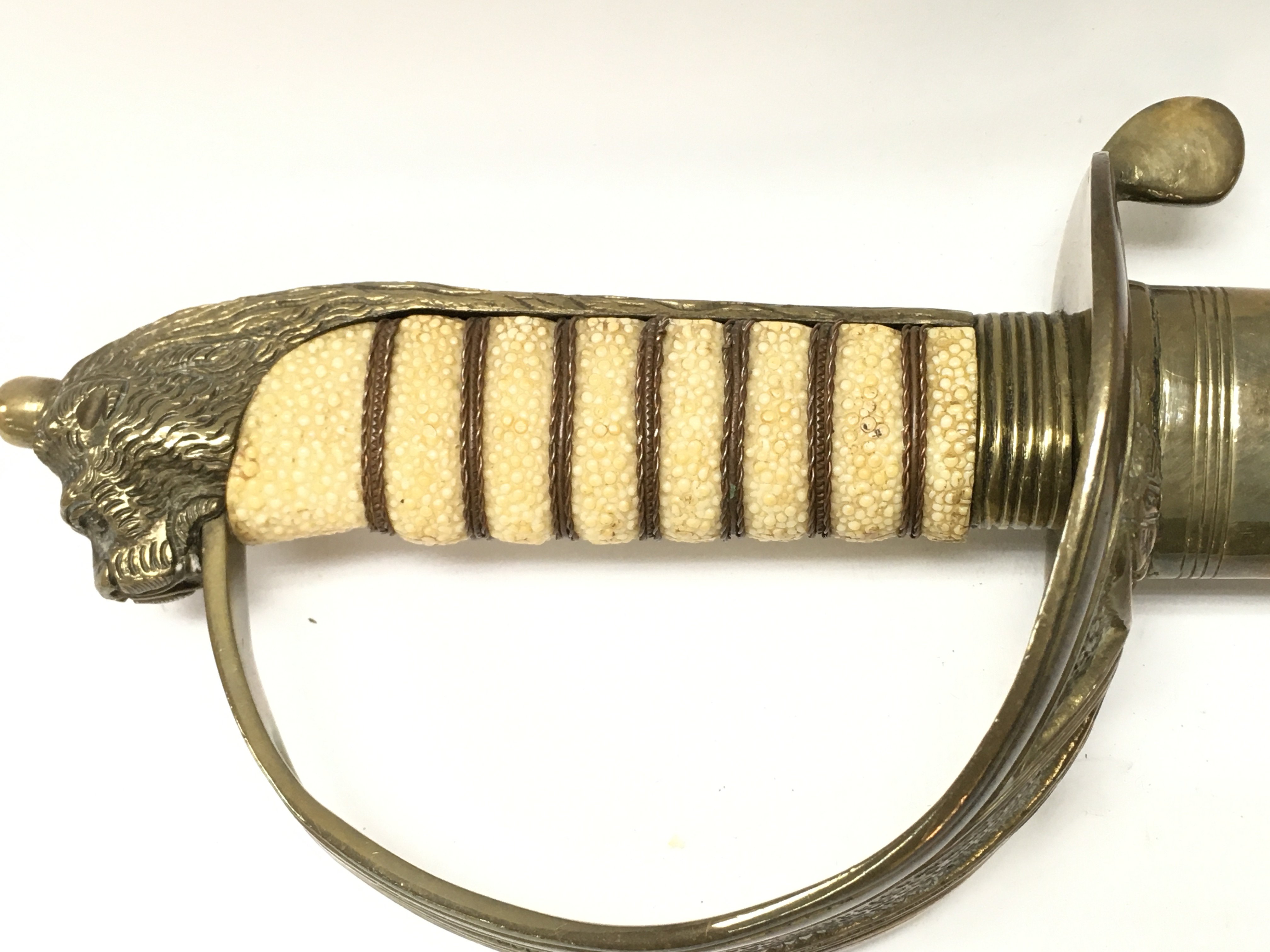 A naval officers dress sword with a brass hilt, lion head pommel, shagreen grip. 94cm total length. Blade 79cm long. This lot cannot be posted