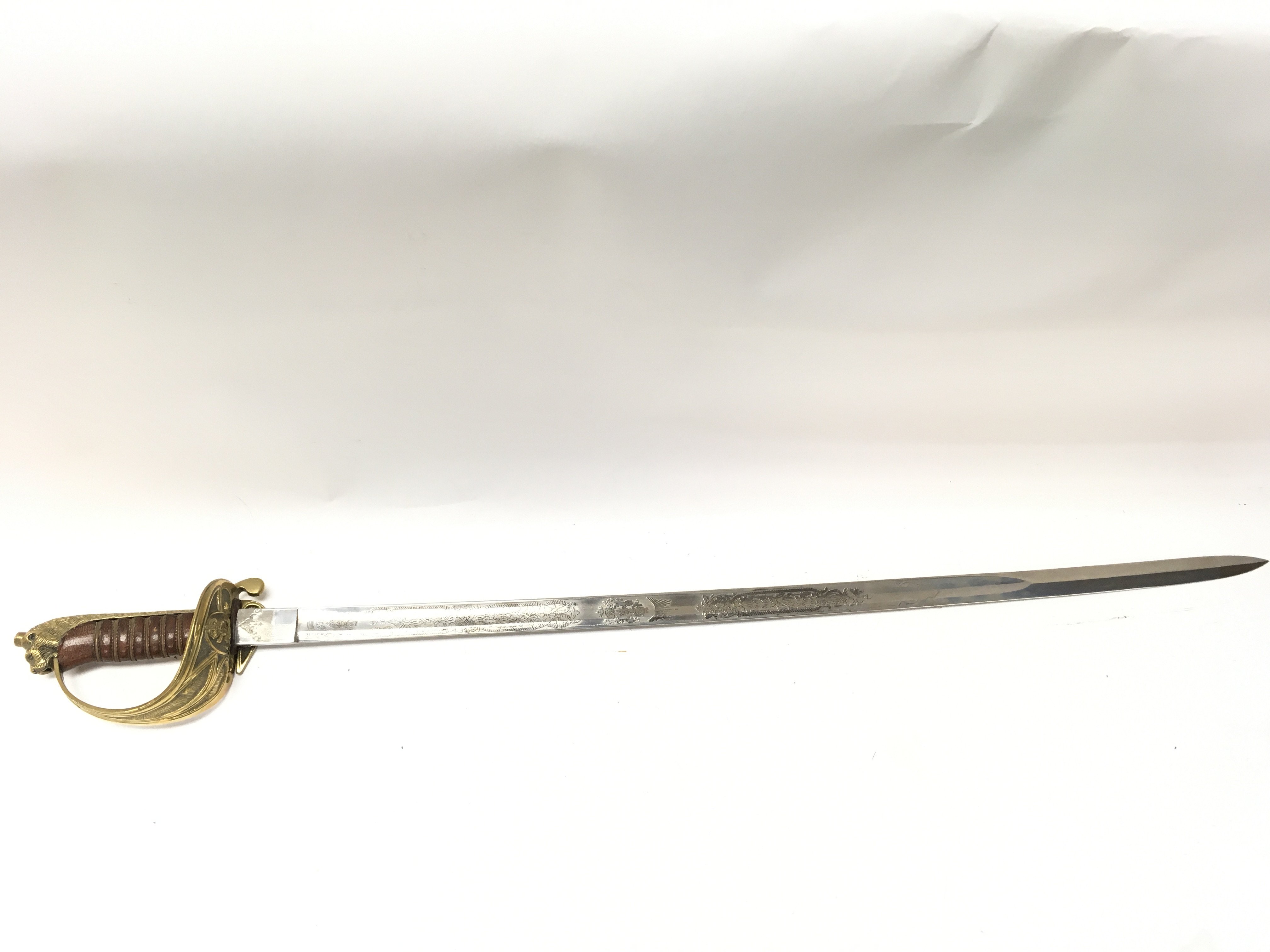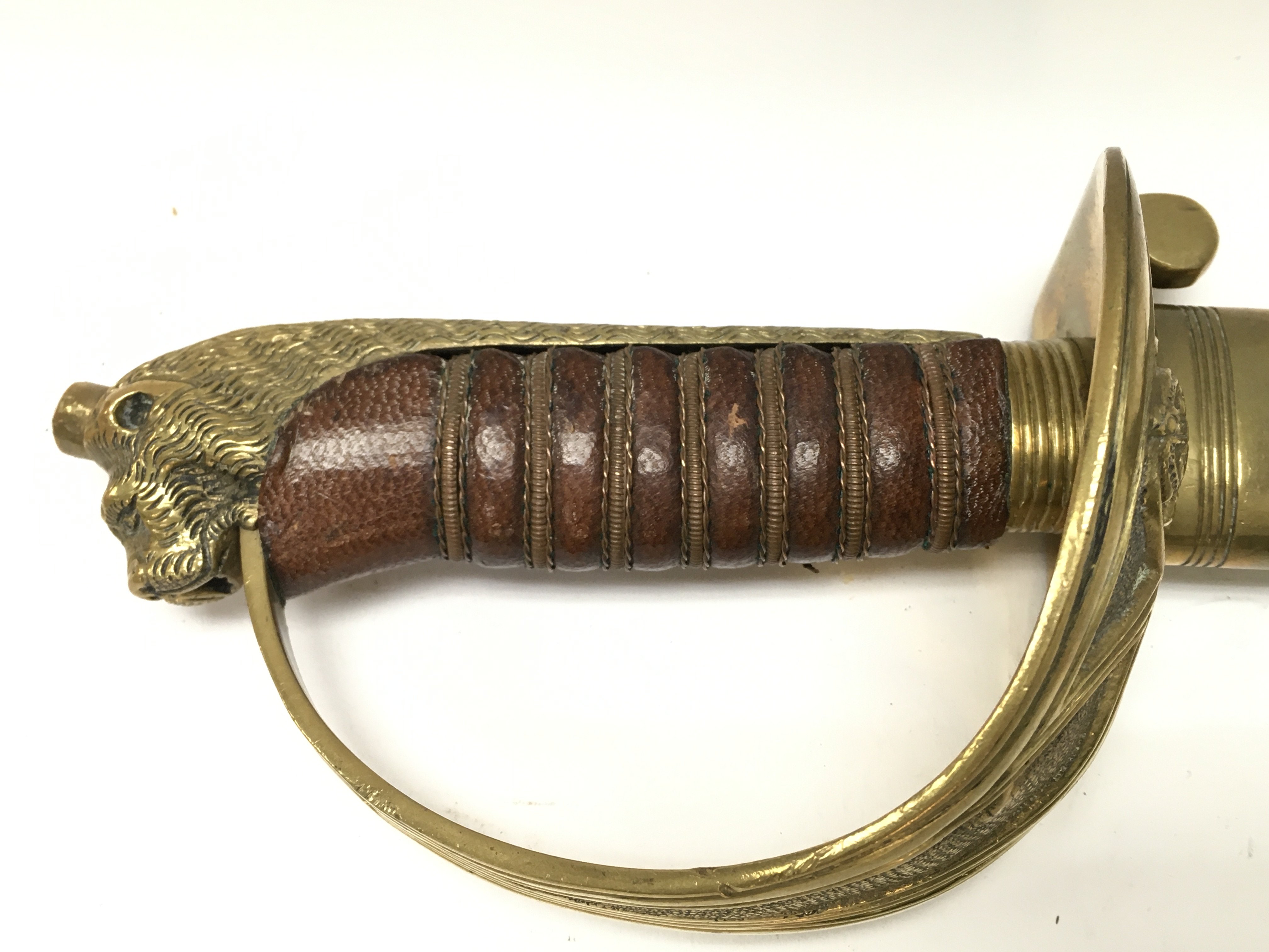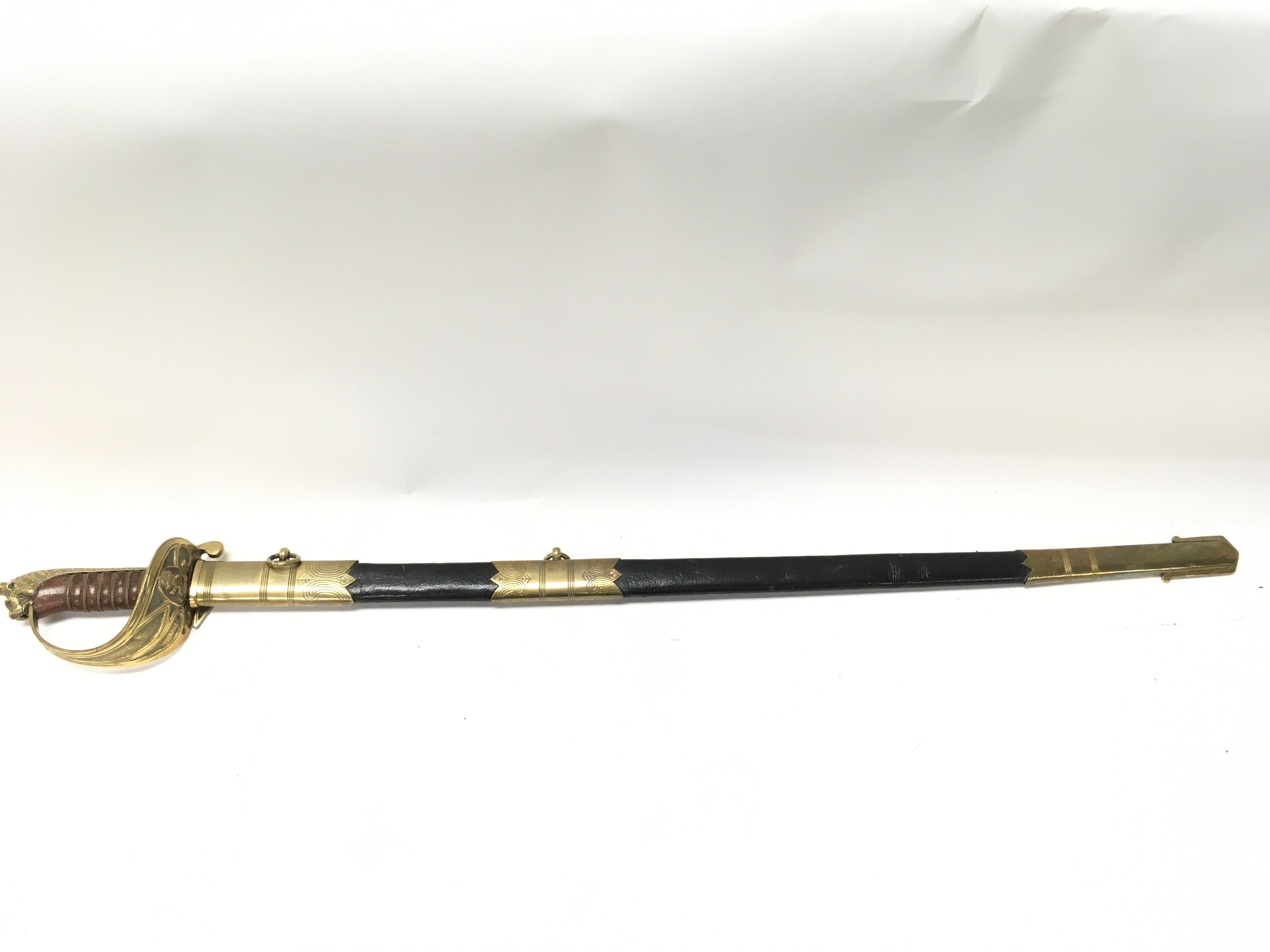 A 20th century naval officers sword with a brown leather grip. Blade 80cm long. 95cm long in total. This lot cannot be posted