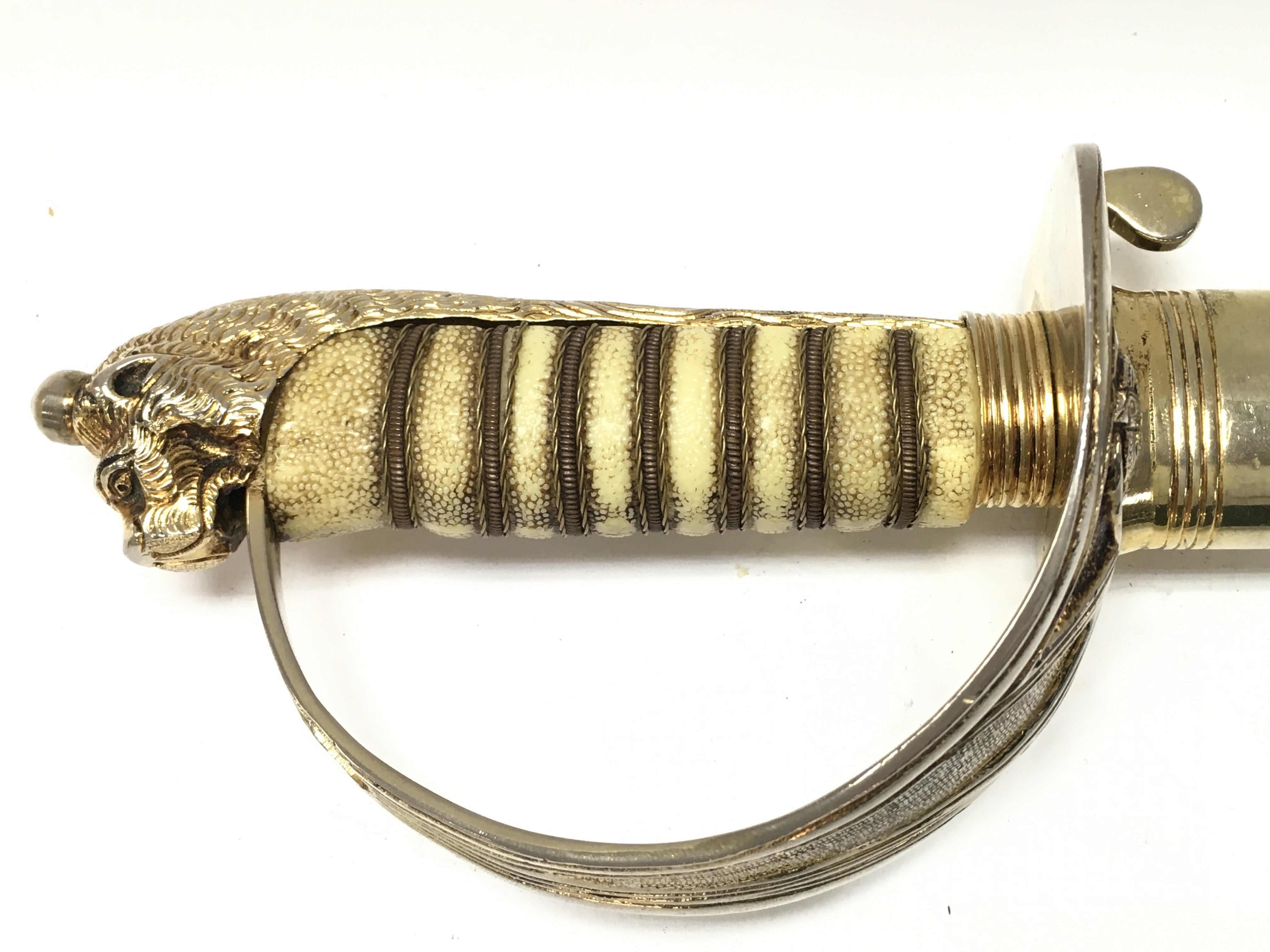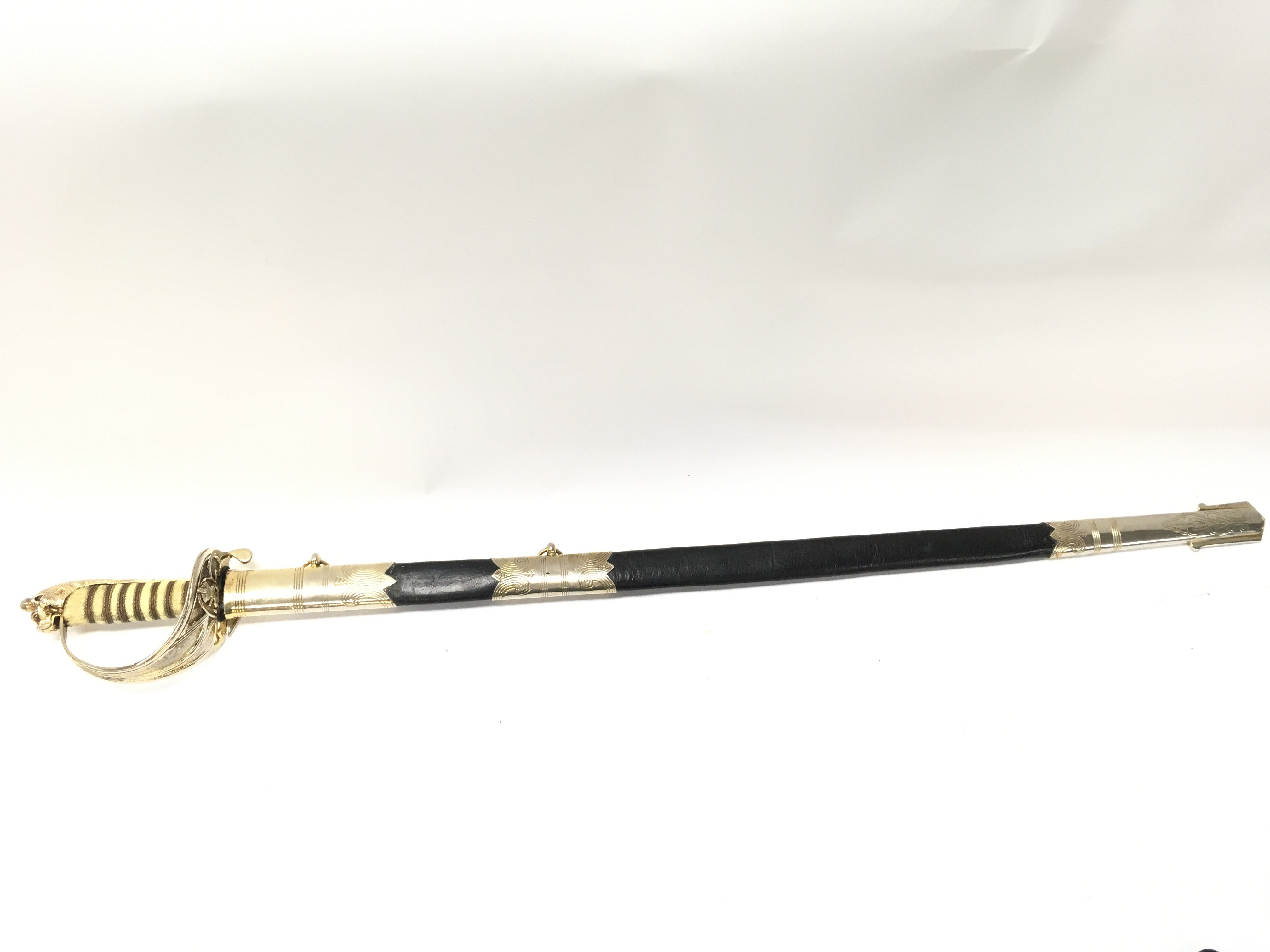 A modern retrospective copy of a naval officer dress sword , 94cm long. Blade Approx 80cm long. This lot cannot be posted