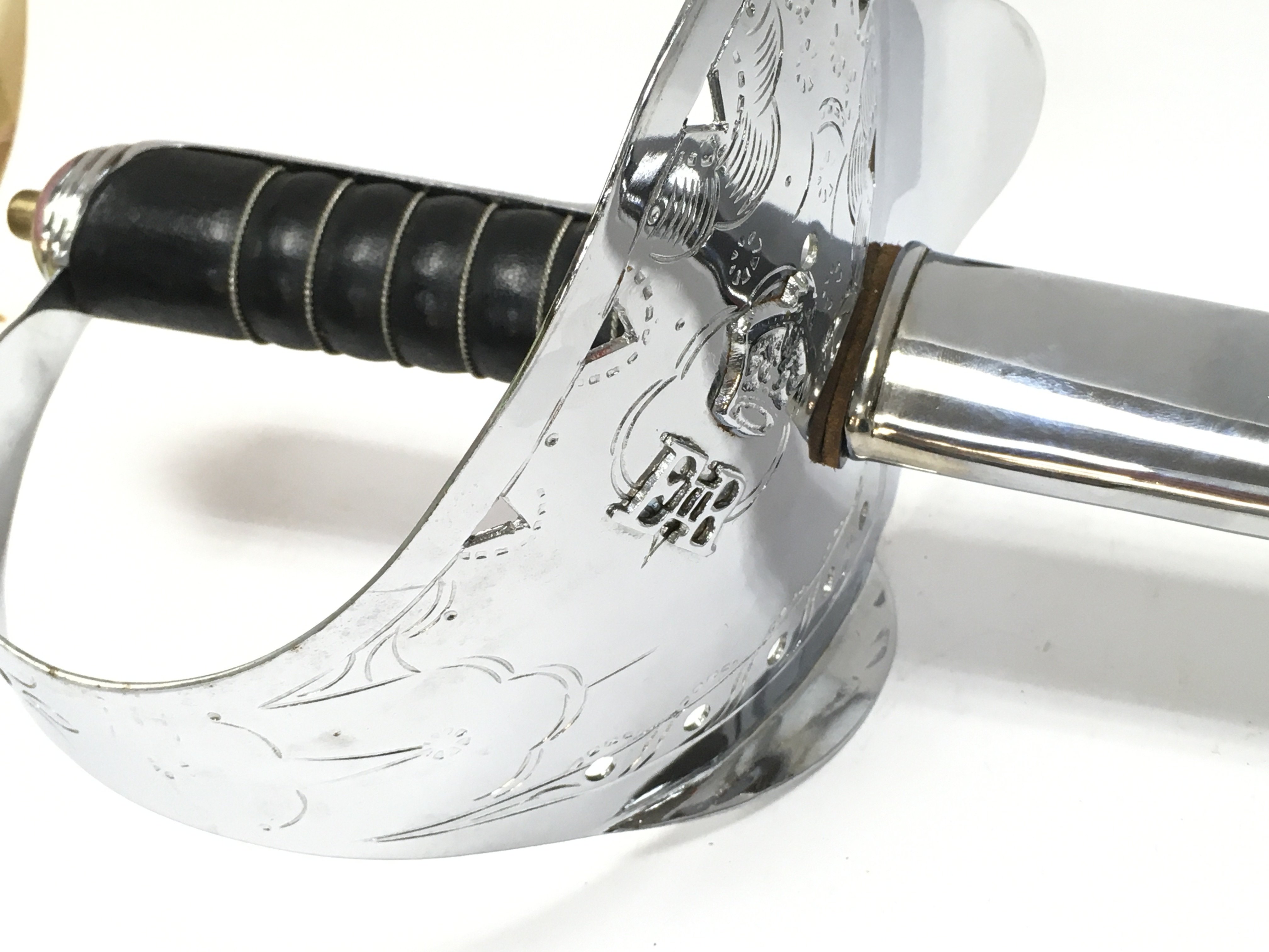 A 19th century sword with a large chrome hand guard and scabbard, black leather grip. Blade 87cm long