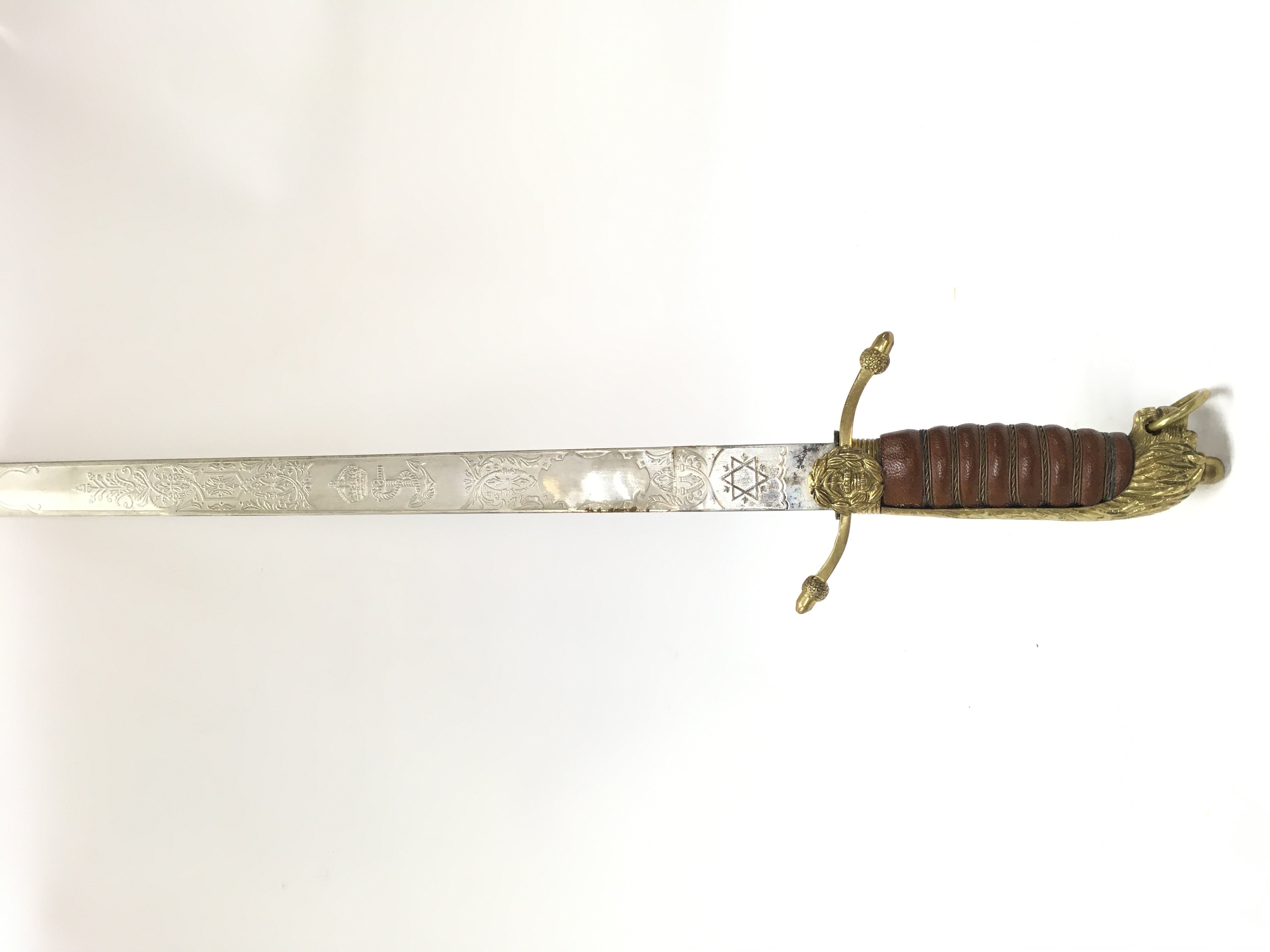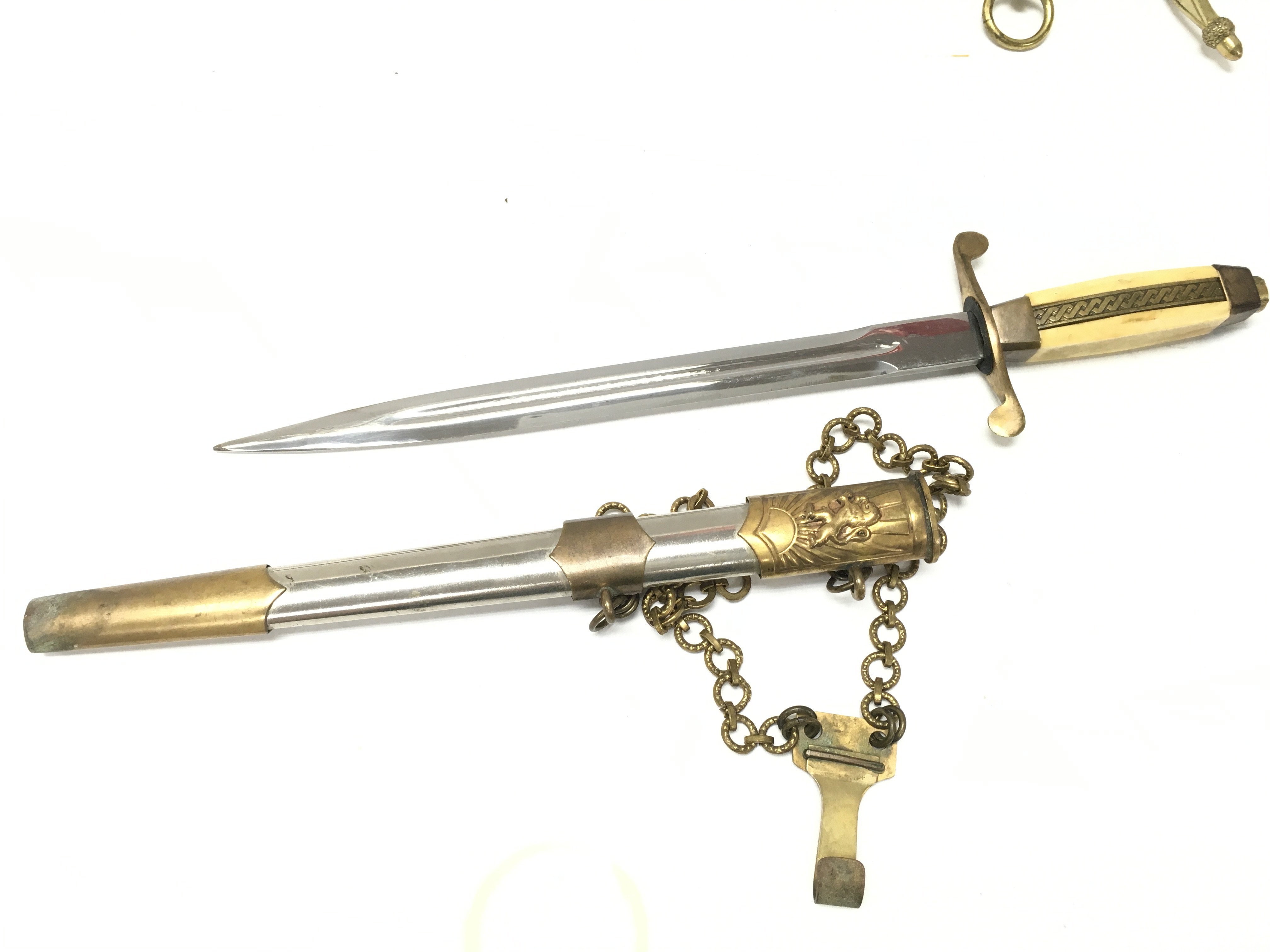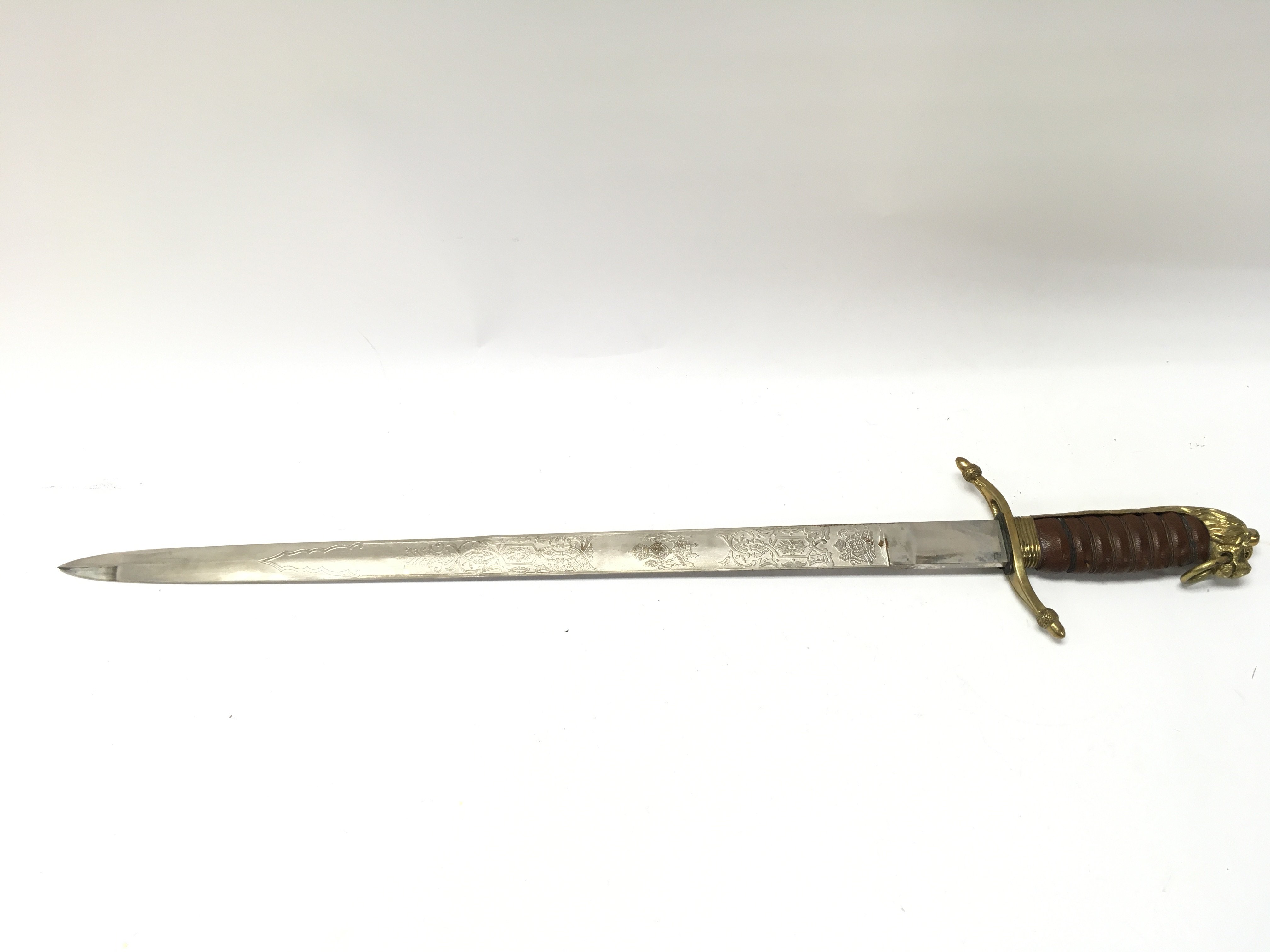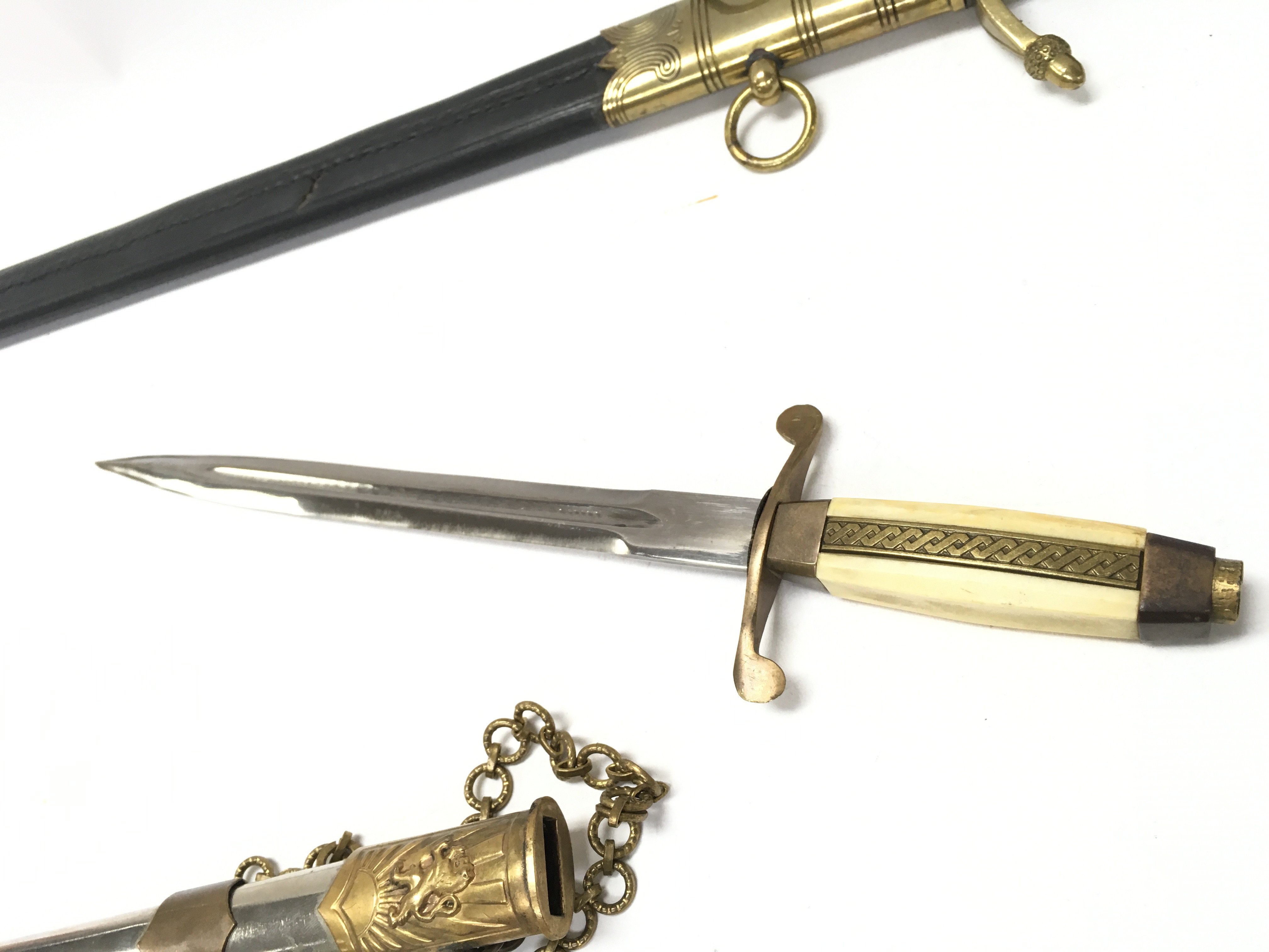A reproduction Bulgarian army dagger (34cm long 25cm long blade) and Repro Naval Officers Dirk with leather grip, brass lion head pommel, acorn cross guard. Total length 64cm ,blade 50cm . Cannot be posted