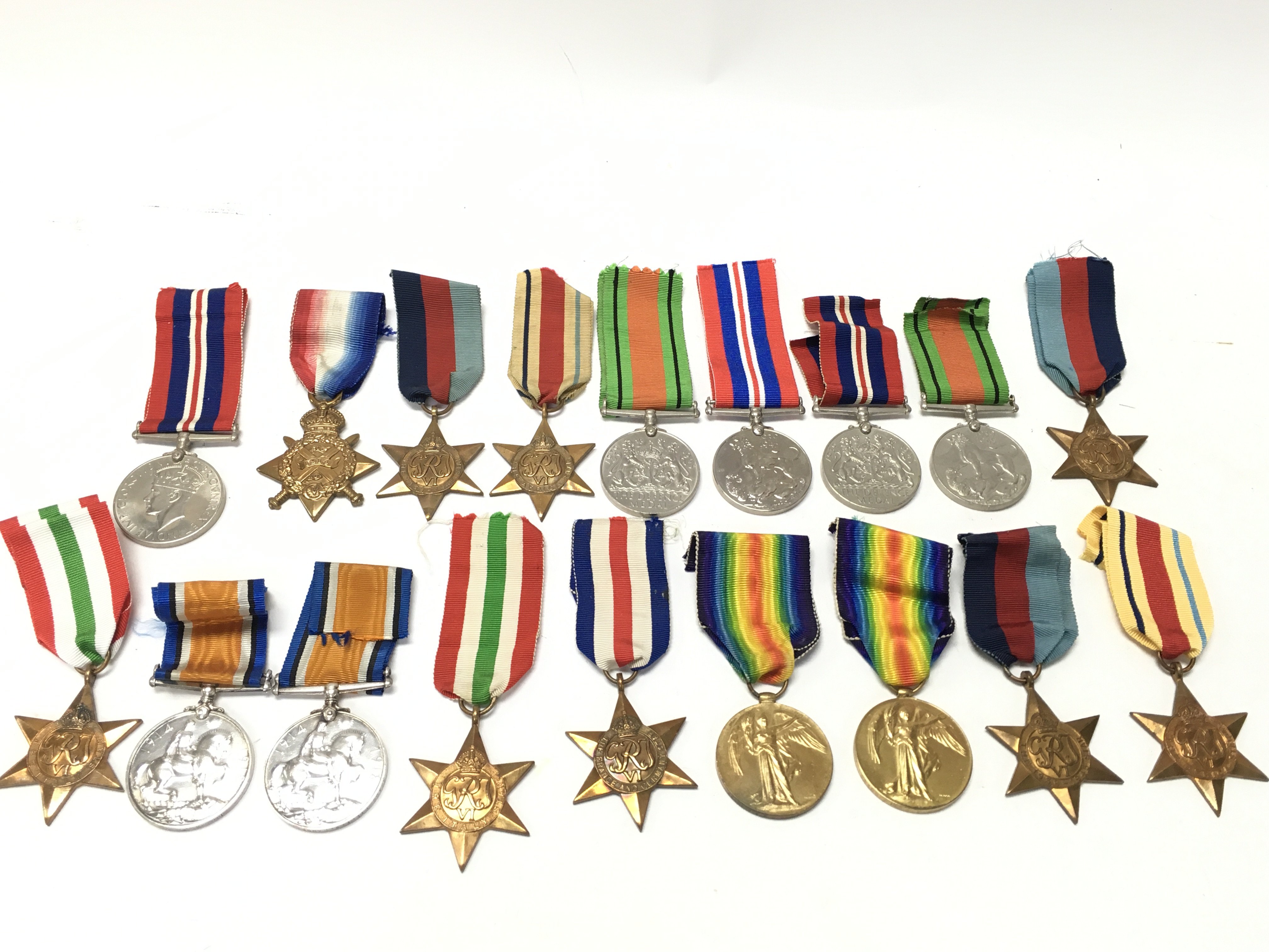 A Collection of WW1 and WW2 medals including Victory, Defence, 1939-45, Africa, France and Germany, Italy, 1914 stars. Presented to 31158 PTE. A.G. Day.G.GDS. , Thomas. J. Veness, 45489 PTE. F.W. Pannell. Suff. R etcPostage category B