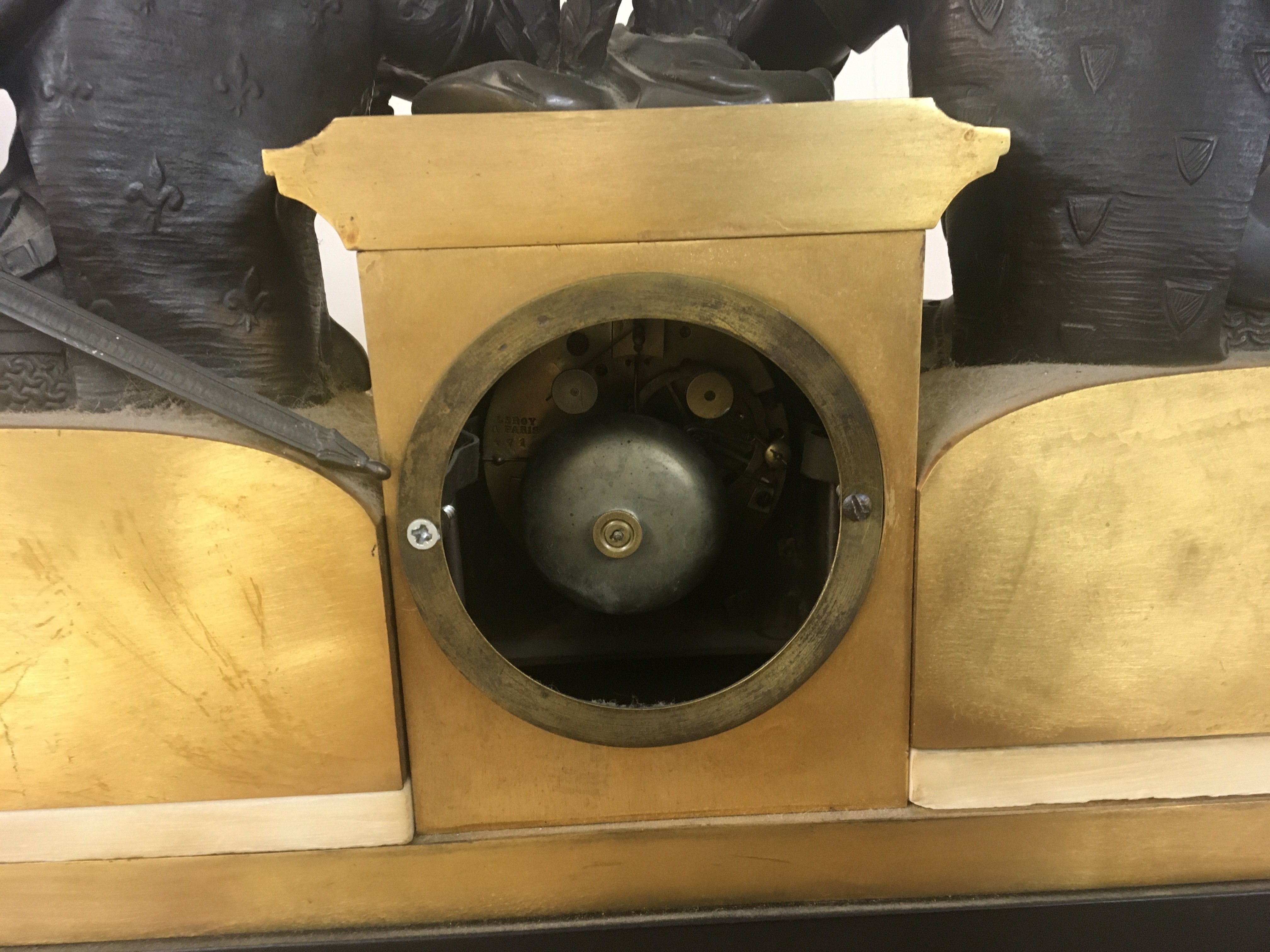 A late 19th century French mantel clock maker LeRoy Paris the gilt metal a d marble vase surmounted with figures of soldiers in armour the movement silk suspension striking on a bell and with makers stamp and numbered 471. With pendulum not seen working. 60cm wide 40cm high
