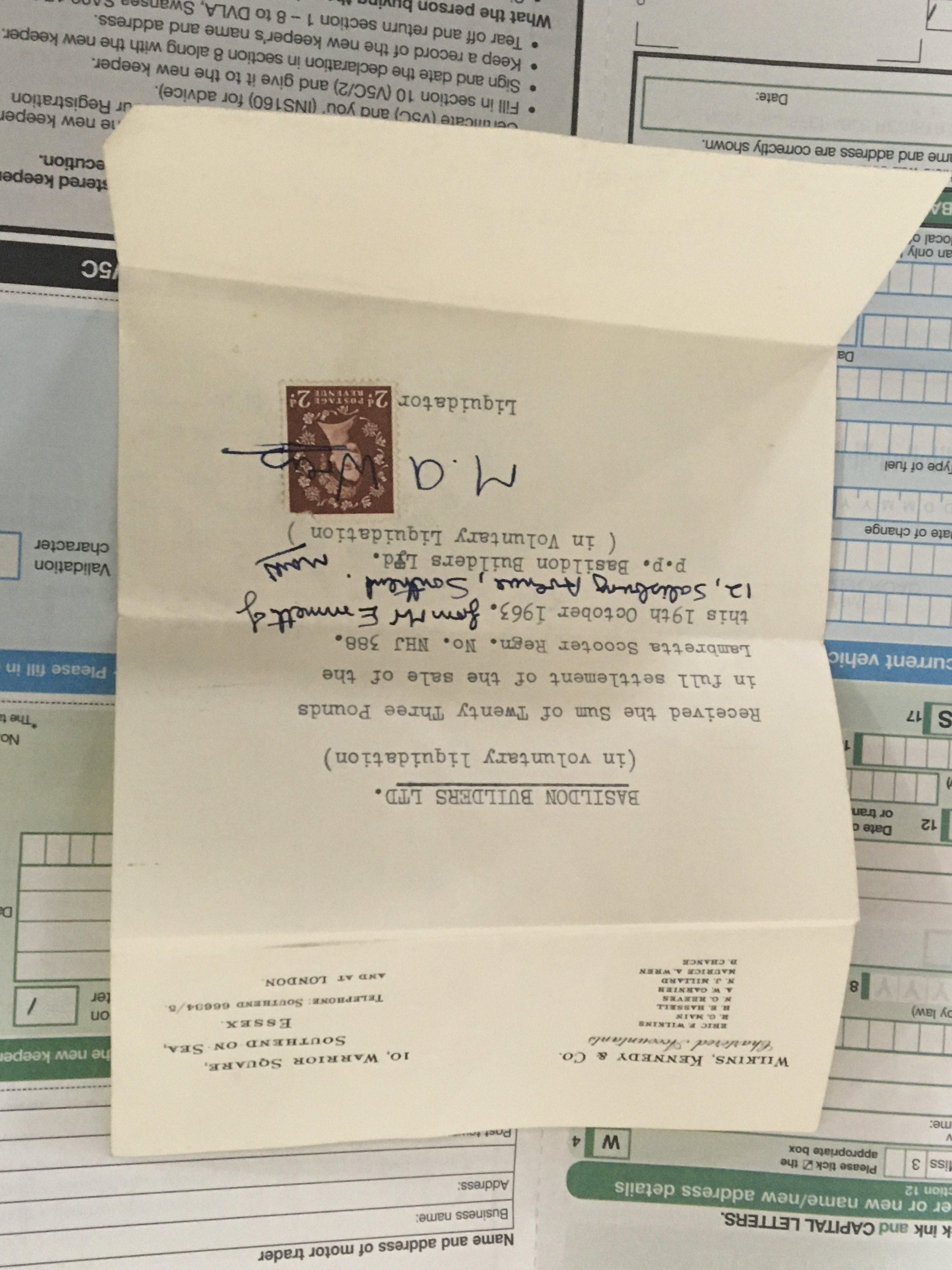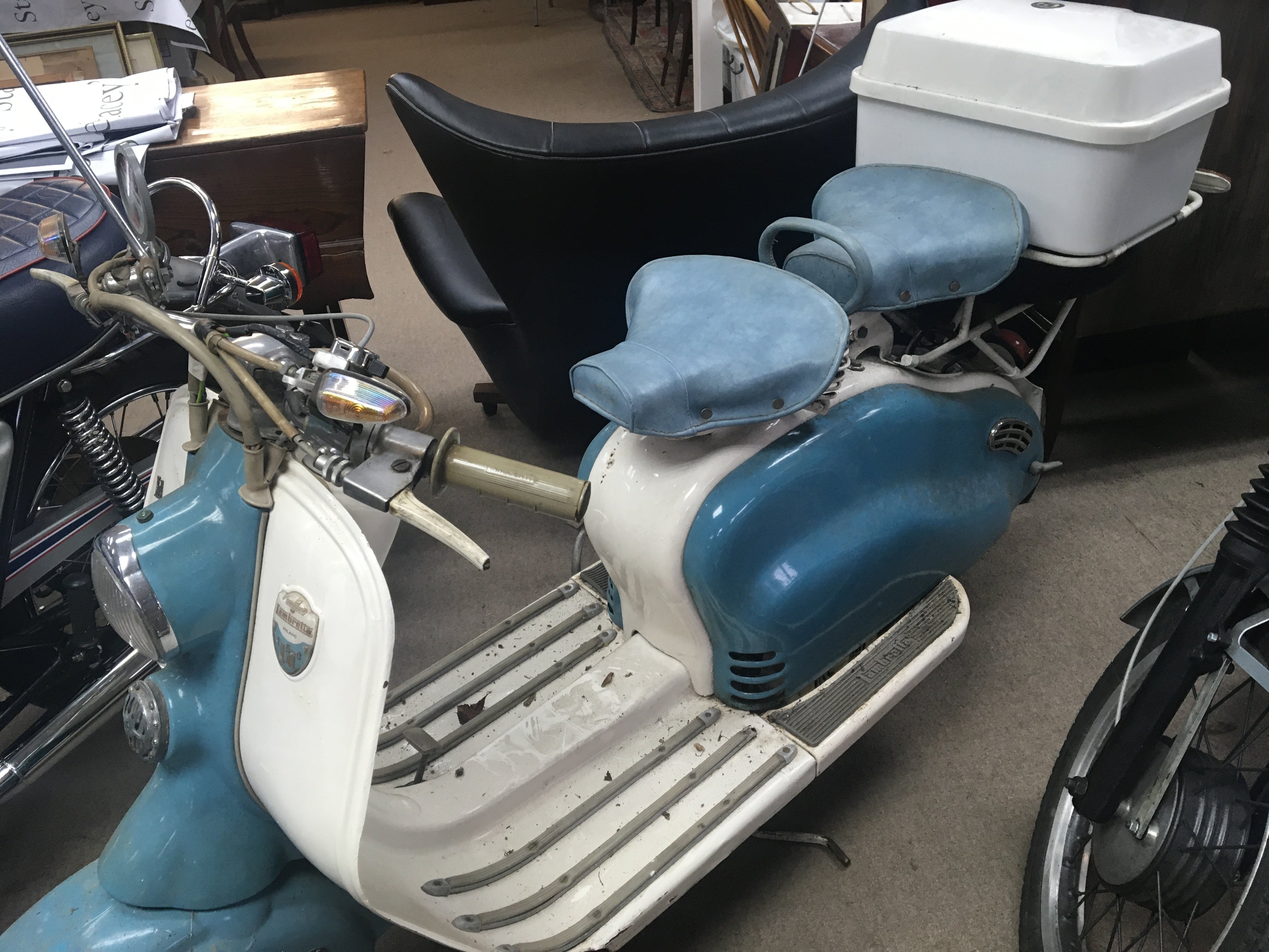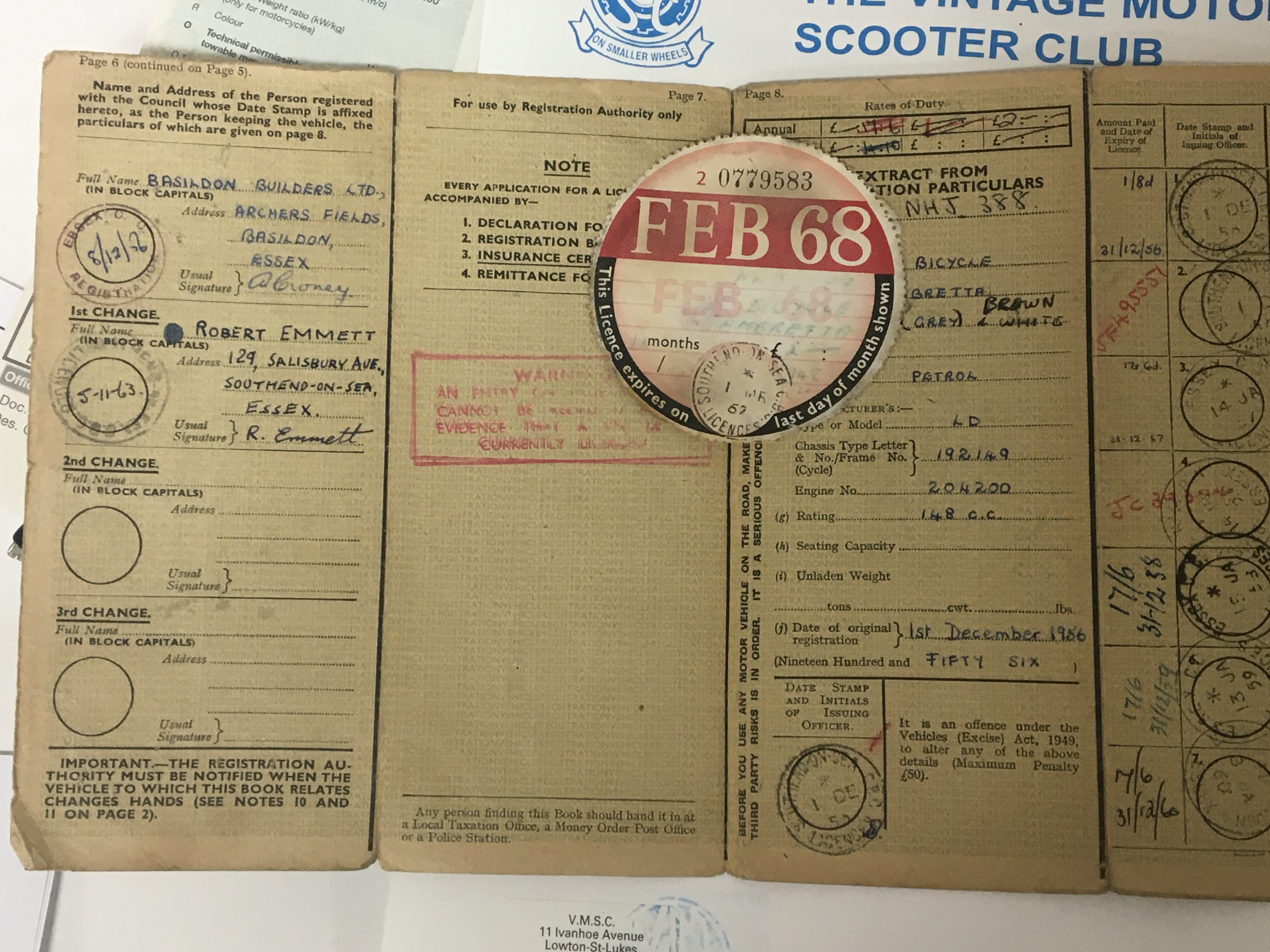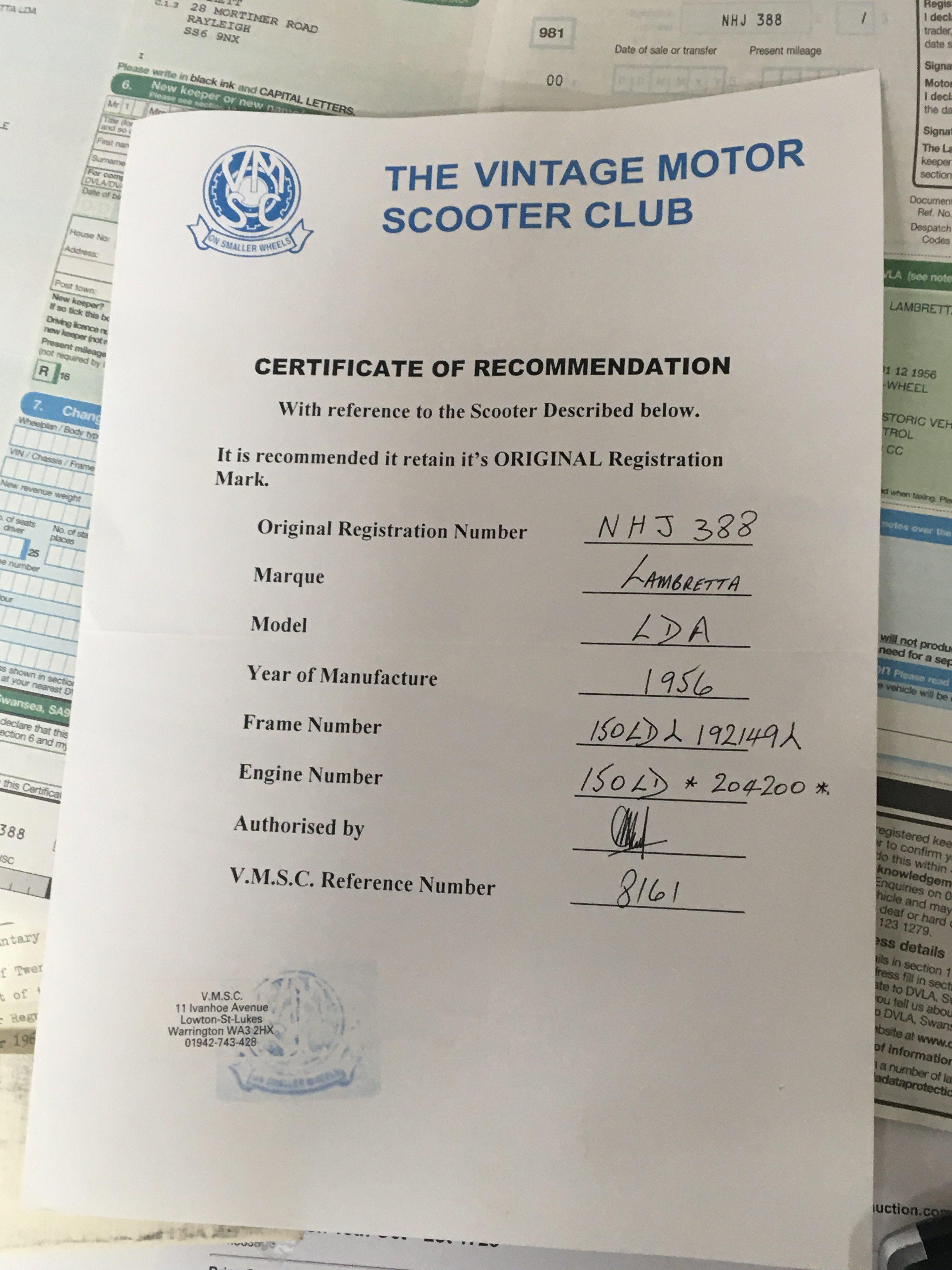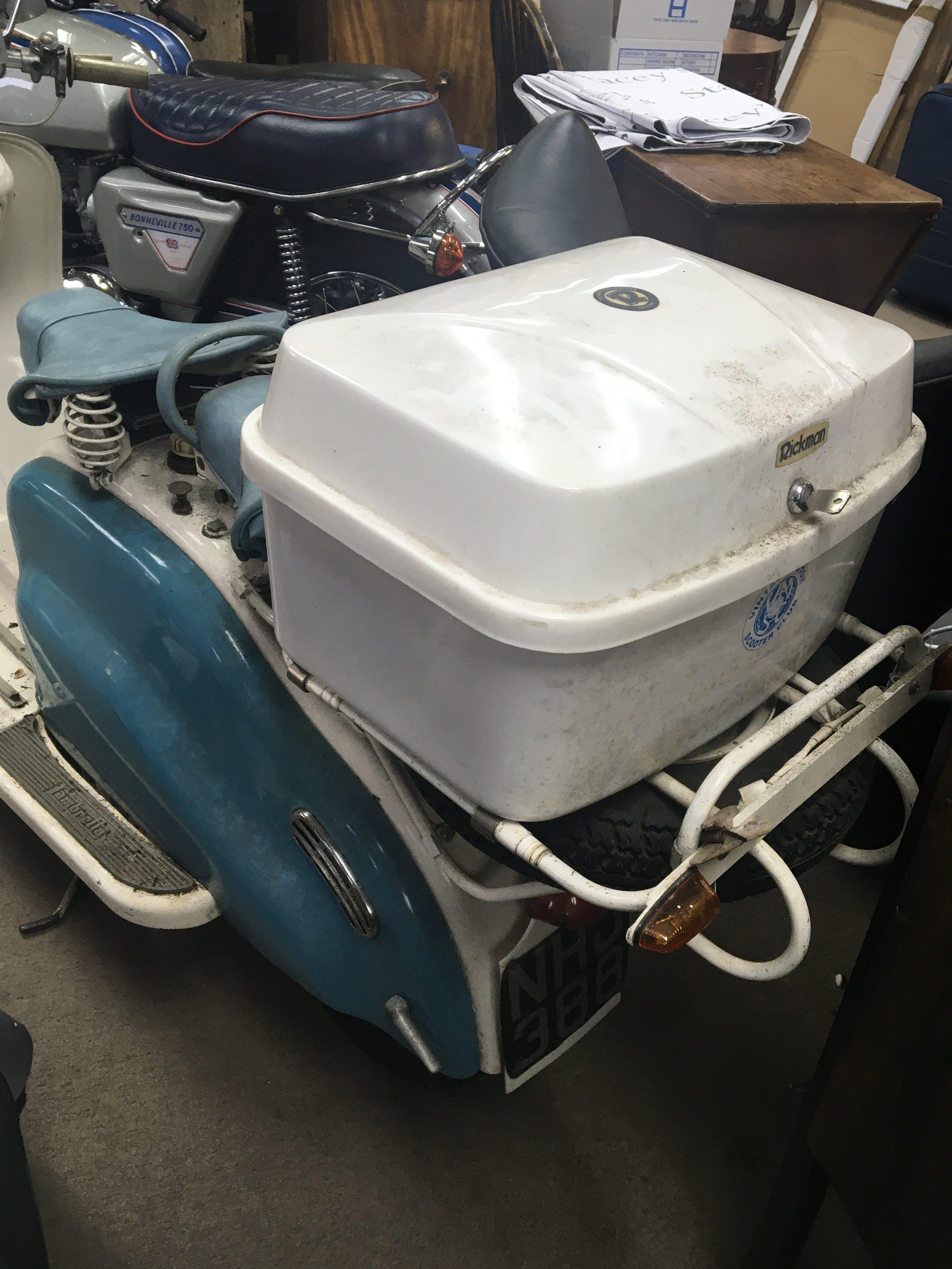 A rare opportunity to Purchase a well maintained and original 1956 Lambretta LDA. Registration NHJ 388. The scoter with double separate seat and finished in original pale blue and white withComes with V5 old and new and historical paperwork including the receipt of purchase by the late owner in 1963. Also included is a certificate from the Vintage Motor Scooter club. Confirming authenticity of originality including details of frame and engine number. In very good condition the only additions being electric start and small indicators and back storage box.