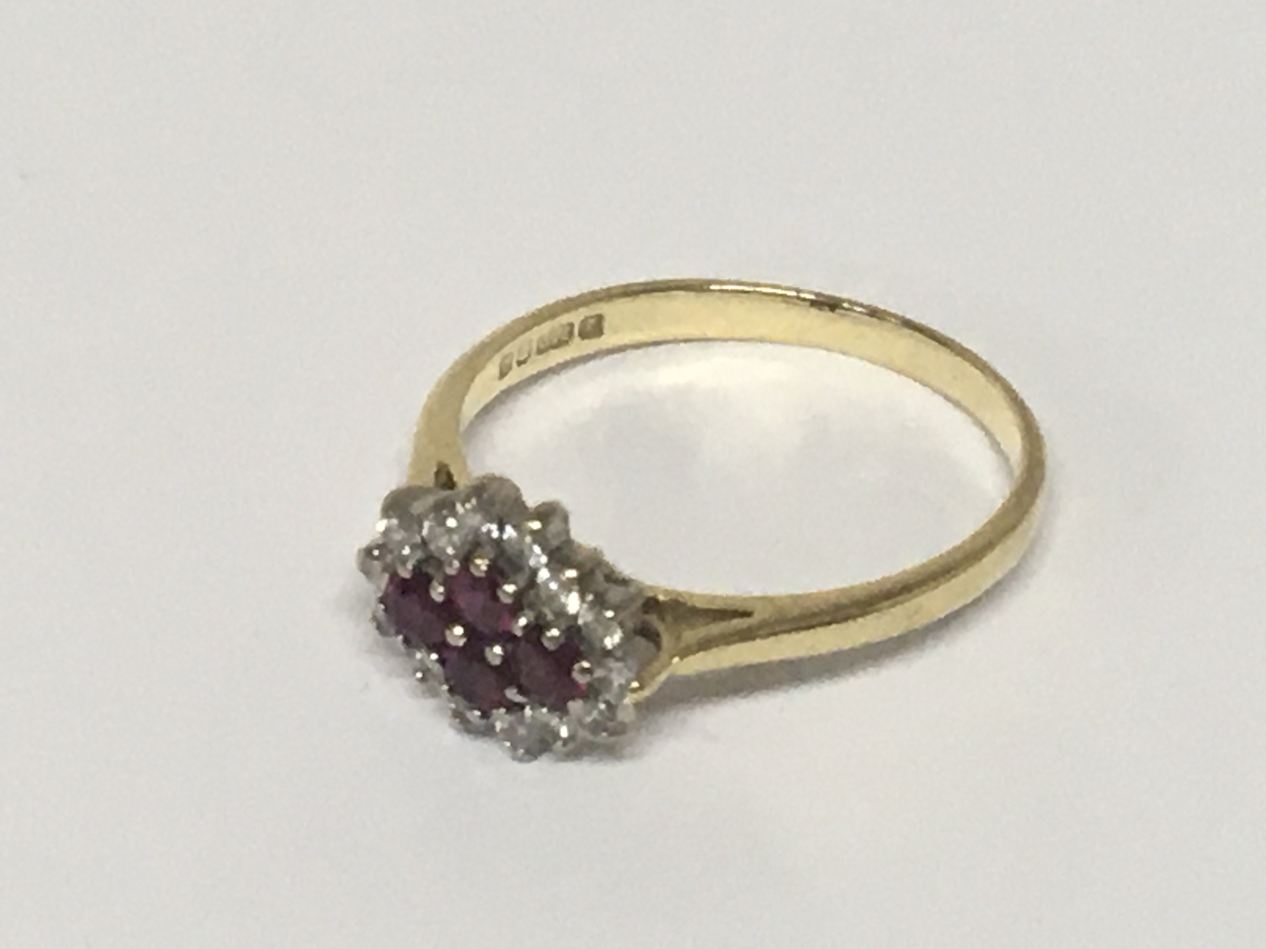 An 18carat gold ring set with a pattern of four ruby flanked by brilliant cut diamonds. Weight 3g ring size R.