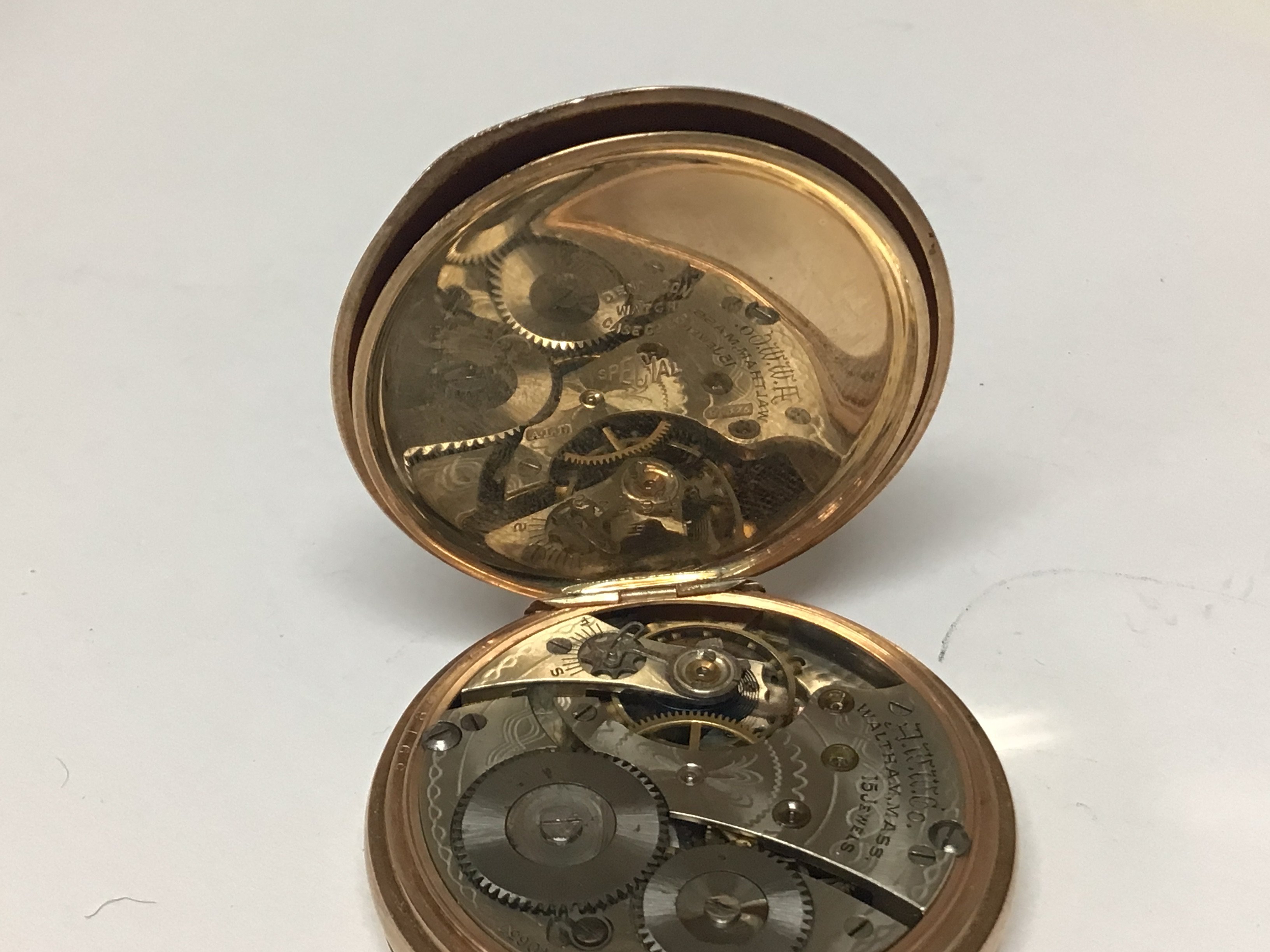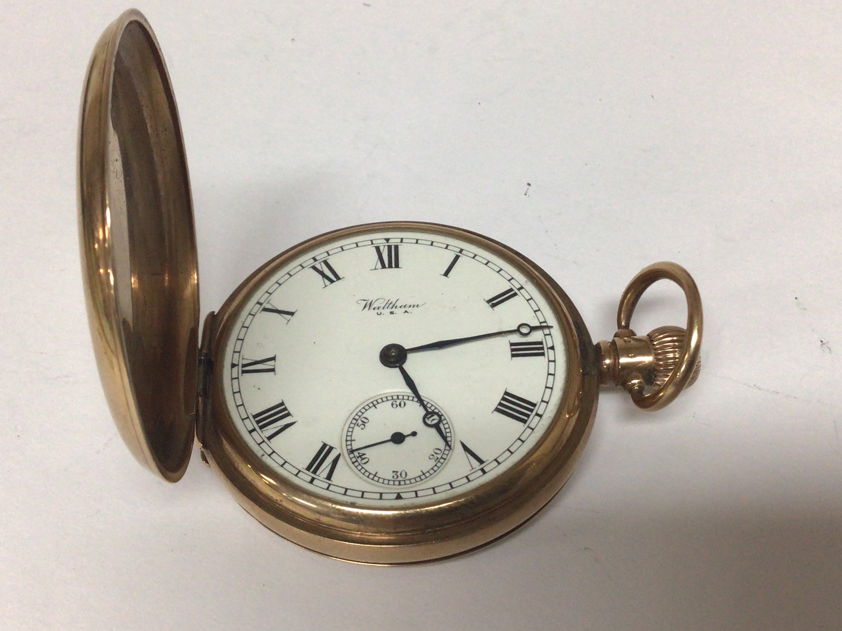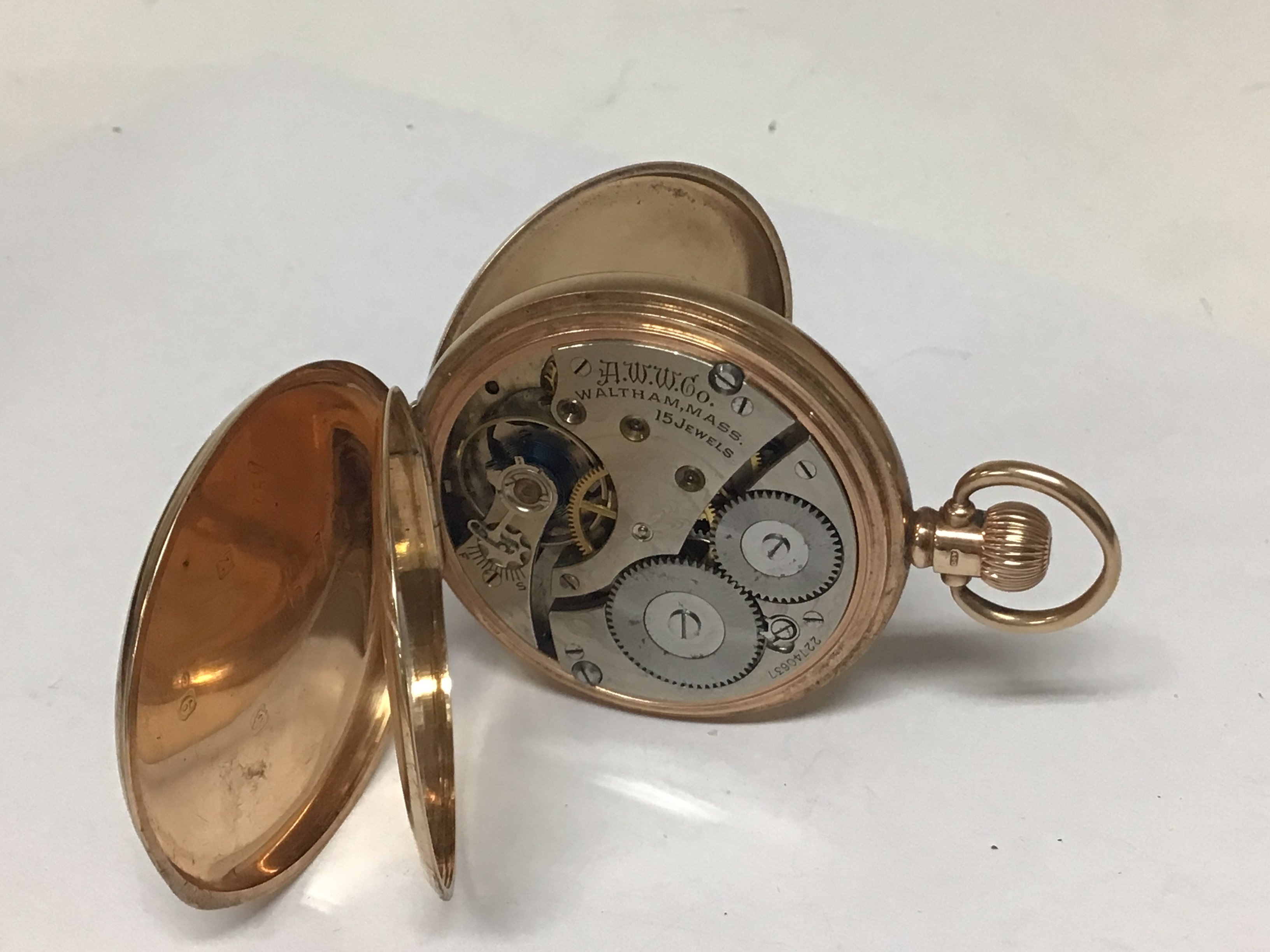 A 9carat gold hunter pocket watch maker Waltham USA button wind and seen working no personal inscriptions and an inner 9ct gold back plate watch serial number 22740637. Total weight 93.5g