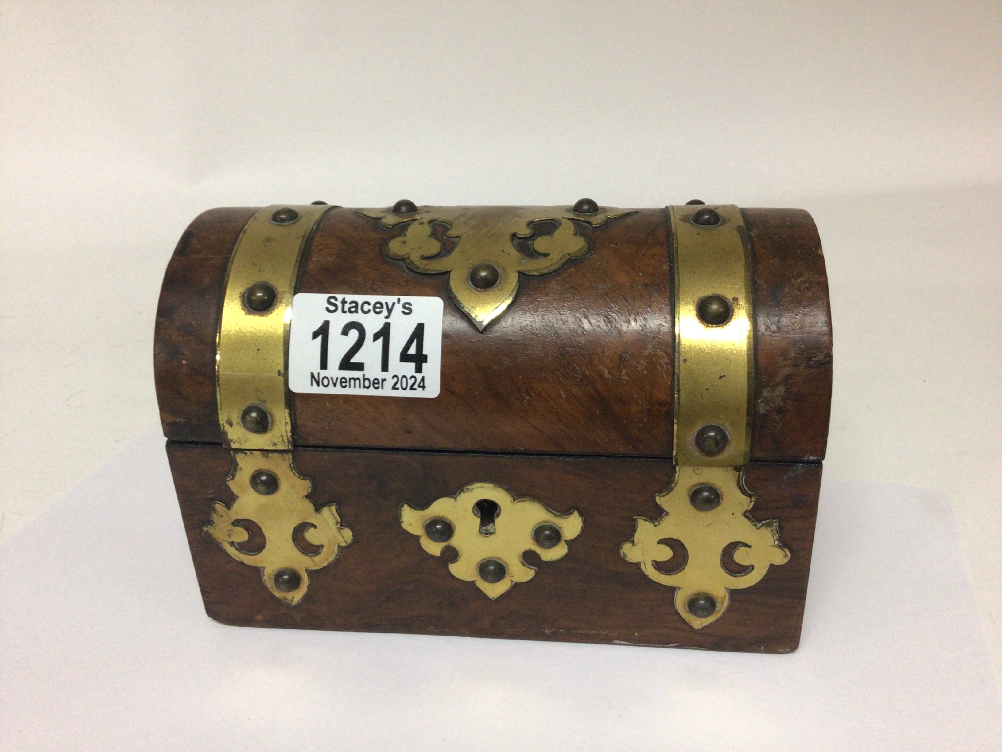 A Victorian walnut dome top and brass bound trinket box 16cm wide.