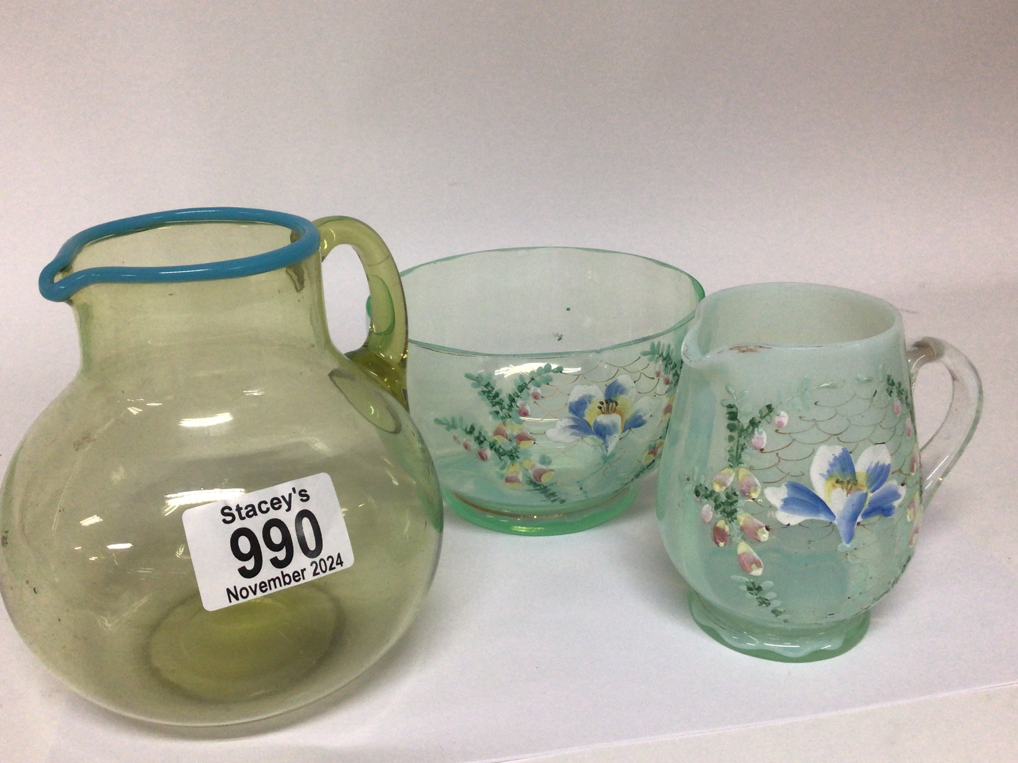A late Victorian enamel decorated glass bowl and jug and one other jug. (3)
