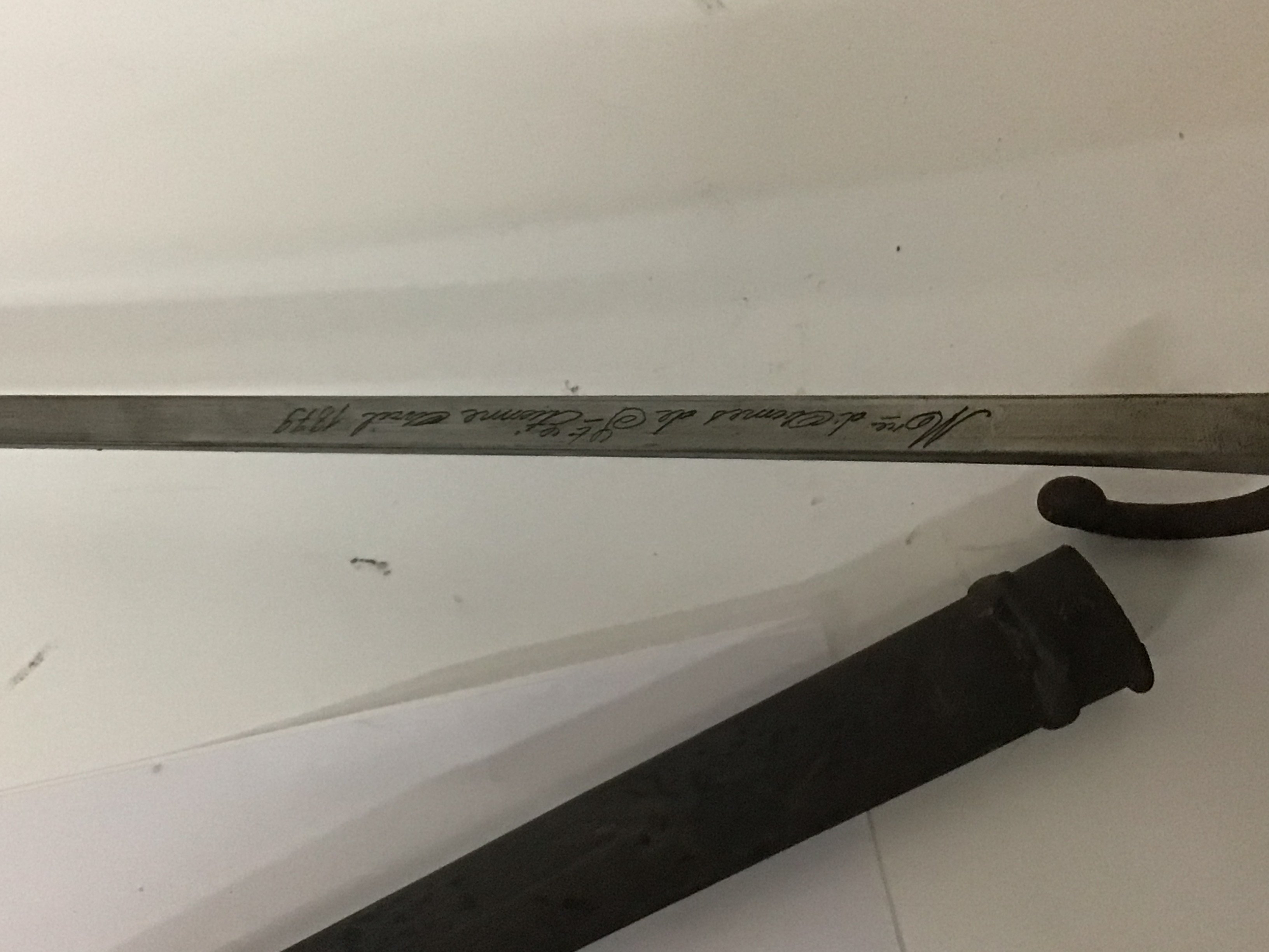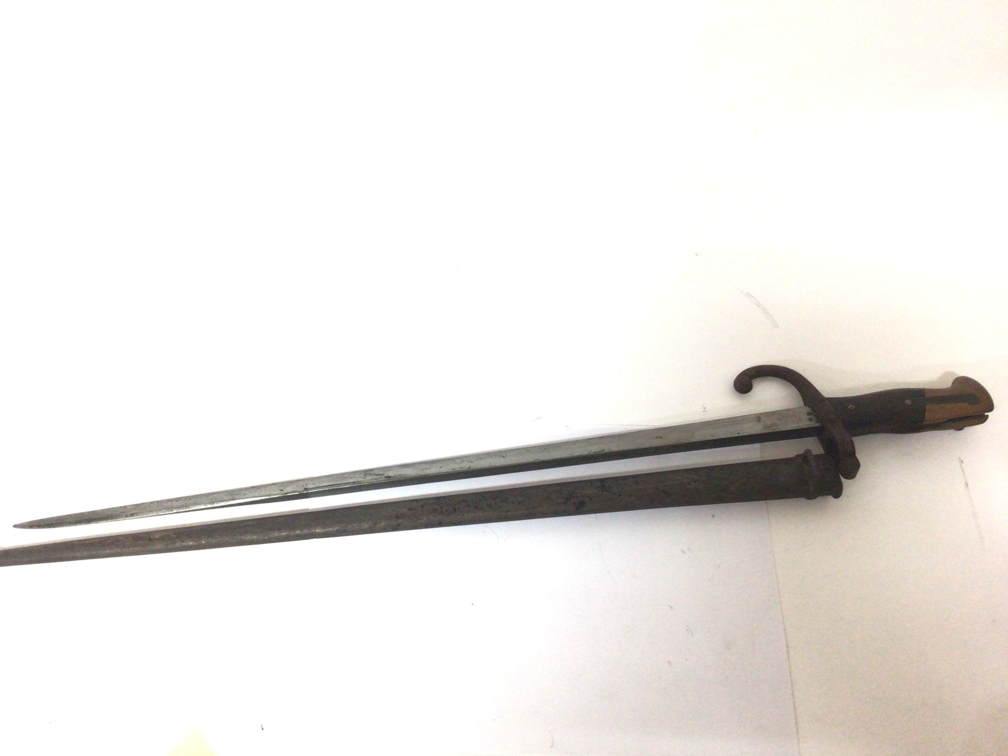 A French 1879 pattern bayonet the steel blade edge with an inscription.