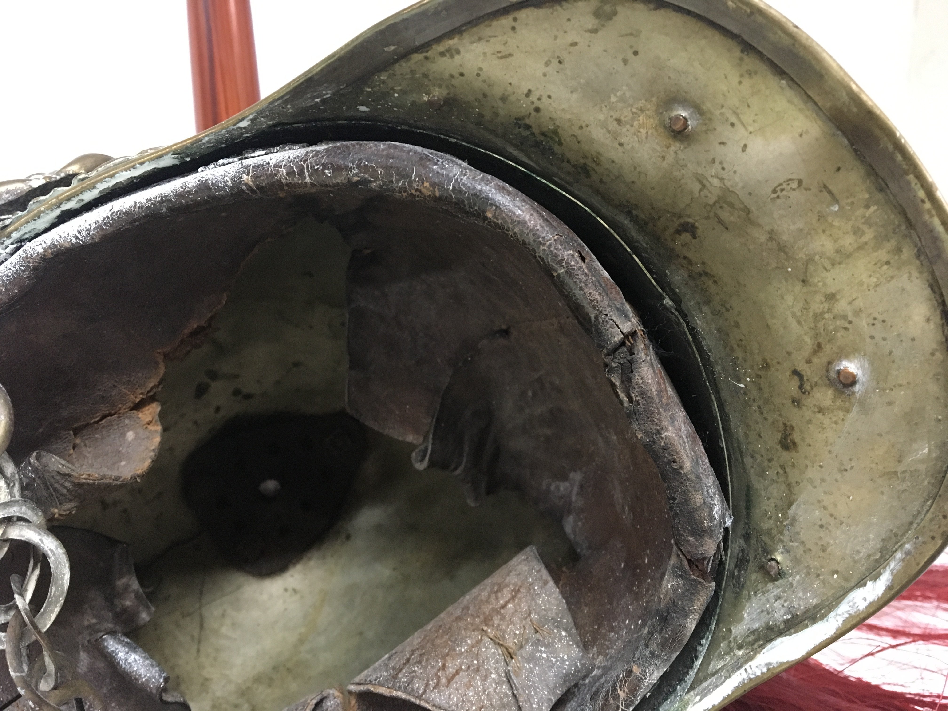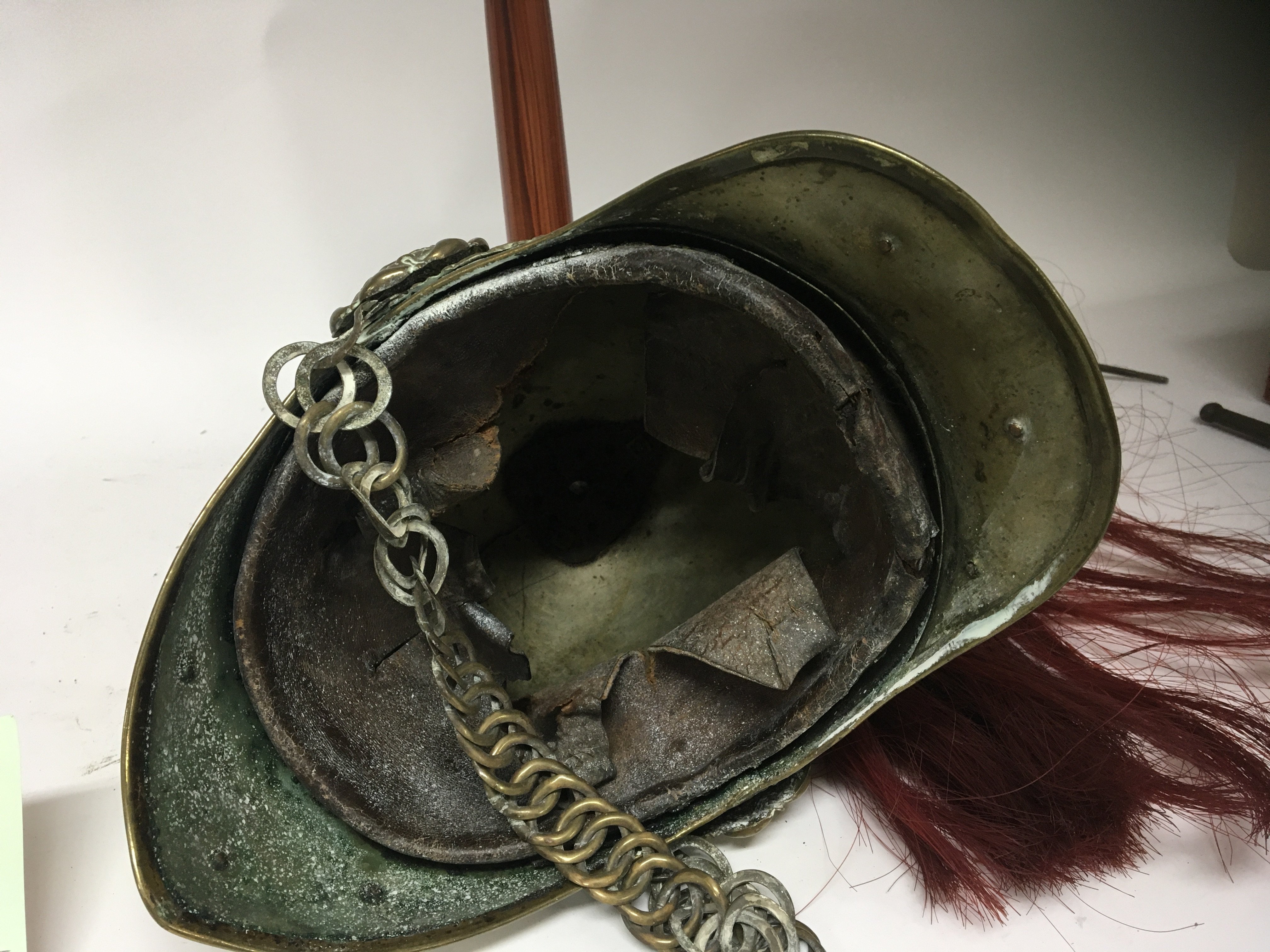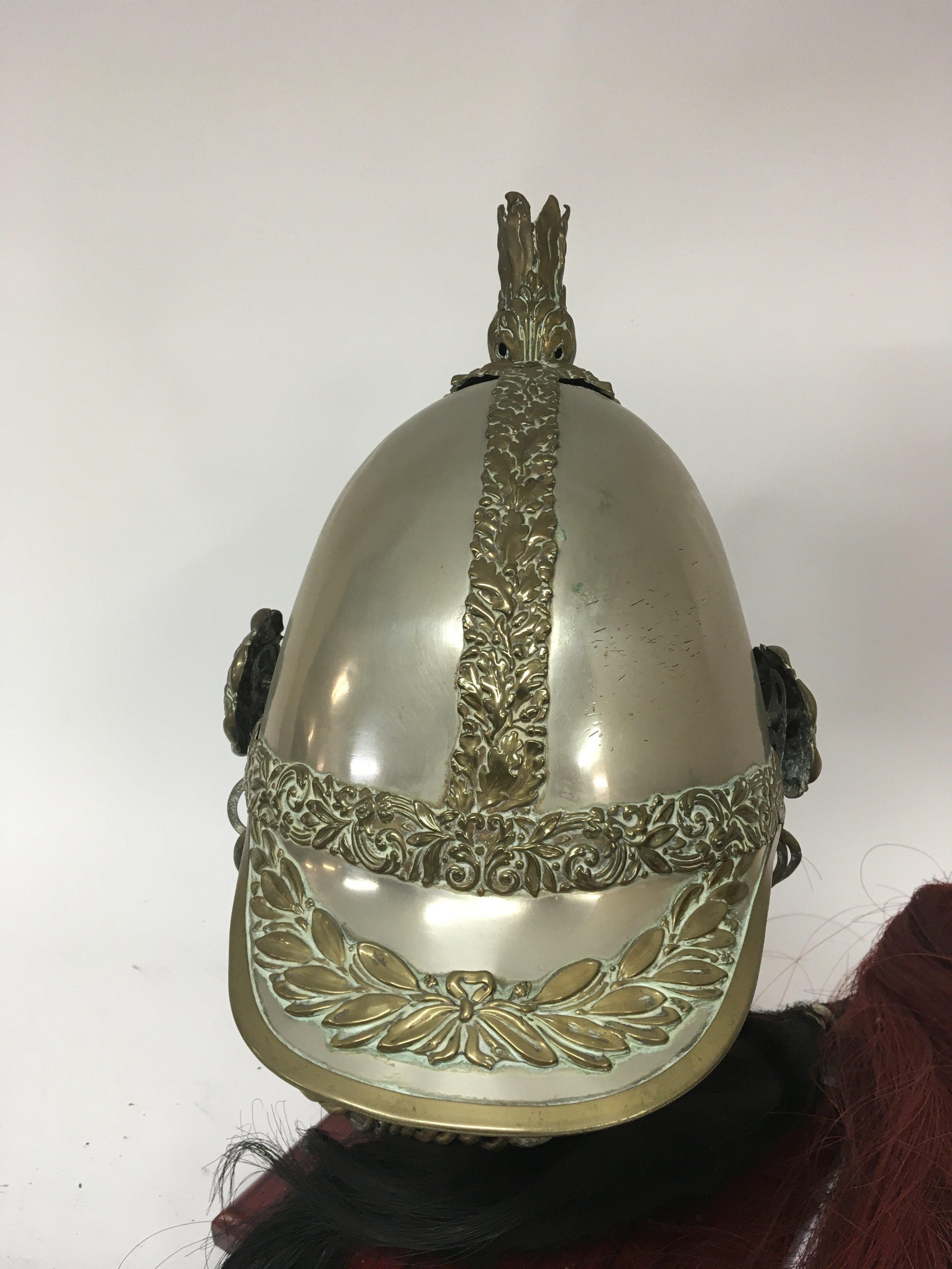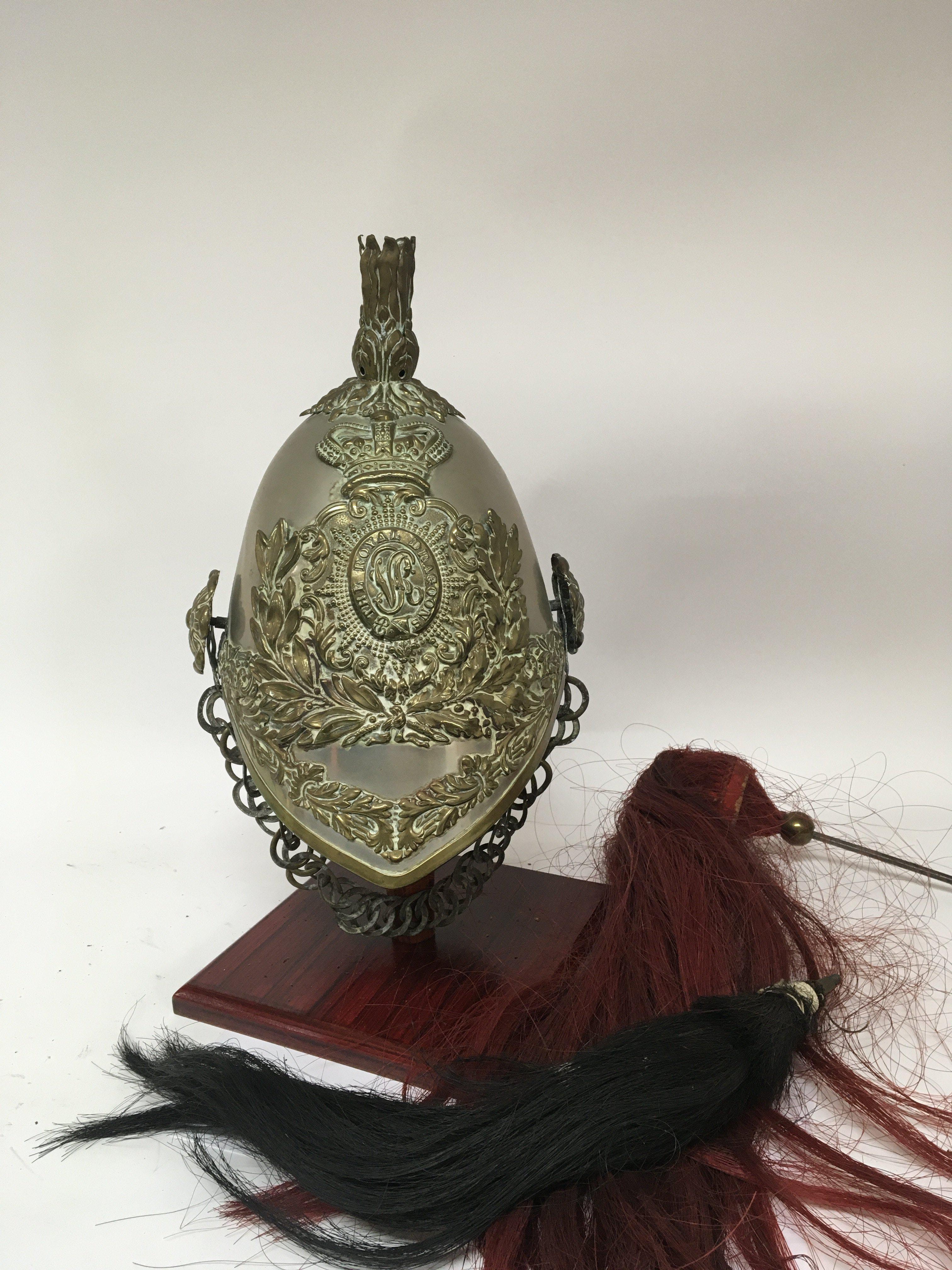 A Victorian Military brass mounted and metal helmet The Royal Dragoons. With chain Mail open link chin strap and two associated plumes.