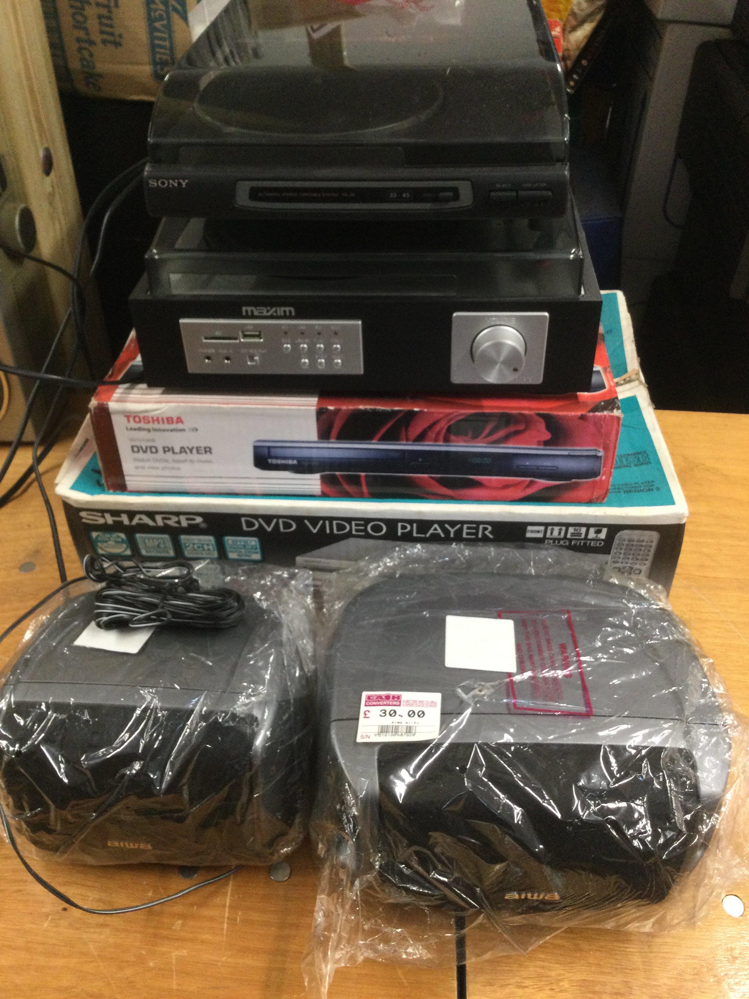 Two turntables comprising a Maxim and a Sony example, two boxed DVD players and two Aiwa speakers (6).