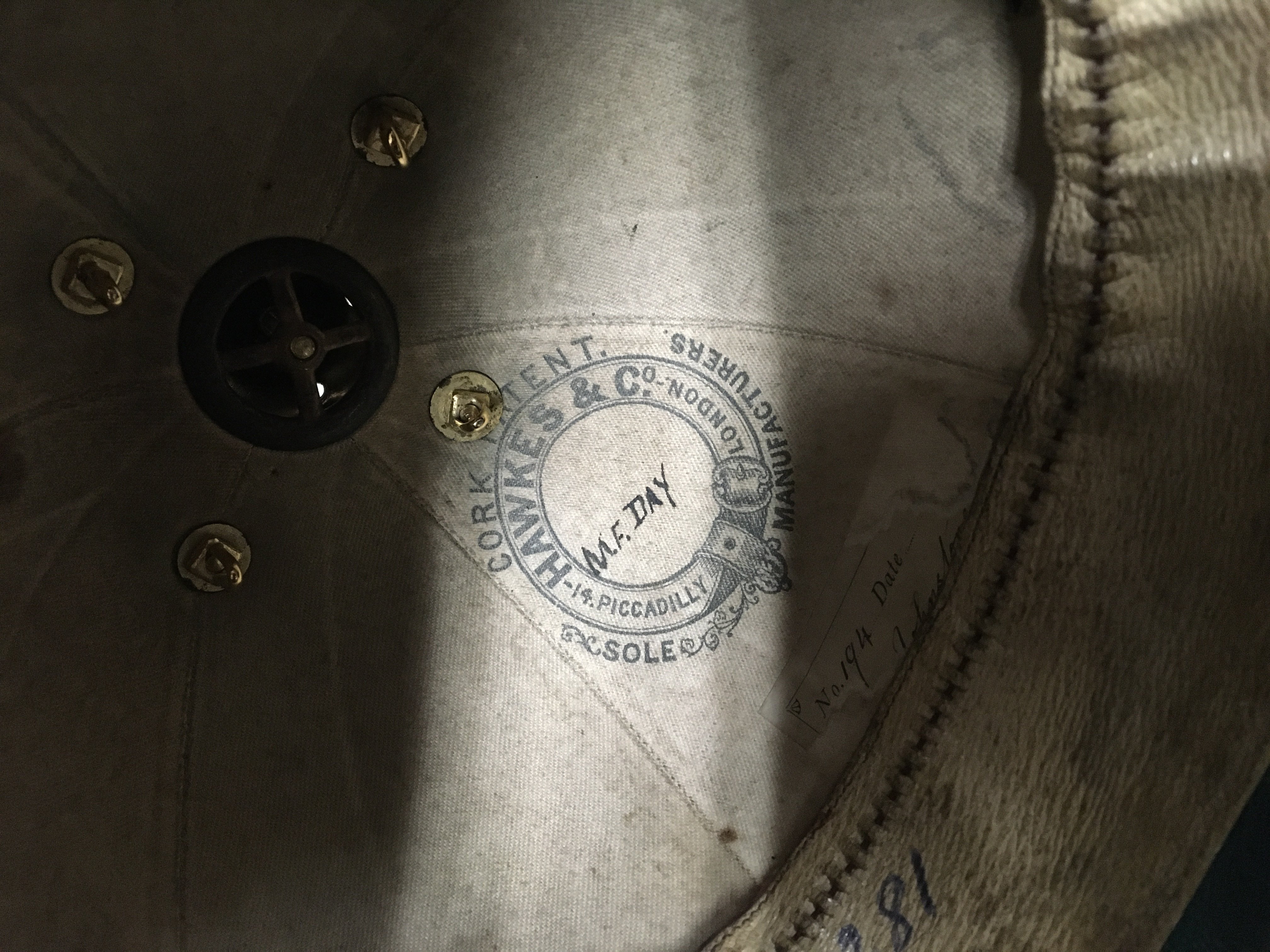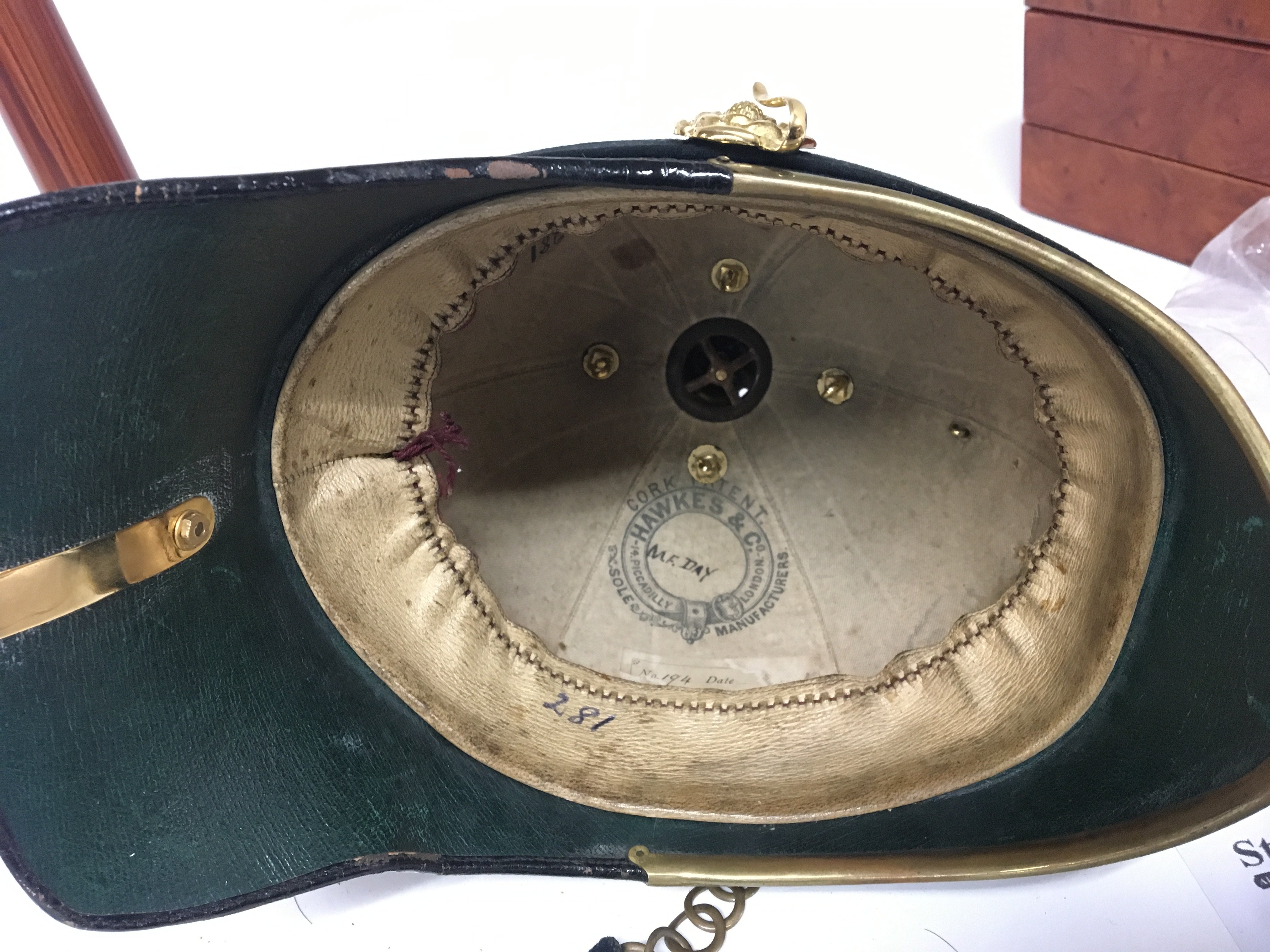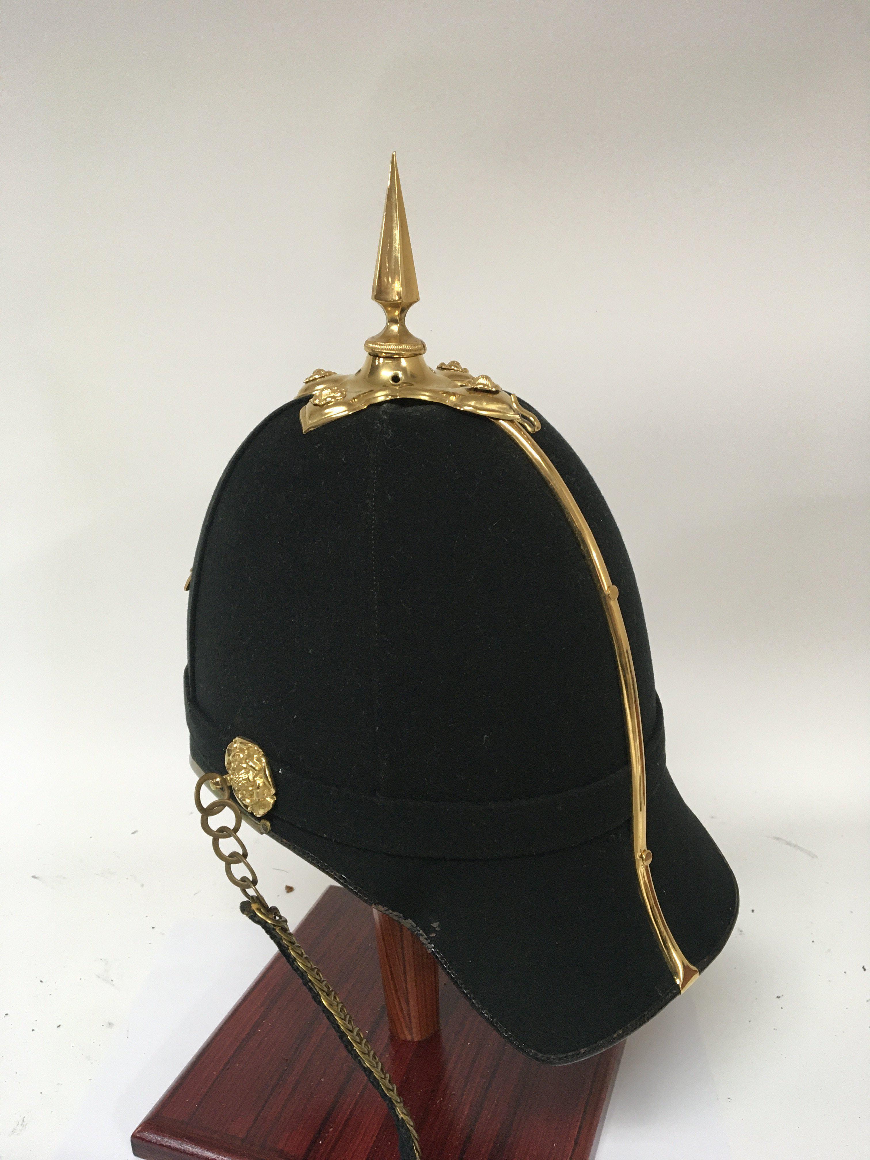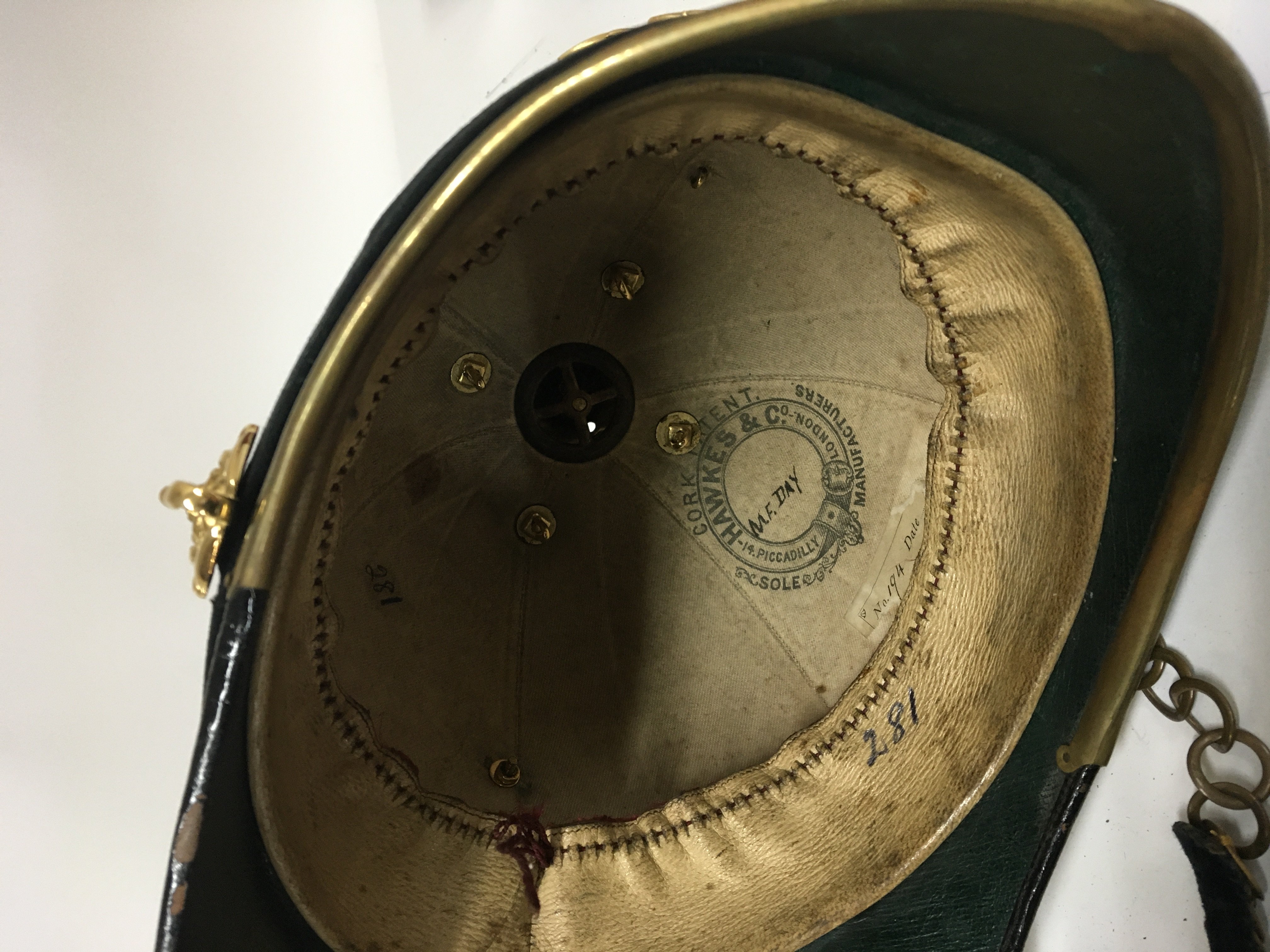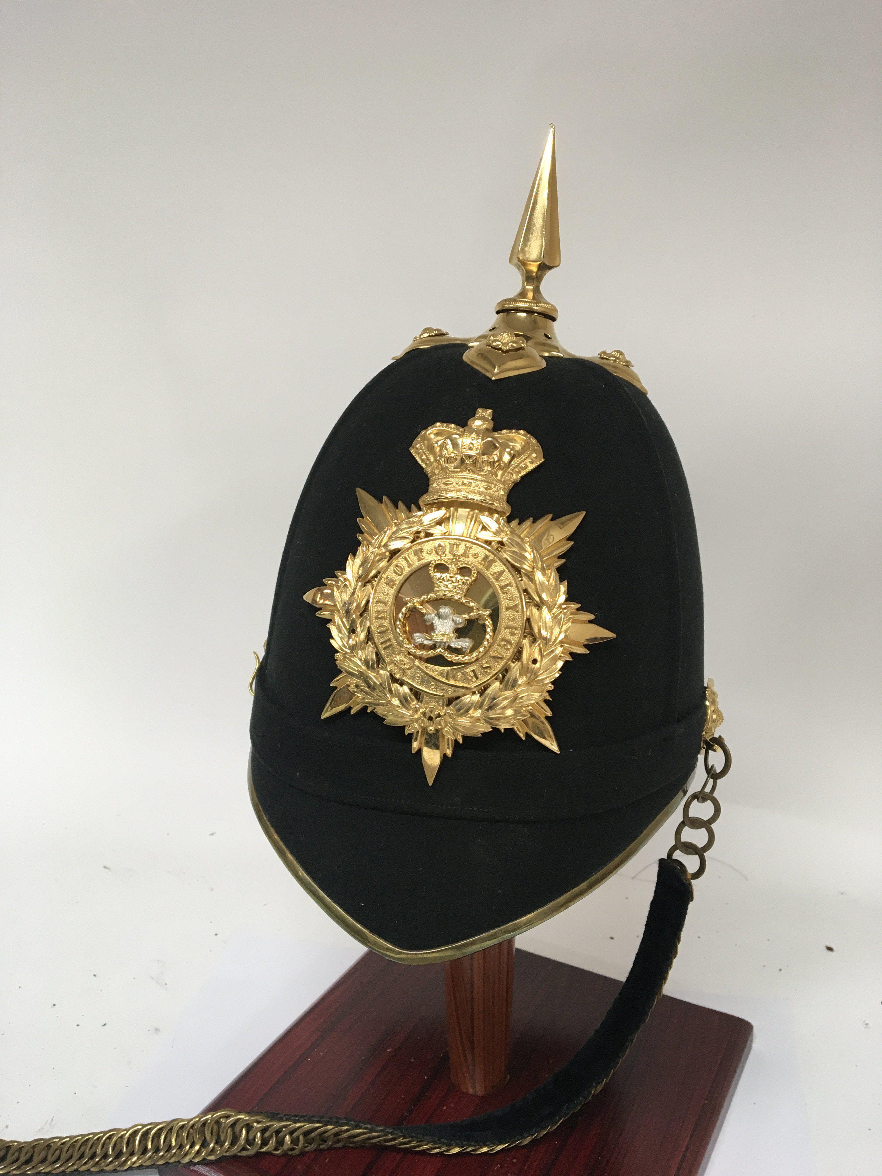 A Victorian Military helmet the interior with makers label with applied brass shako plate Royal Regiment of Wales possible re-badged.