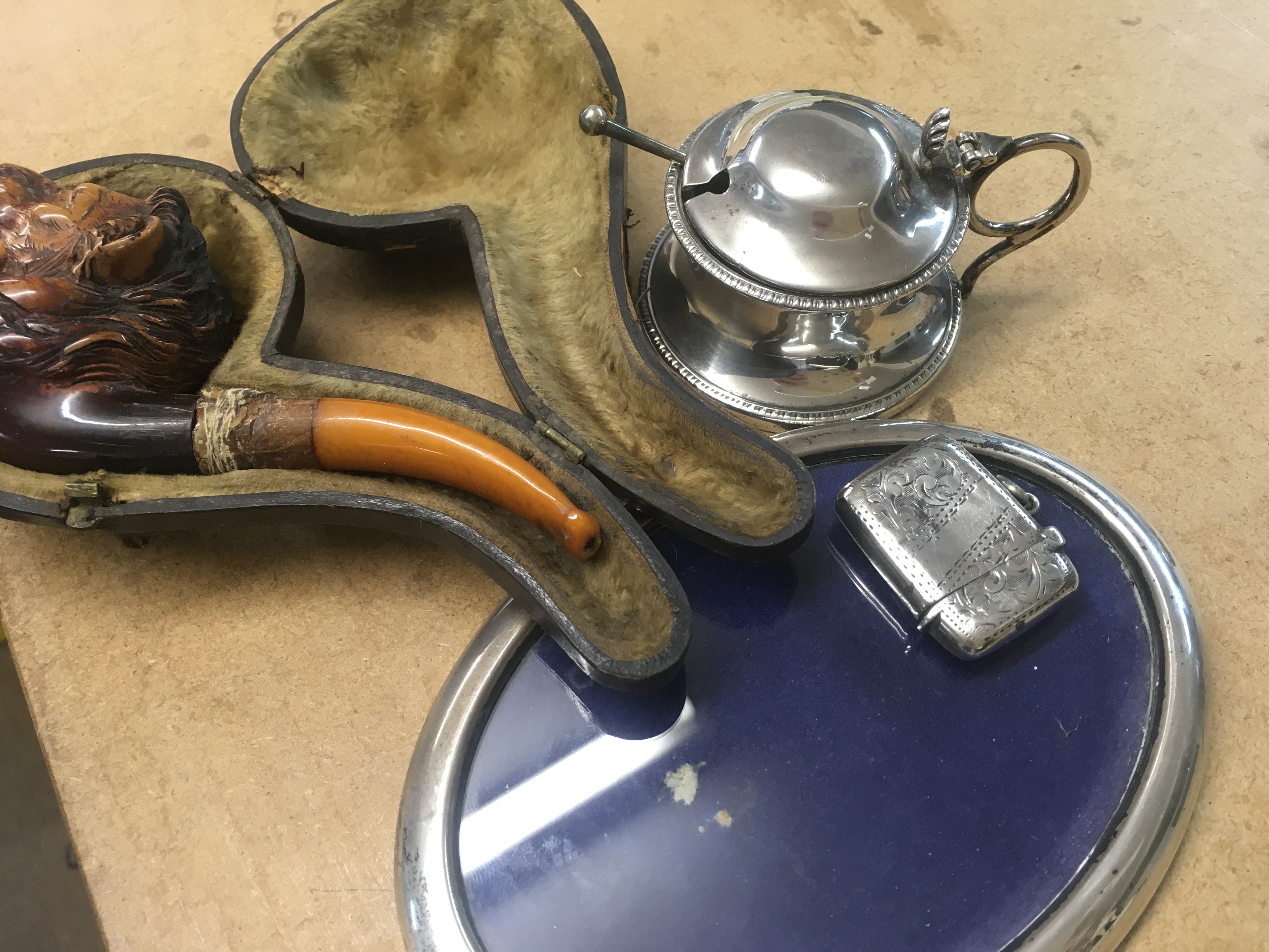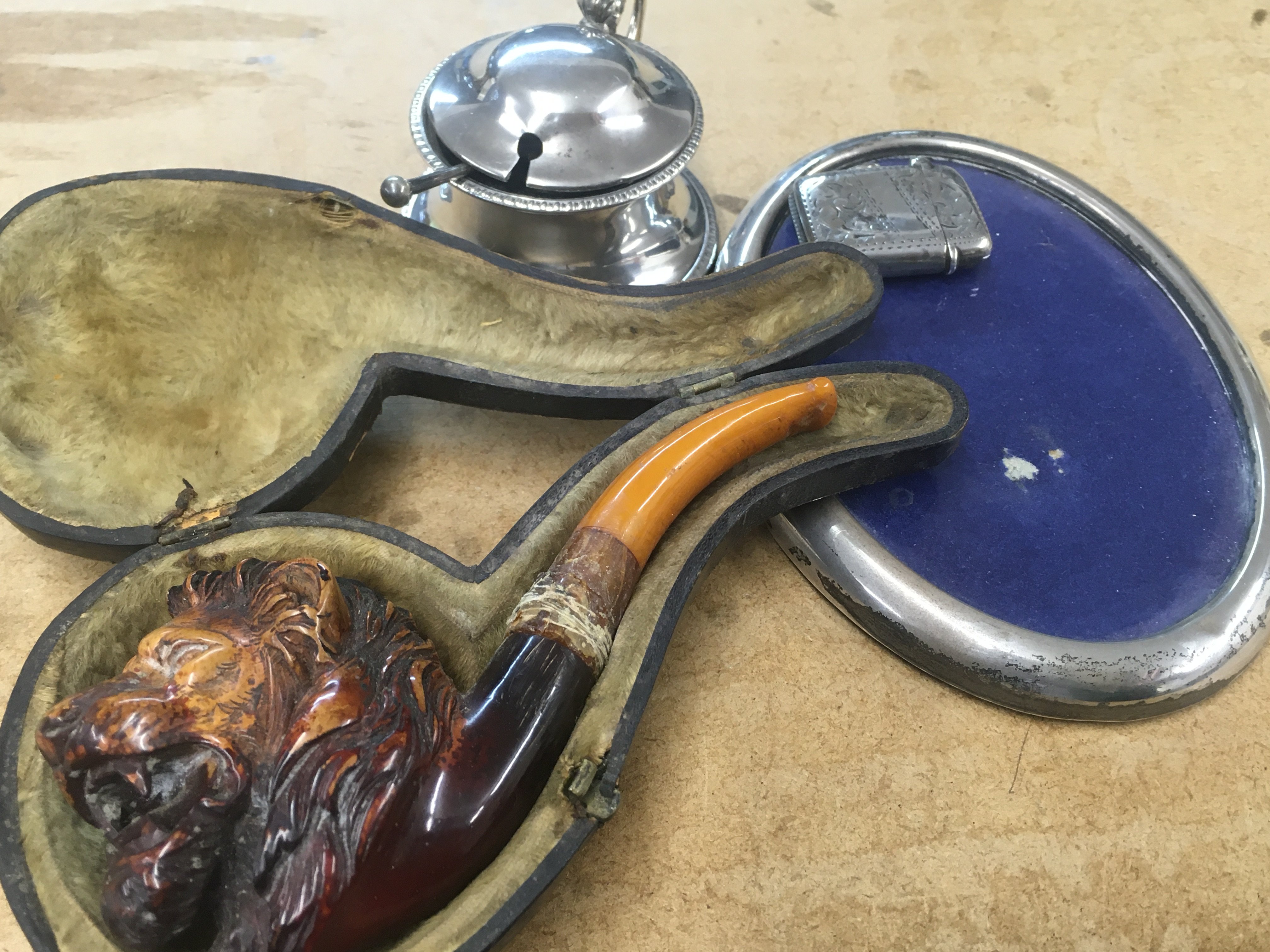 A silver vesta , a pipe in the form of a lion’s head . Together with a small oval photo frame and a silver Cruet .