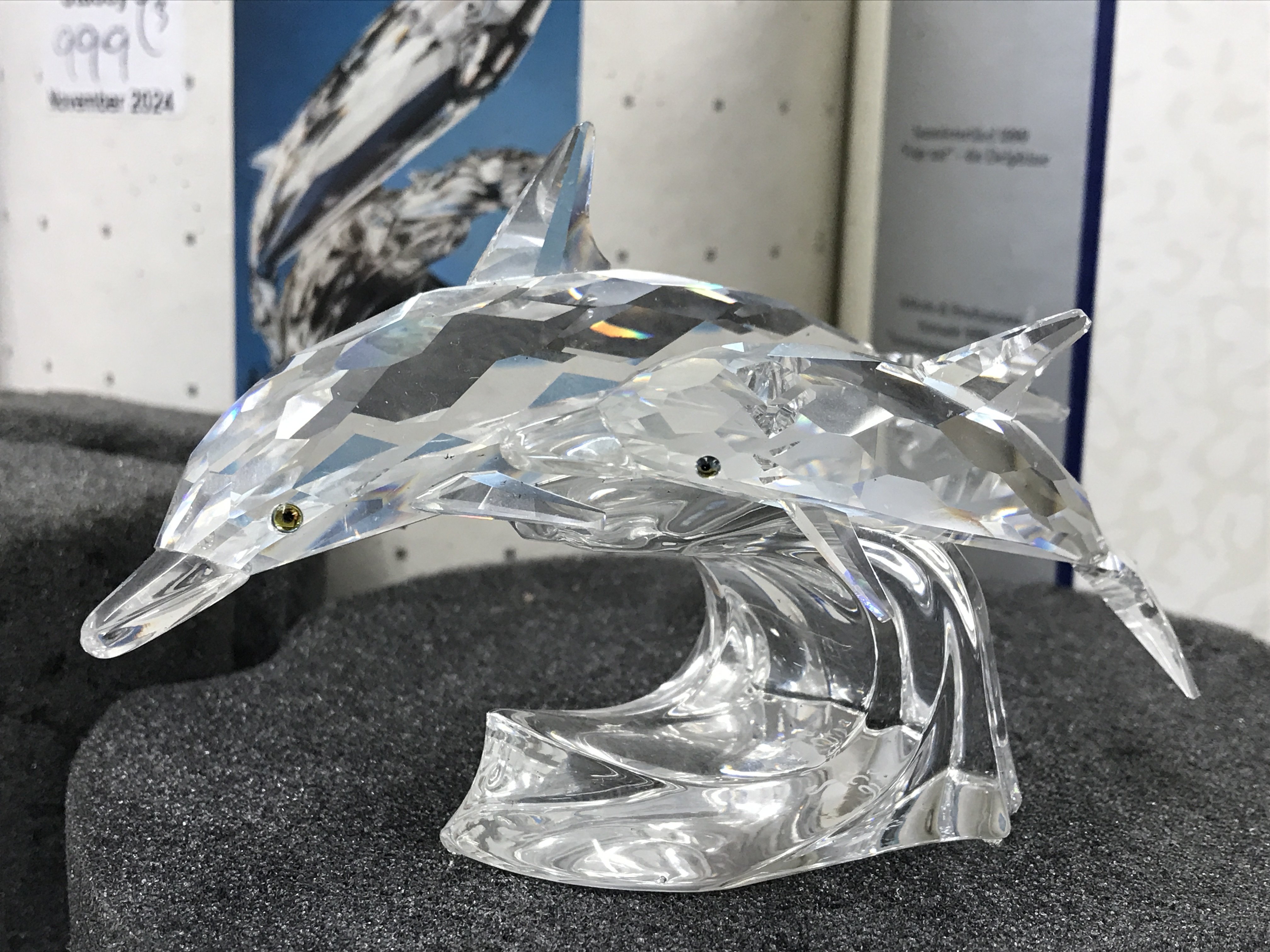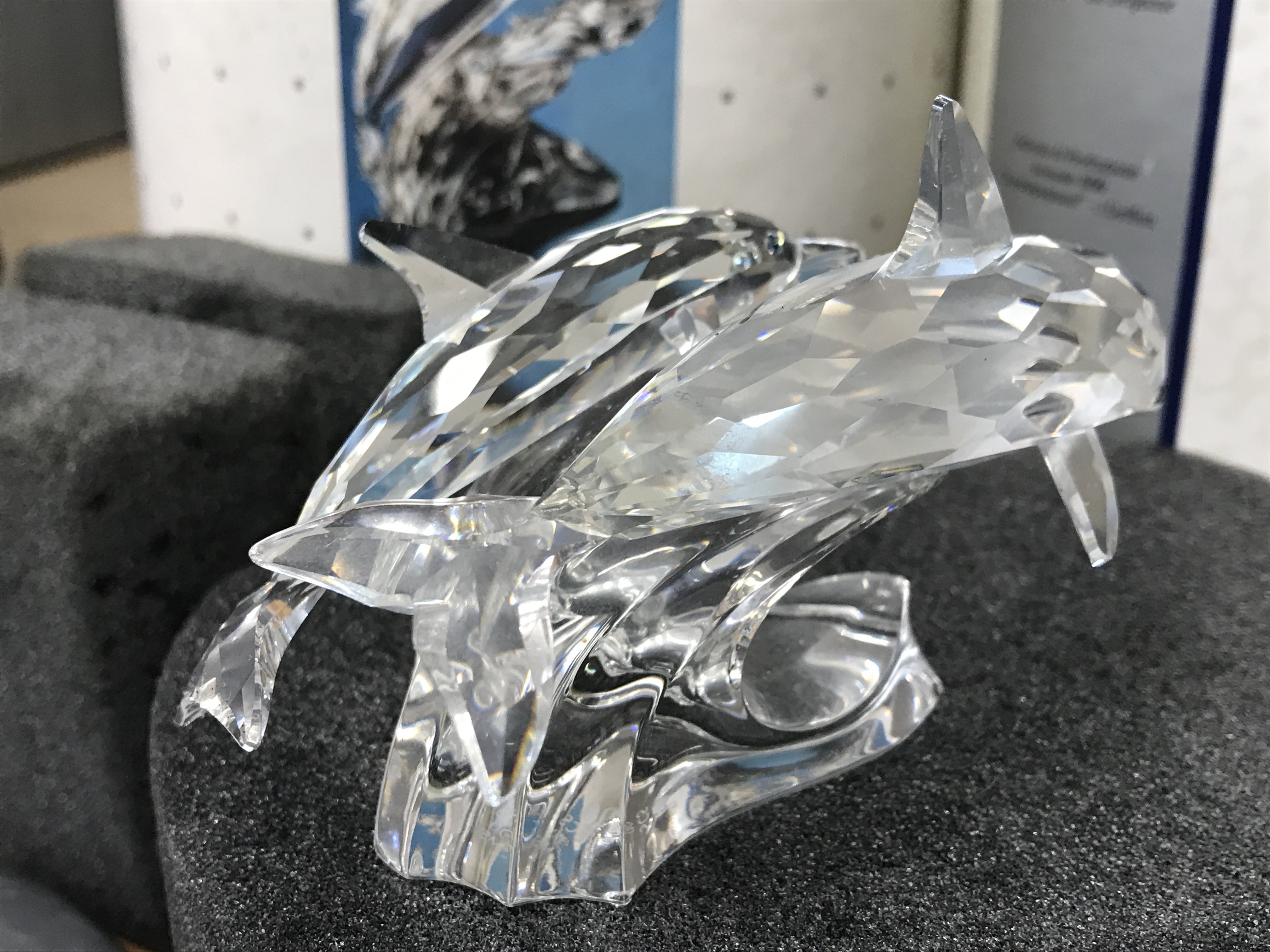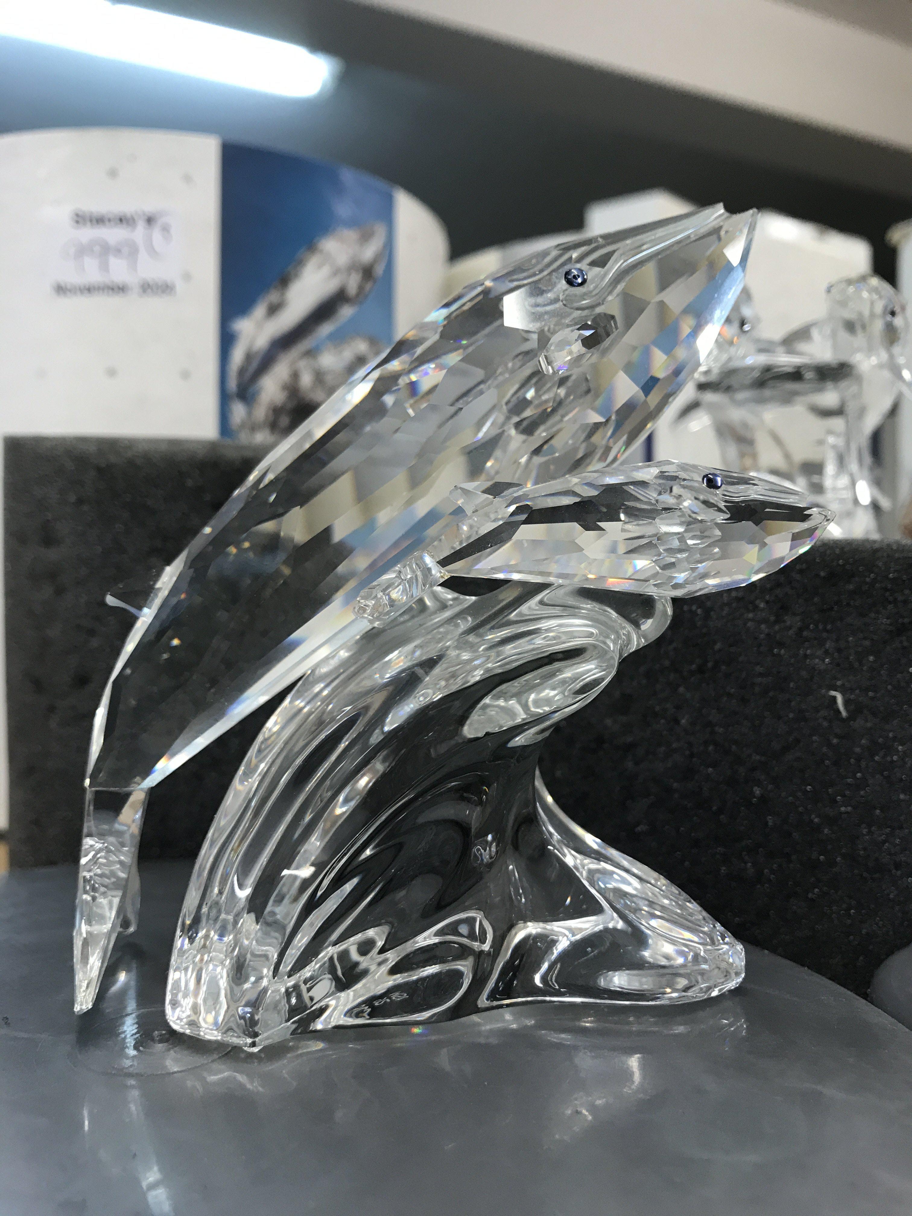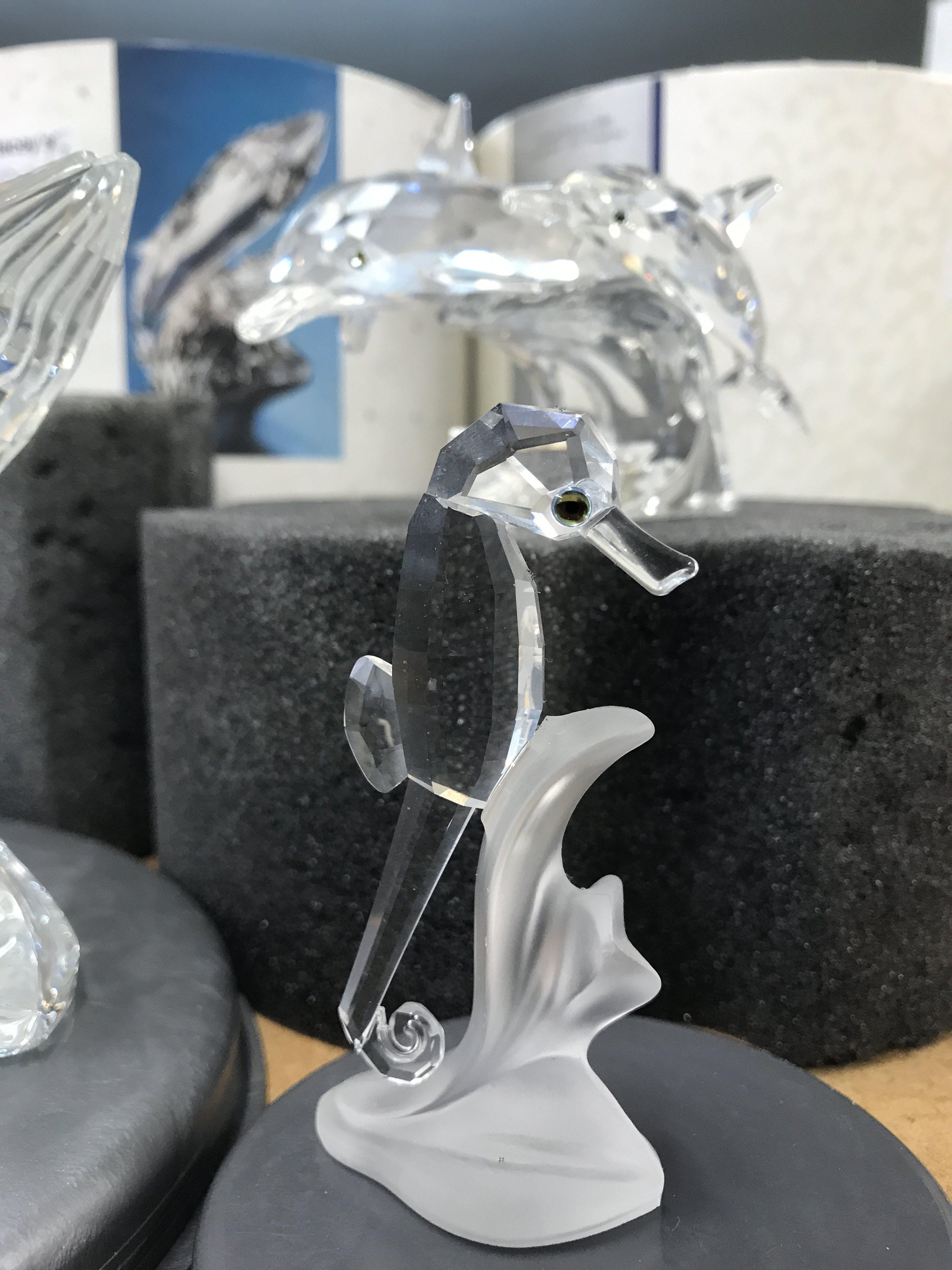 Three boxed Swarovski ocean figures including whale and calf, Limited Edition 1990 "Lead Me" dolphins, and a seahorse