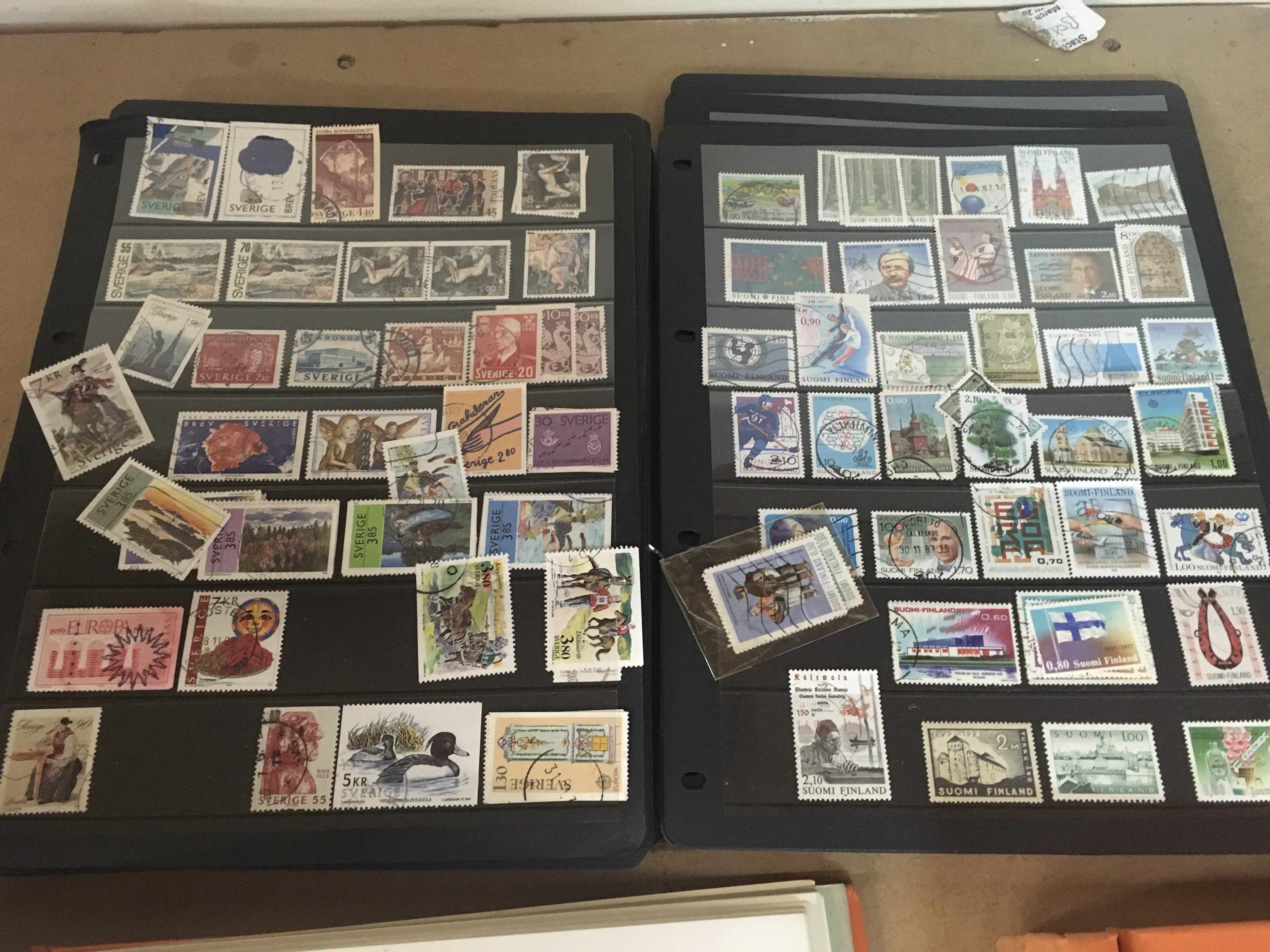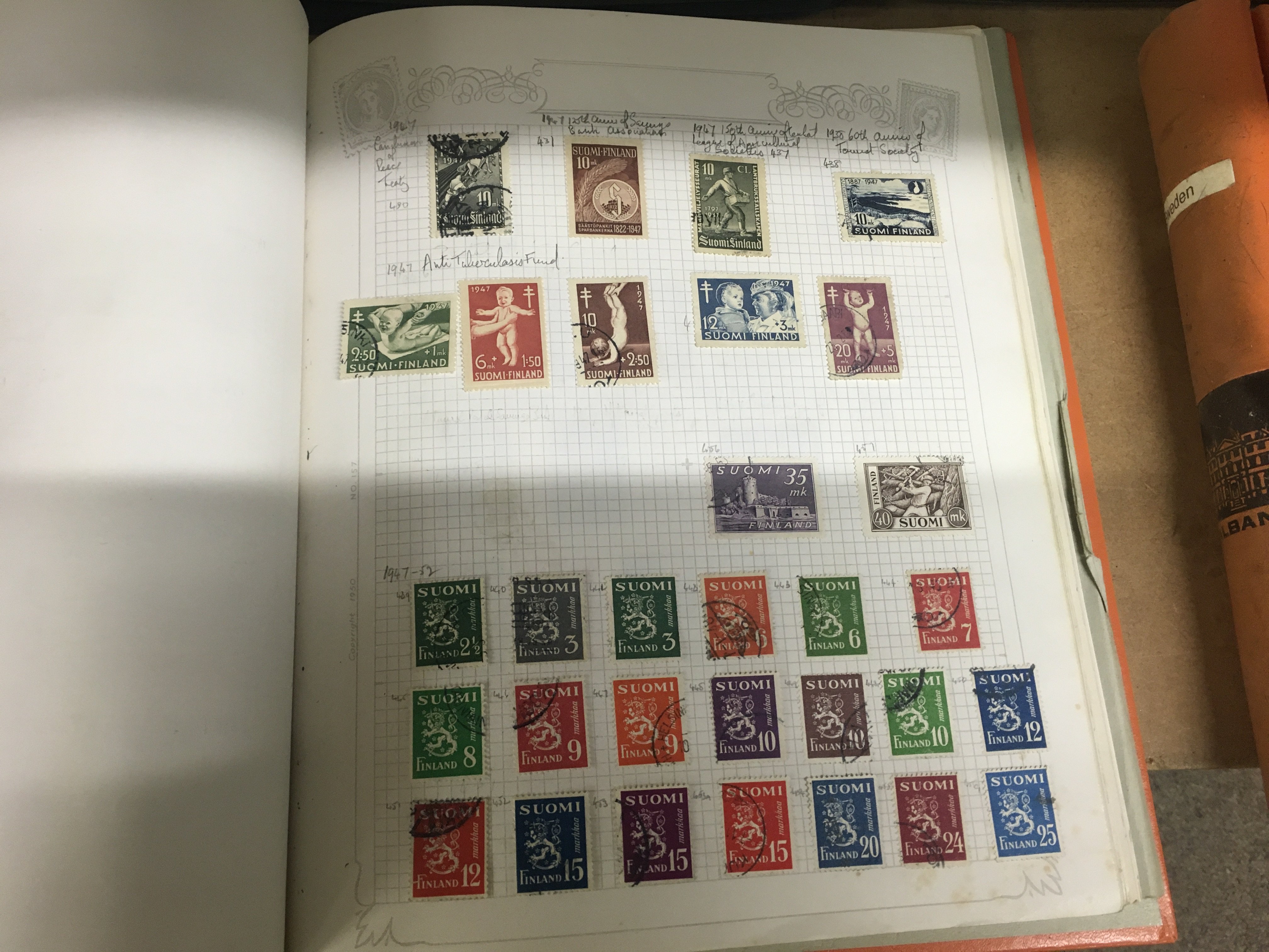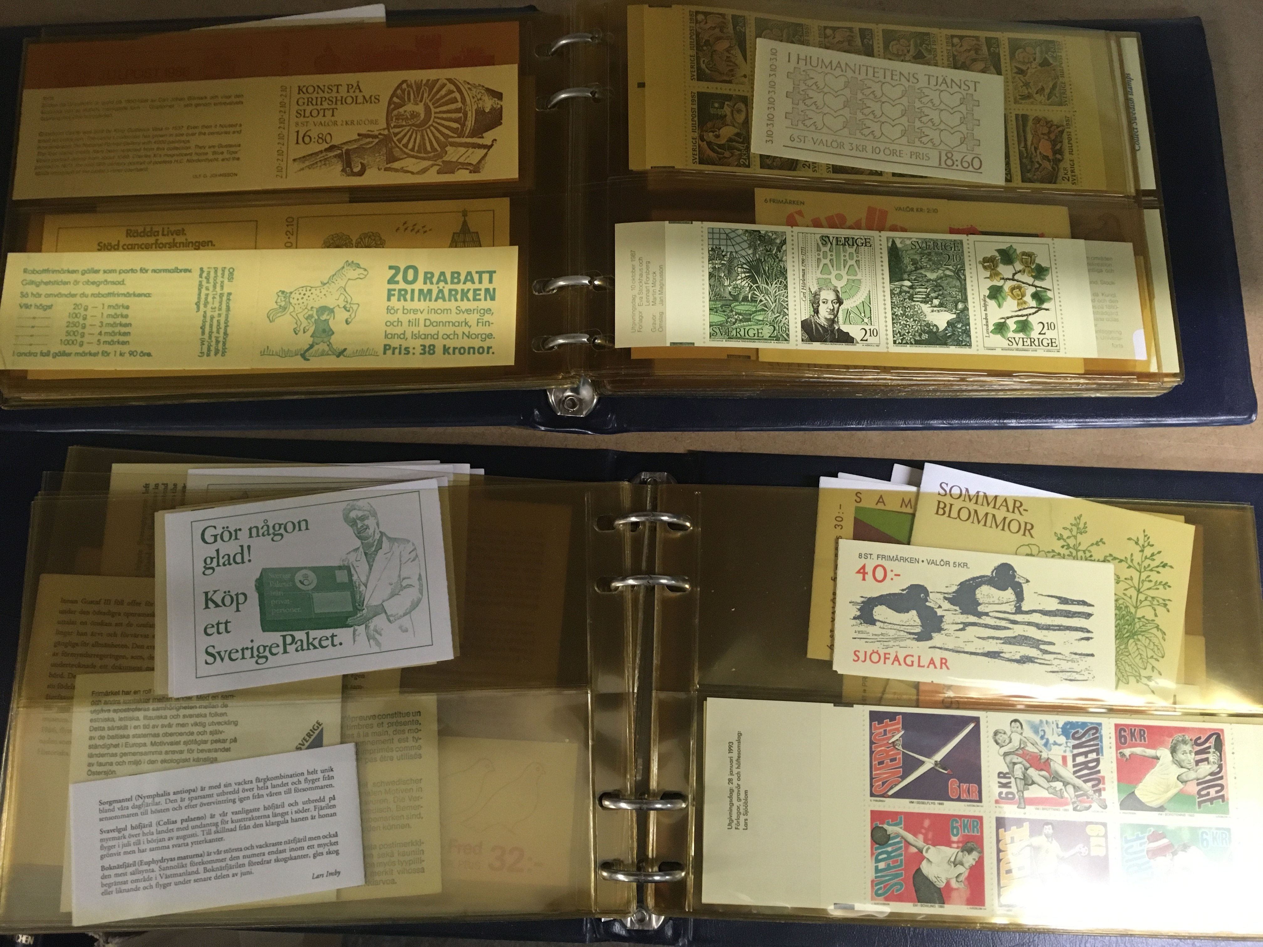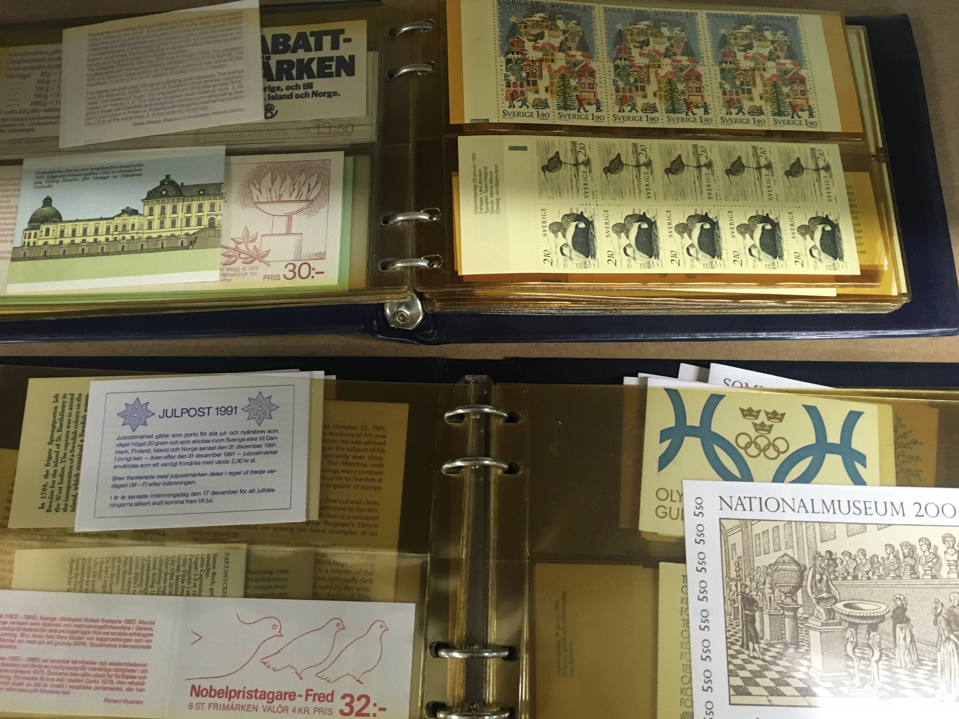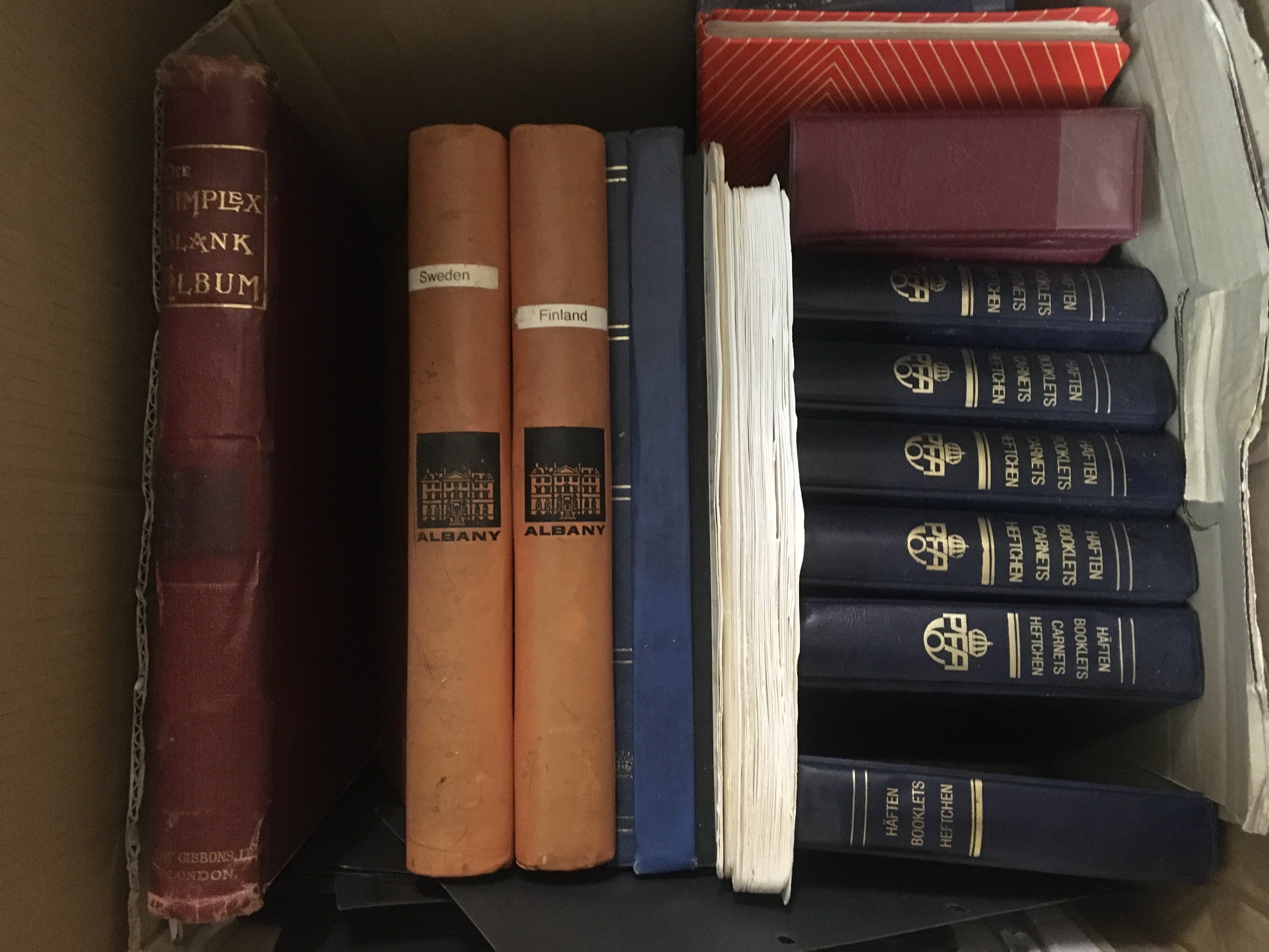 A box containing stamp Albums mainly Sweden and Finland with first day issue and booklets .