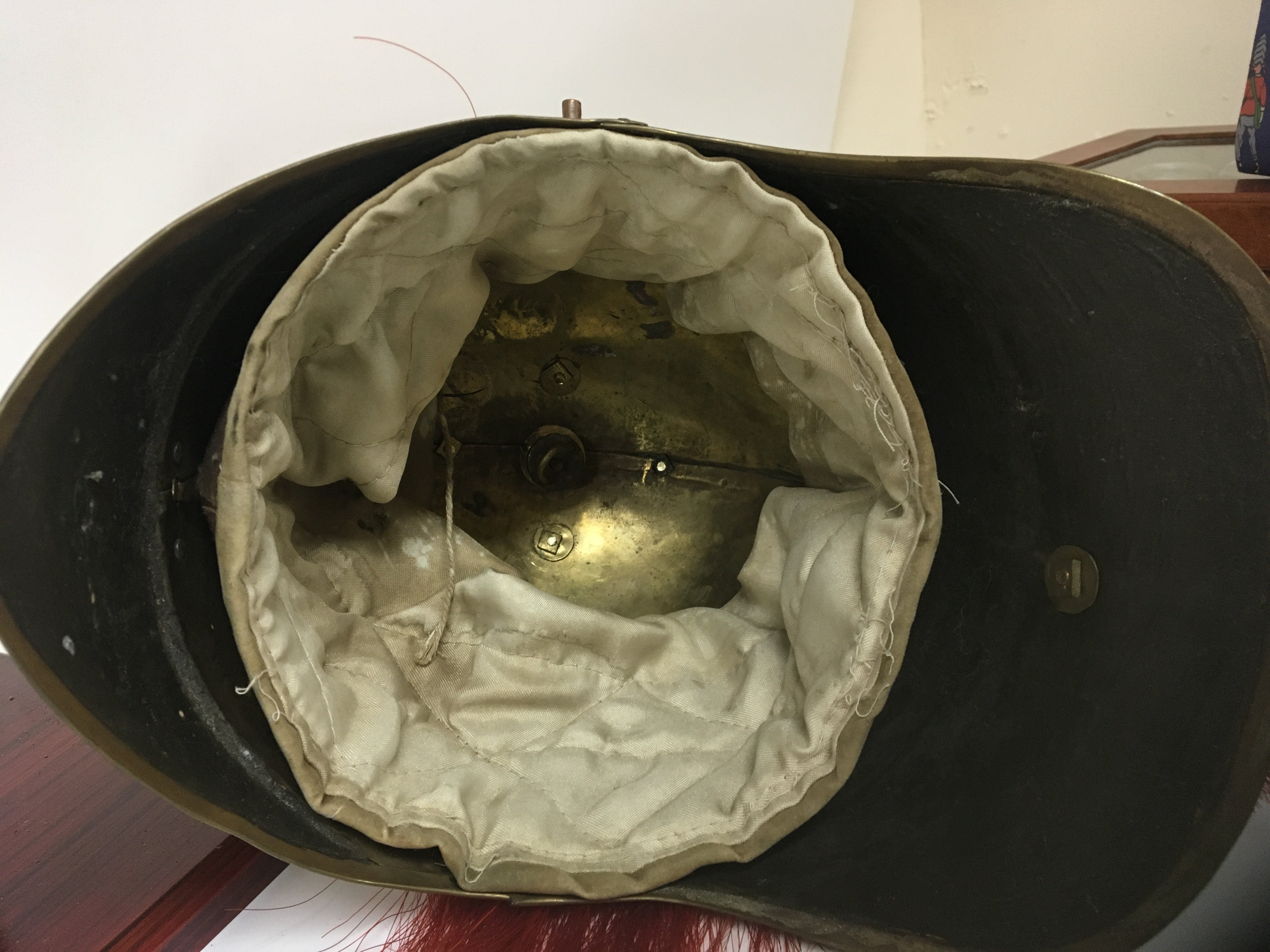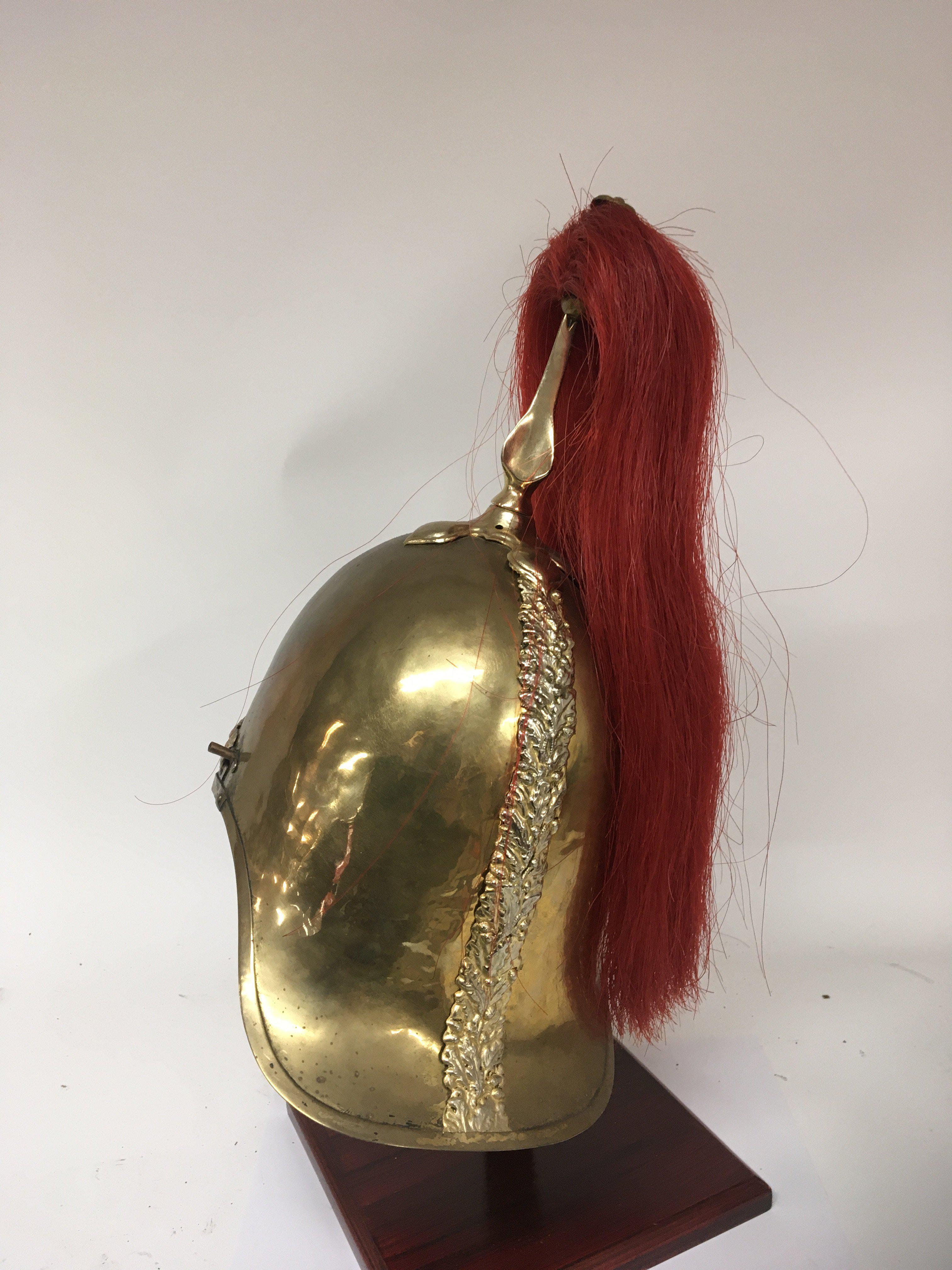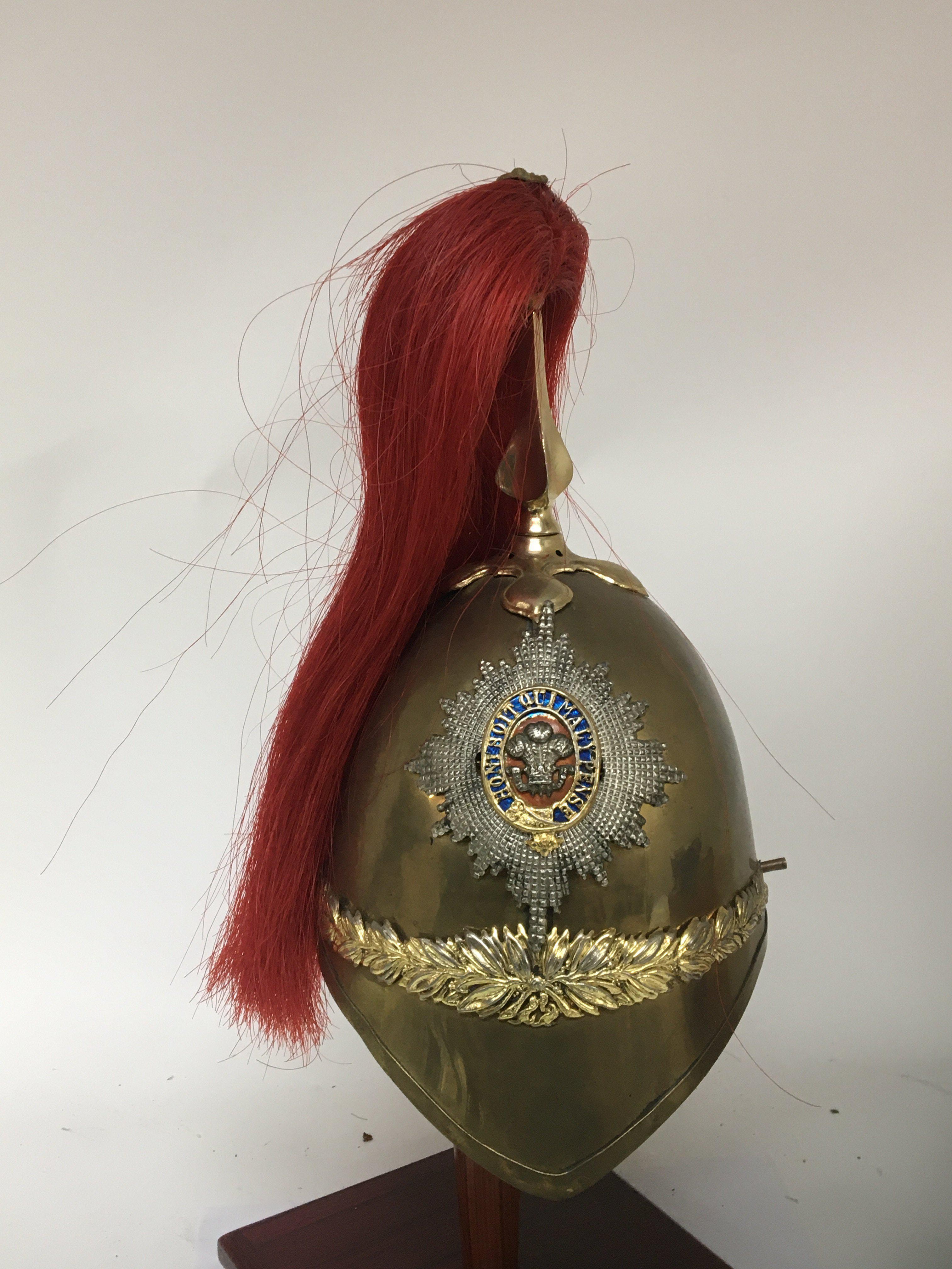 A Victorian brass Military helmet with Royal Welsh Regiment of Wales shako plate possible colour enhanced. With a red plume and missing chin strap and side chin strap fittings.