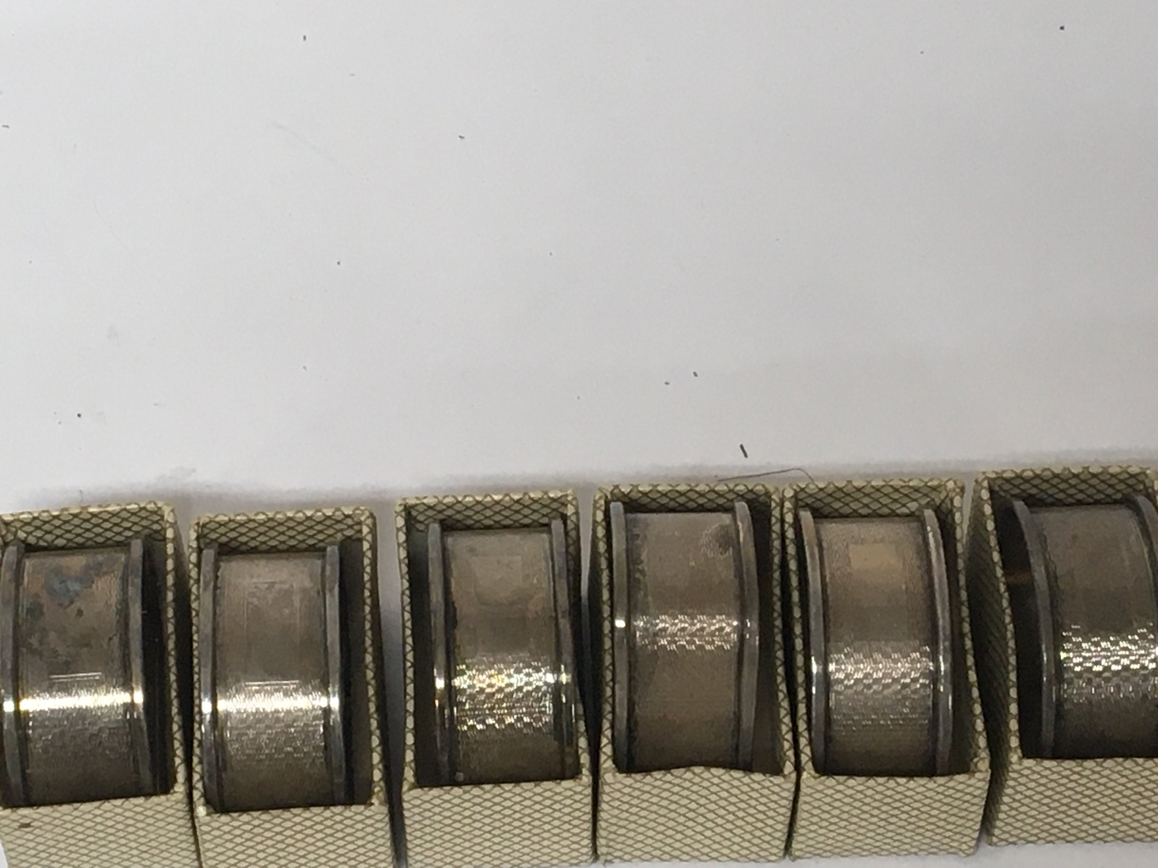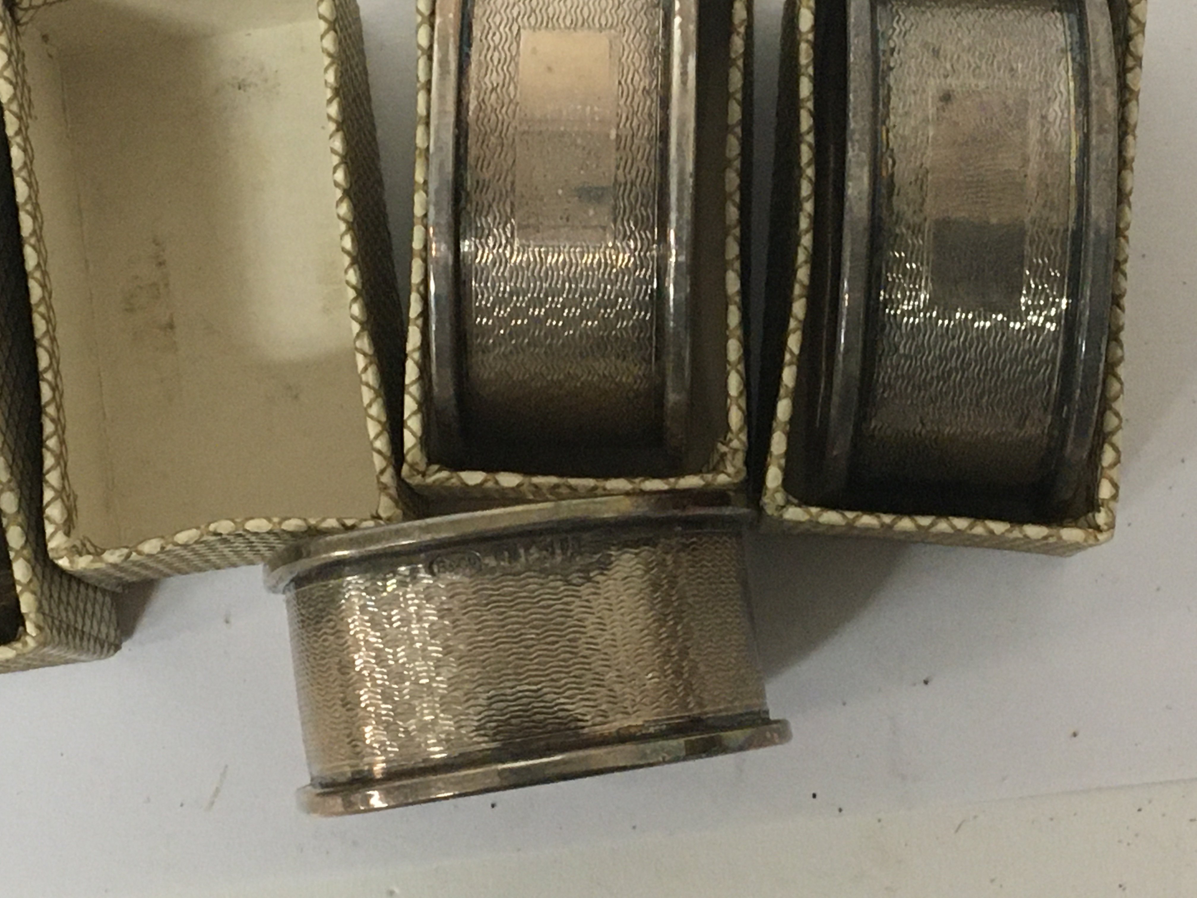 A set of six silver napkin rings in fitted boxes no personal inscriptions and with Birmingham hallmarks.