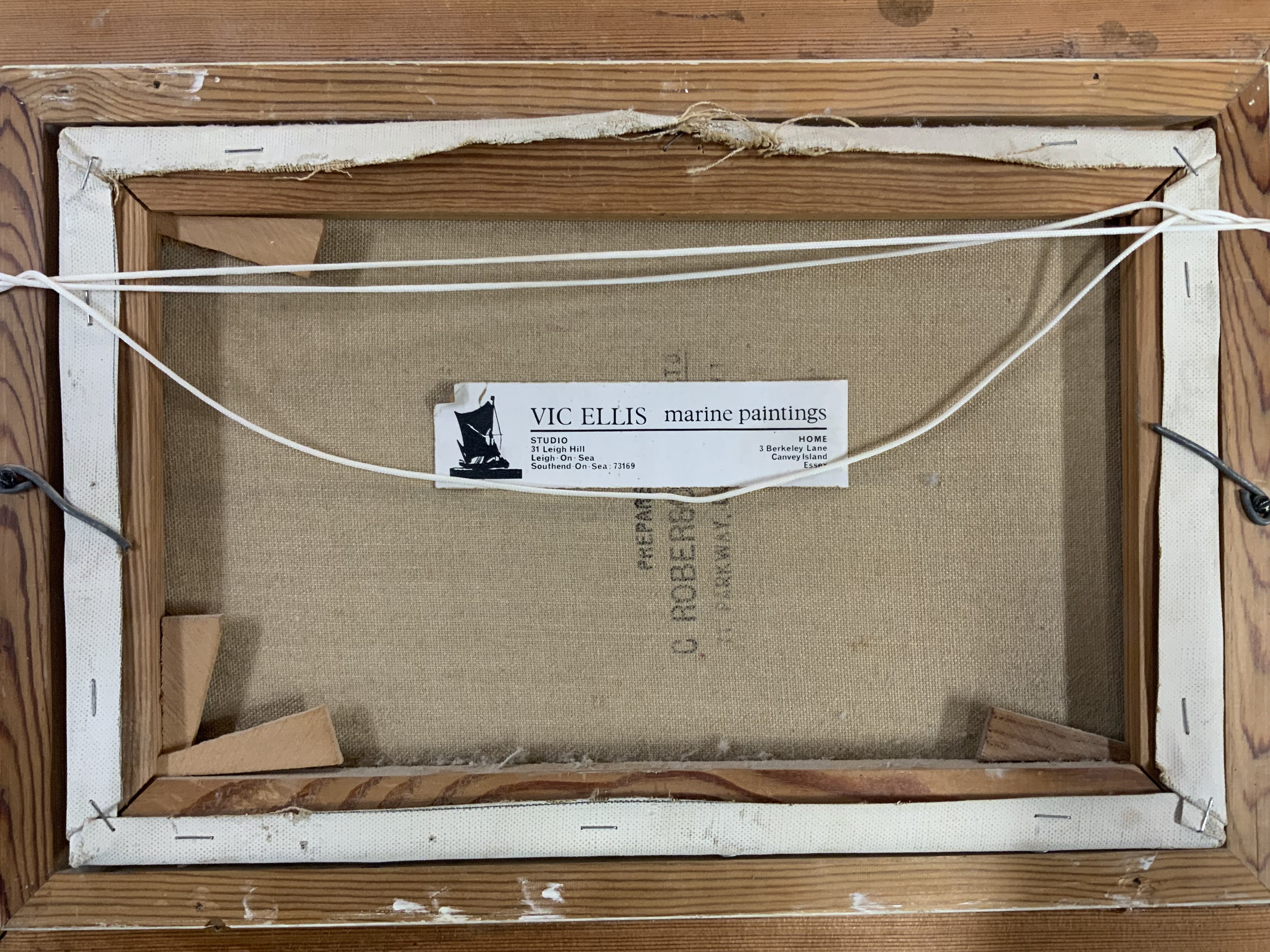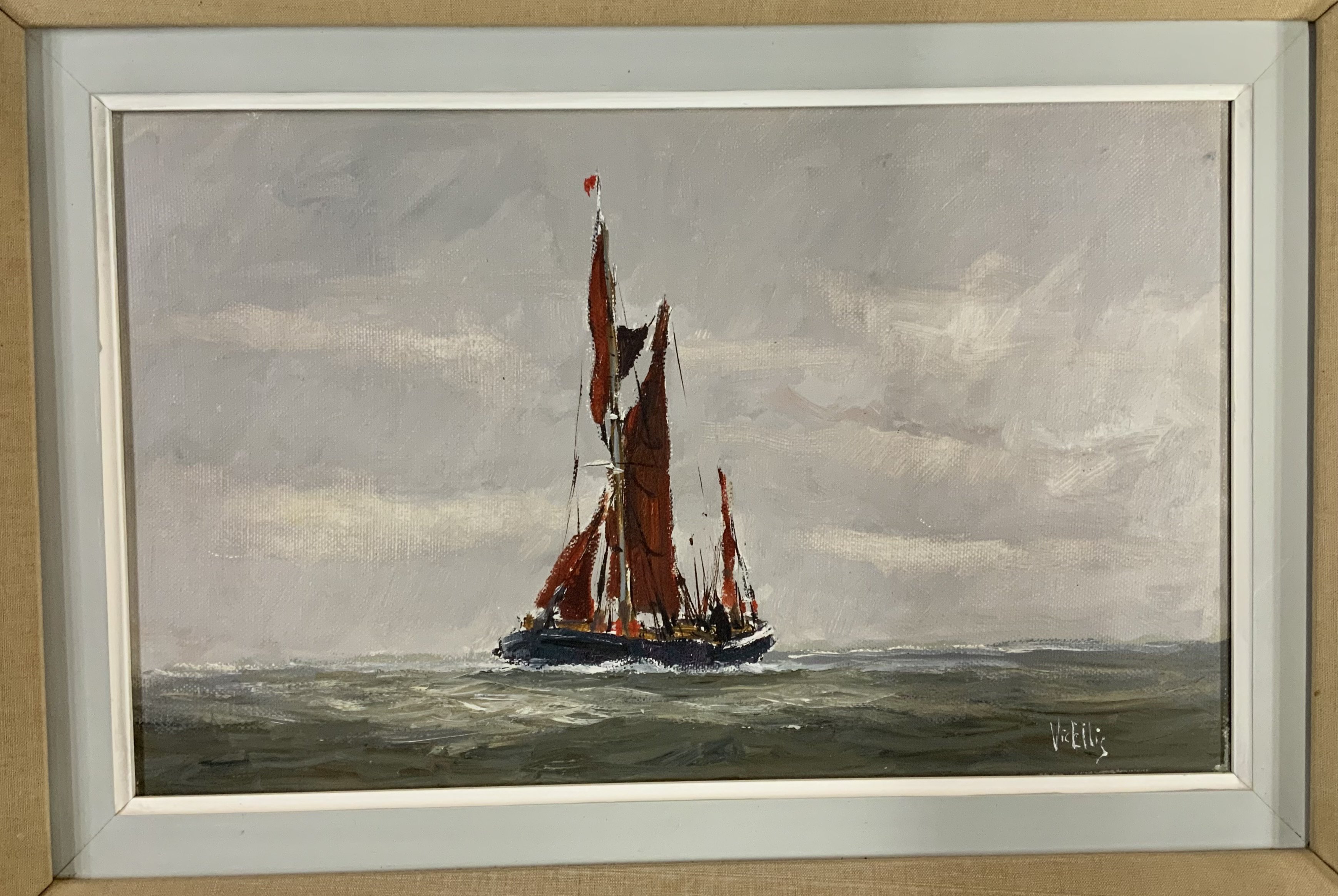 A Vic Ellis oil on canvas painting of a Thames Barge. 56cm x 39cm