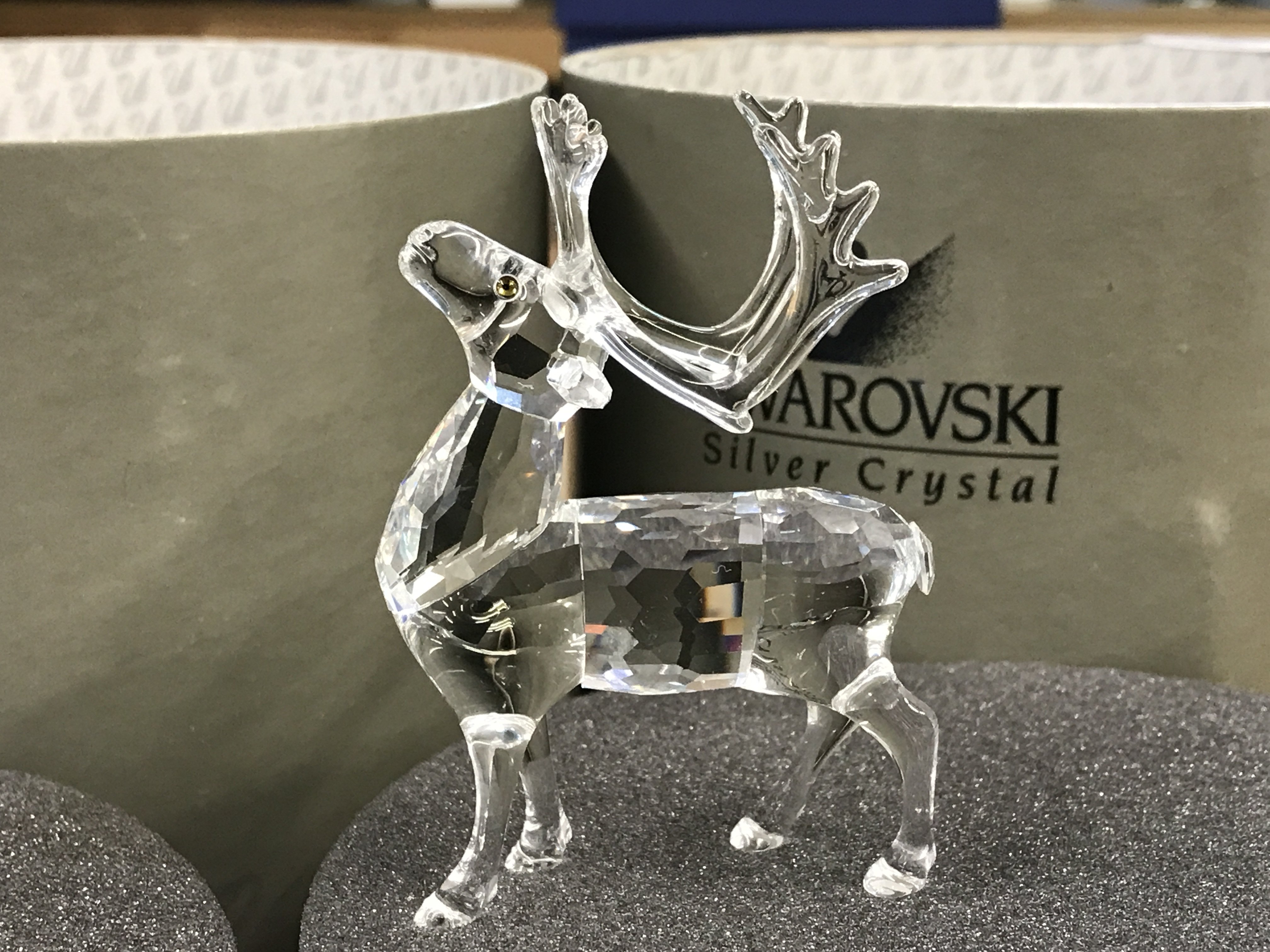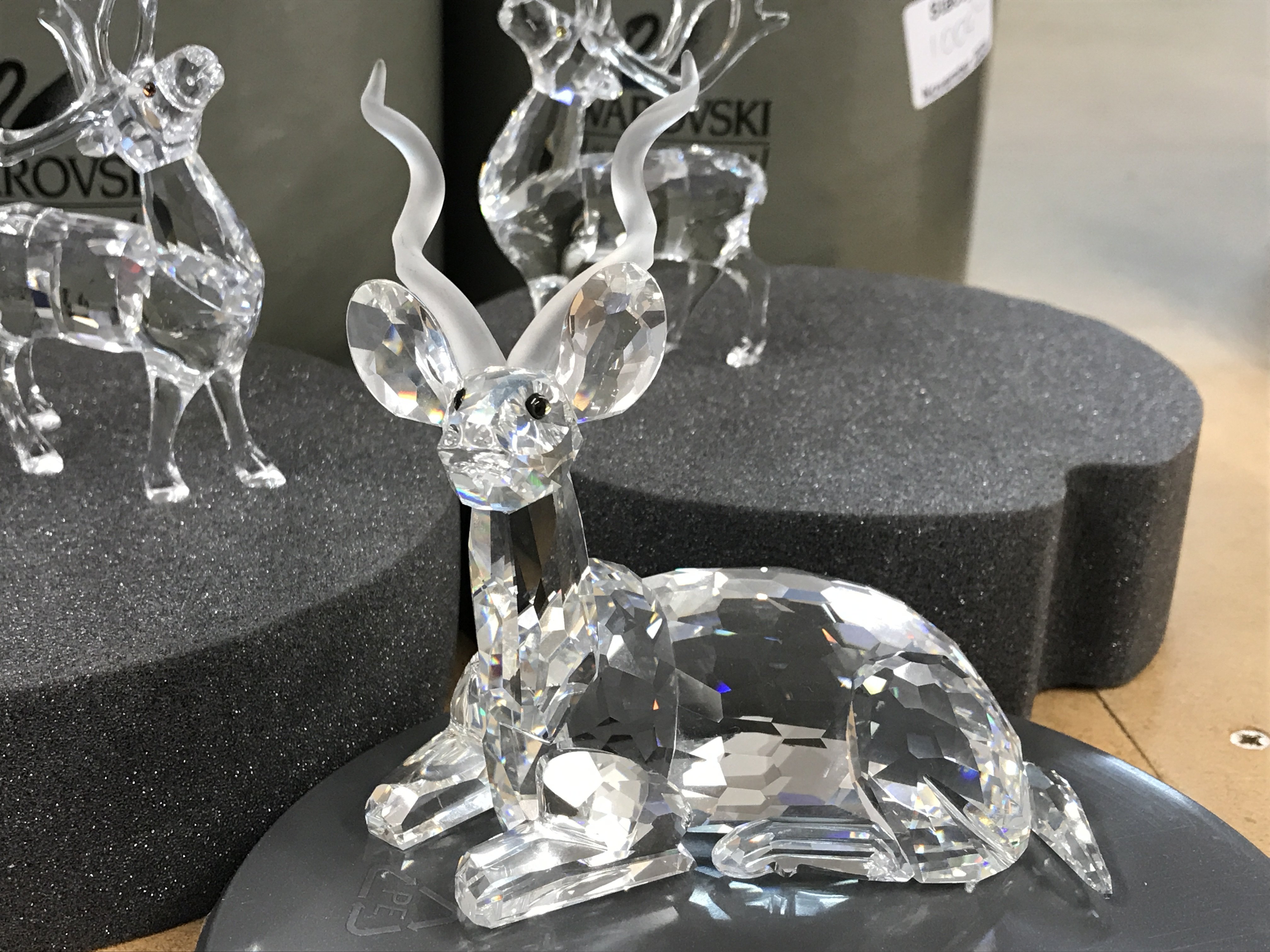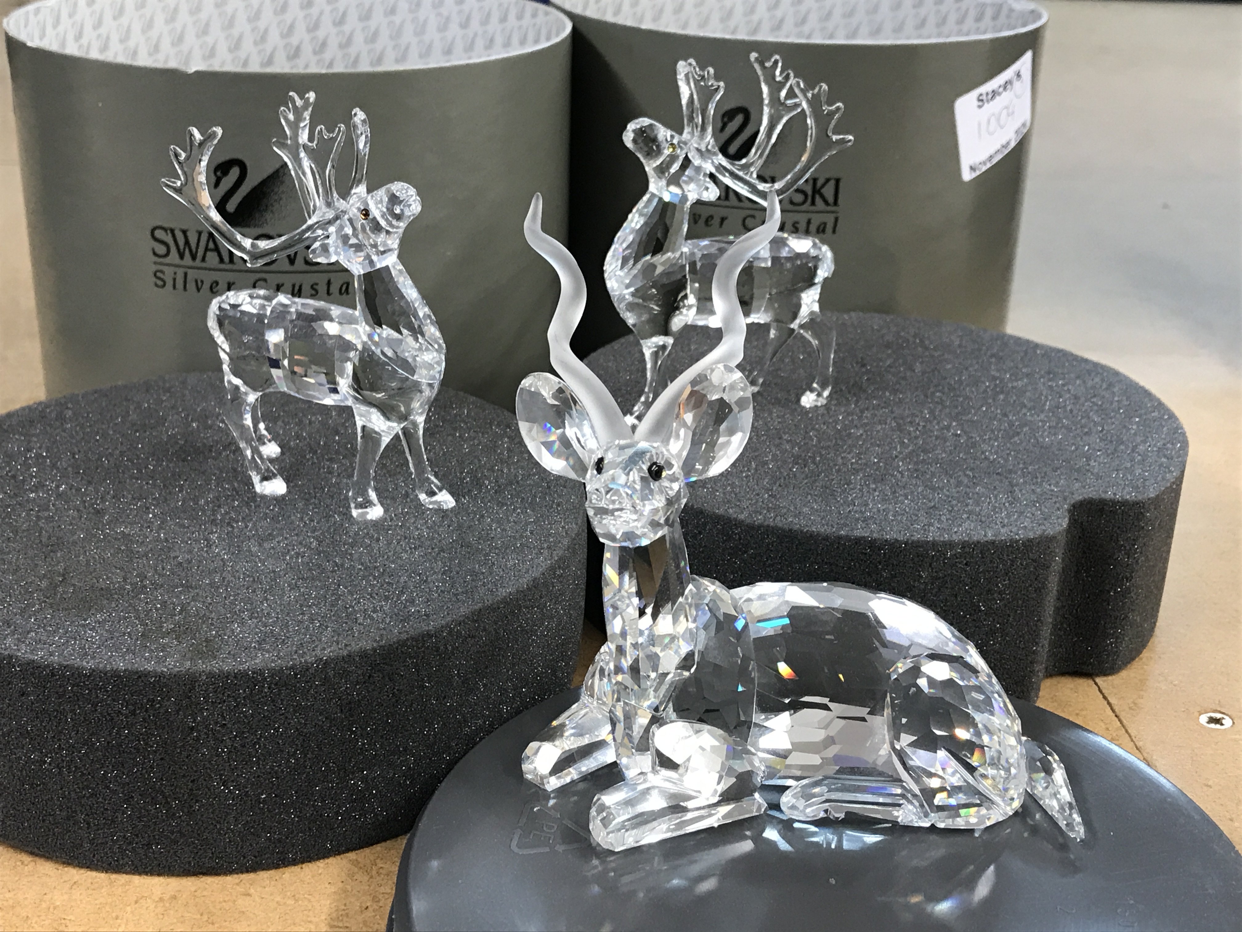 A Swarovski "Inspiration Africa-The Kudu" figure together with two Reindeer figures and Santa Sleigh