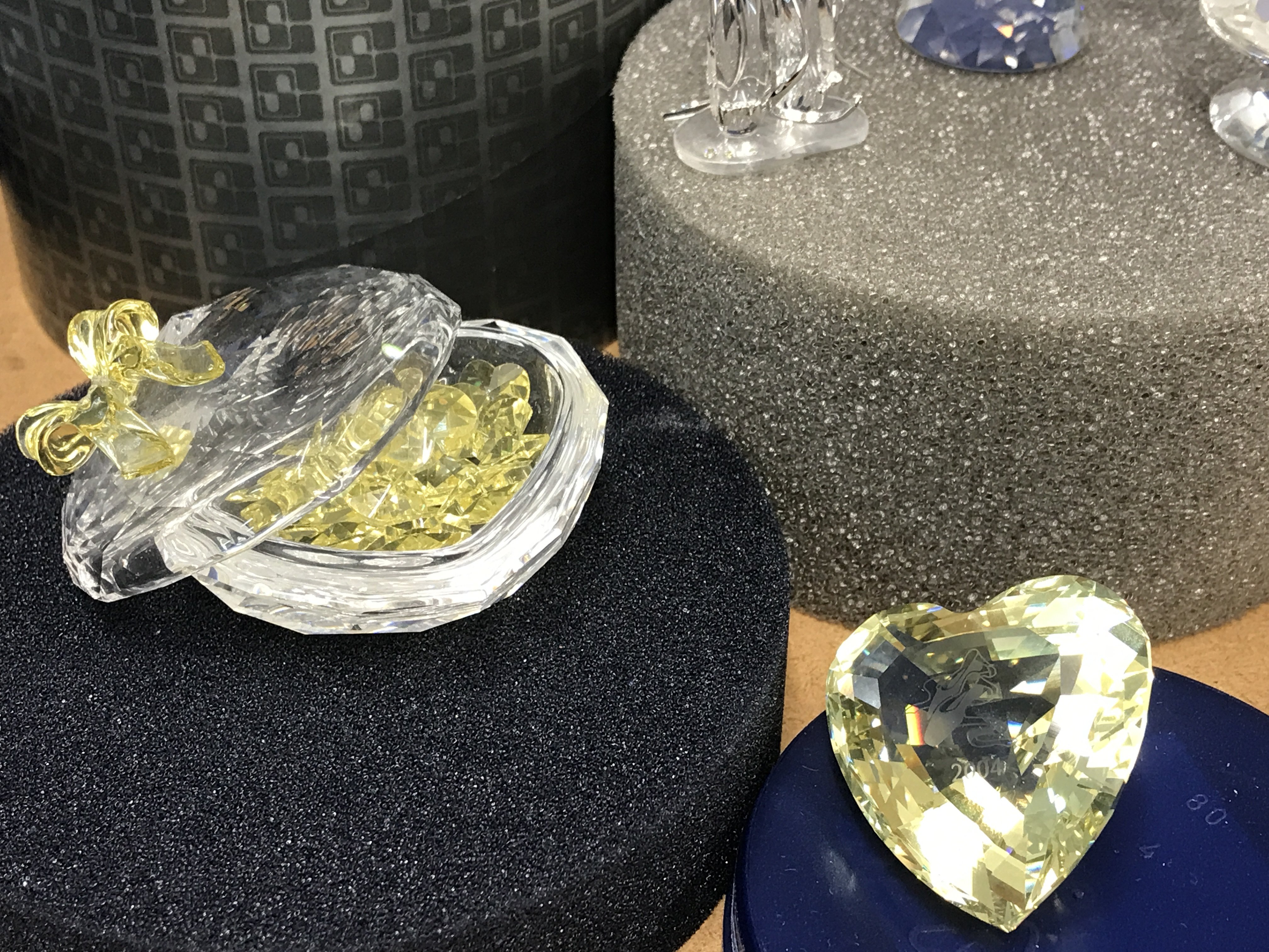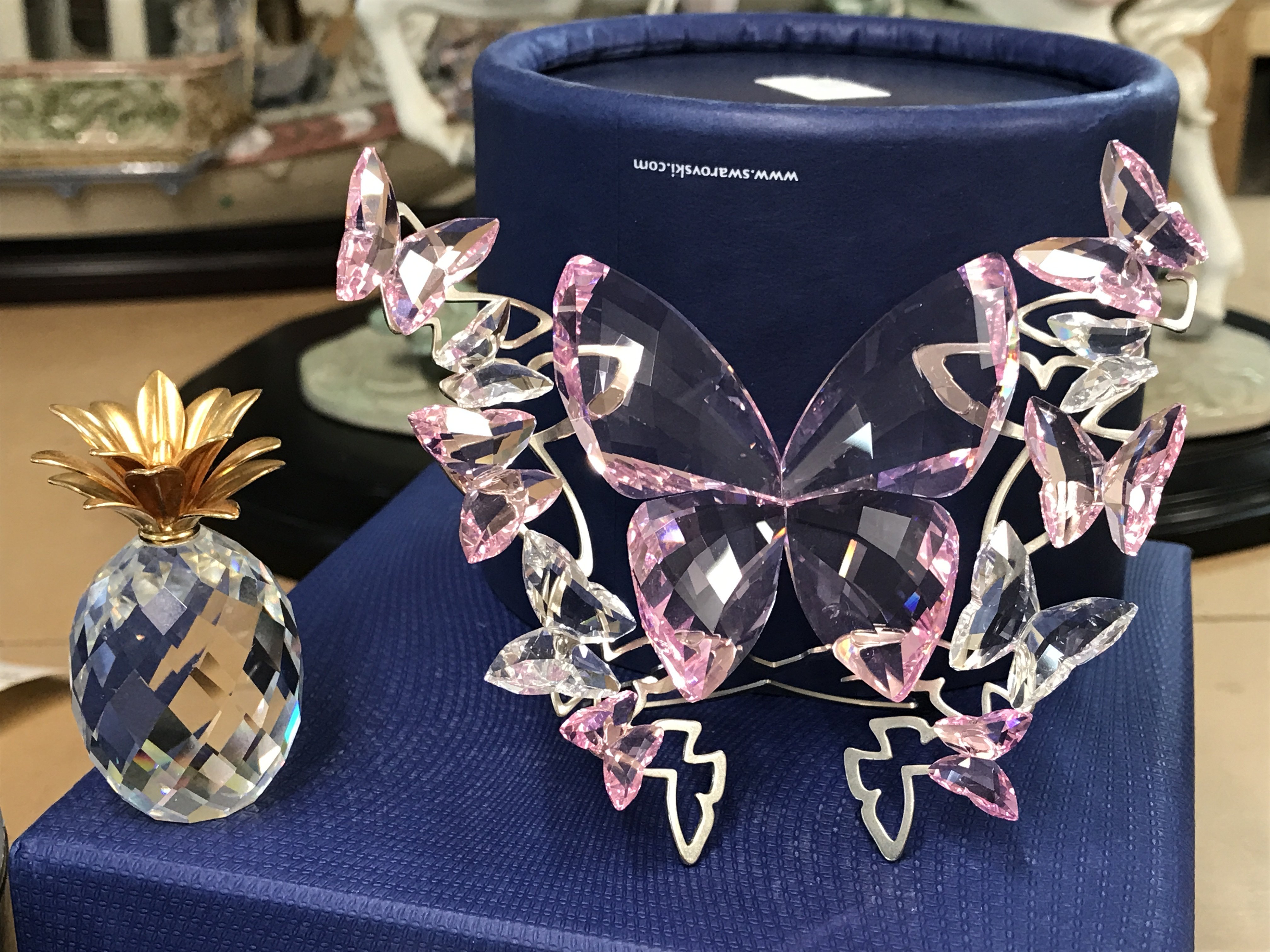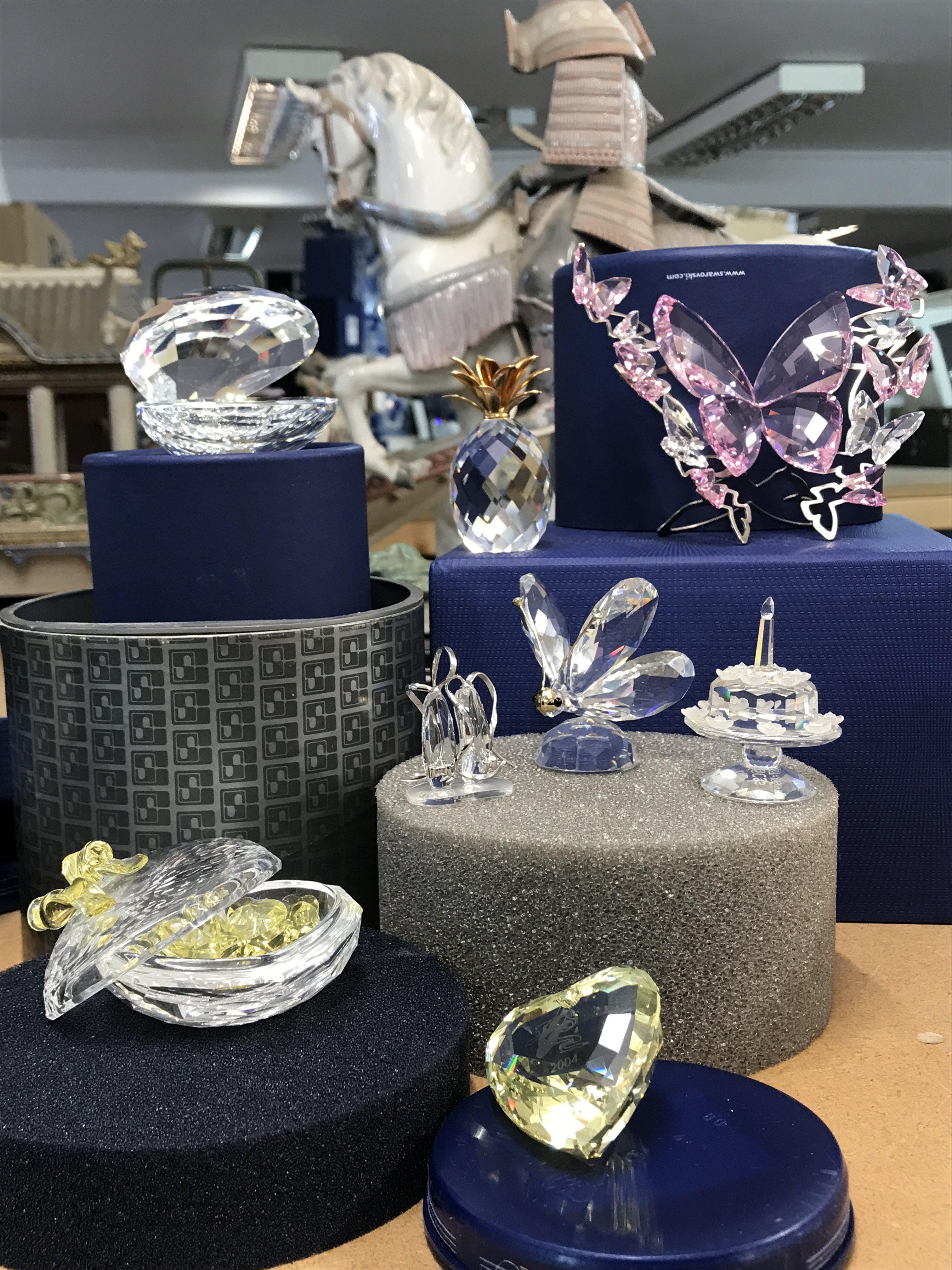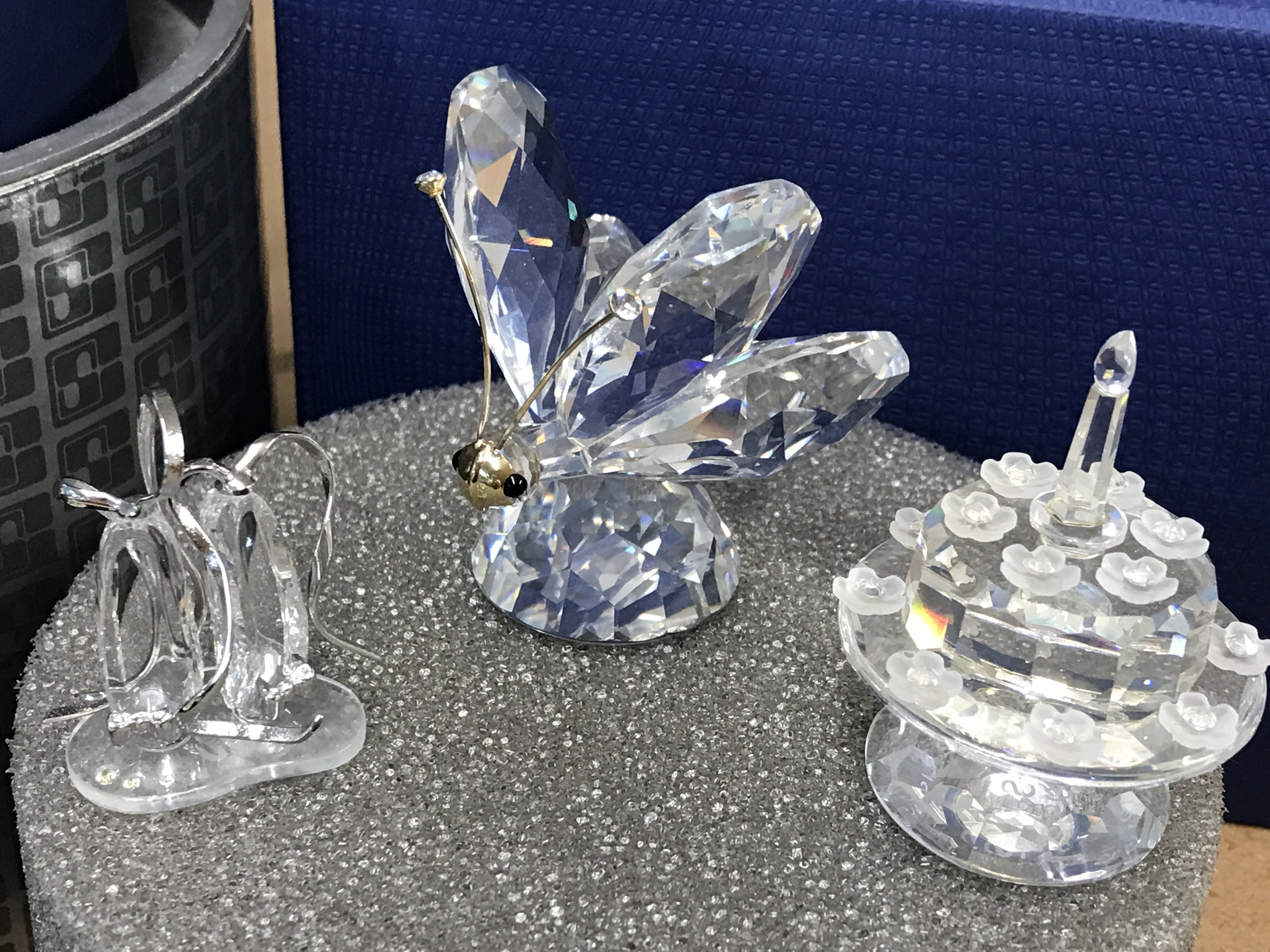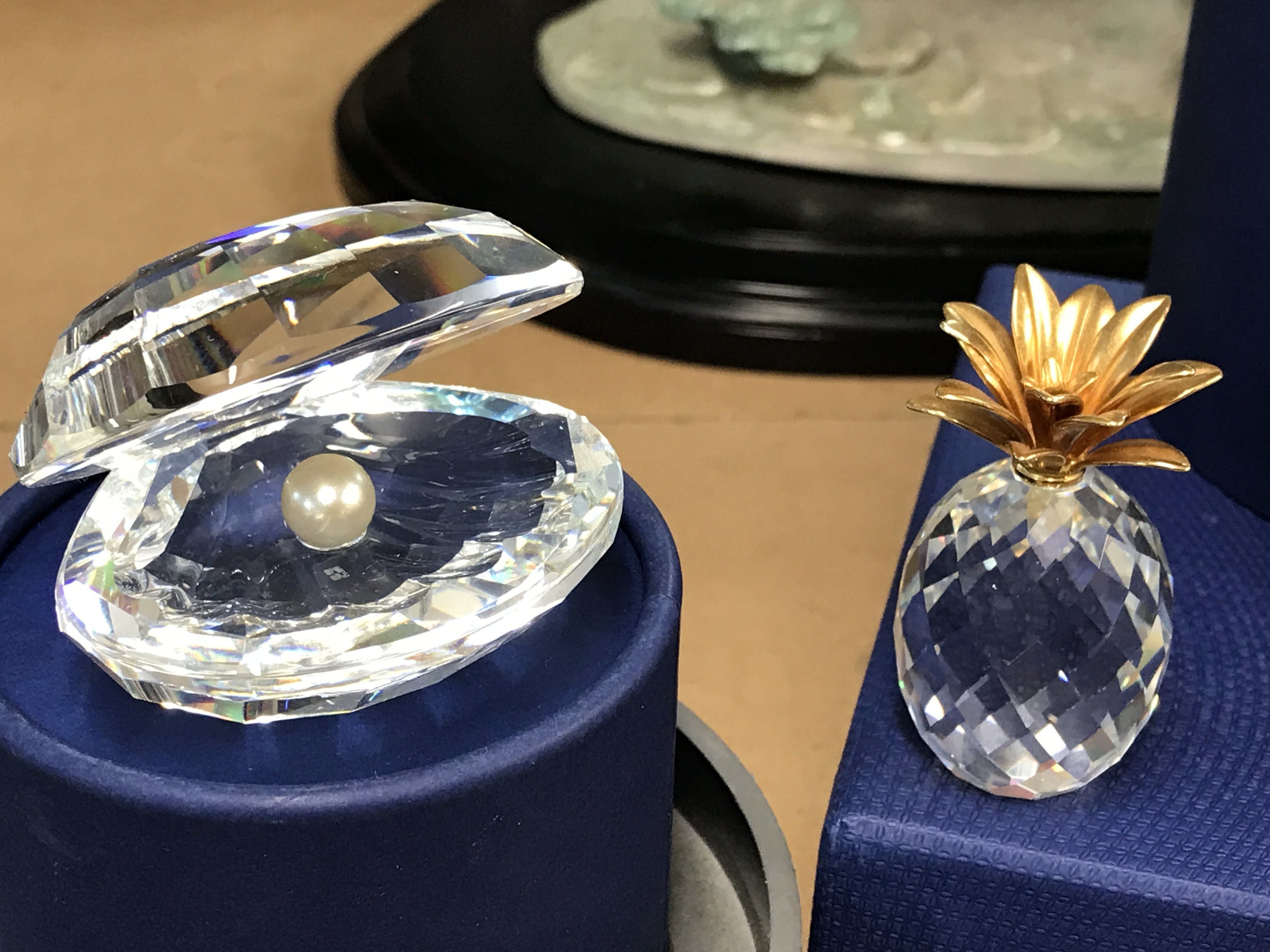 A collection of various Swarovski items including oyster and Pearl, pineapple, heart shaped trinket box with miniature yellow hearts, butterflies, ballet shoes, birthday cake, etc