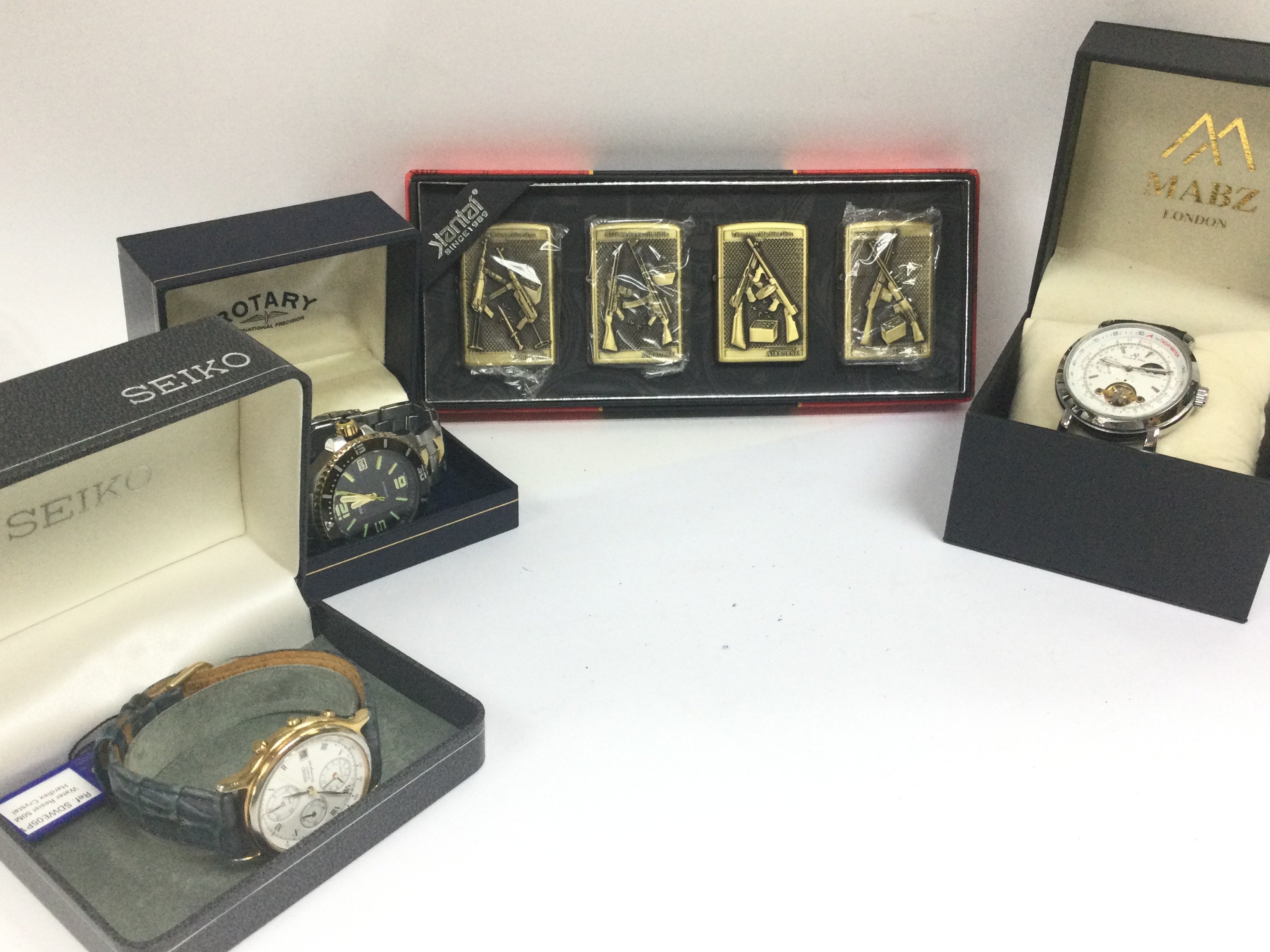 A collection of boxed watches including a Rotary Aquaspeed, Seiko quartz chronograph, Kronen & Sohne and a cased set of novelty Medal of Honour lighters.