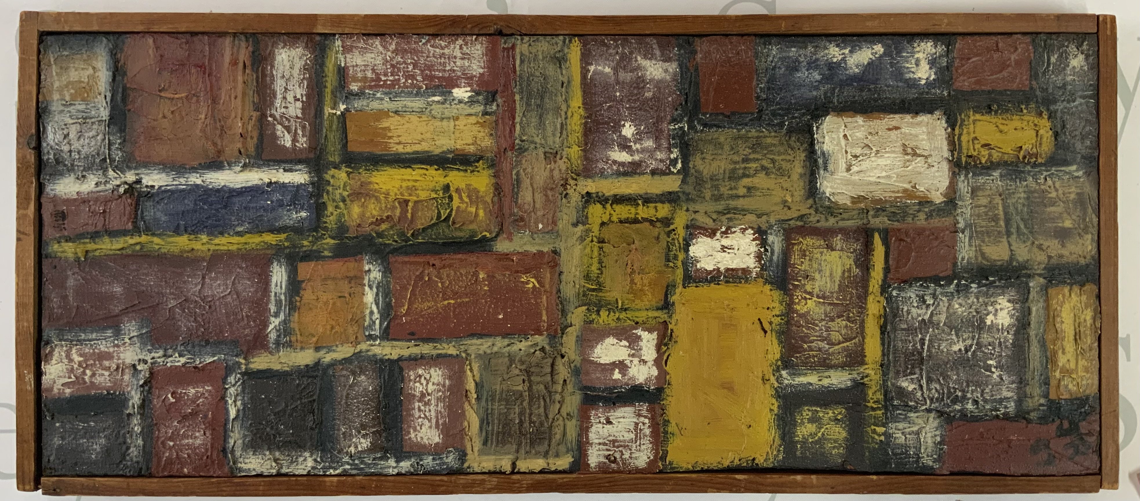 A small abstract acrylic on board painting. (54cm x 23.5cm). (B)